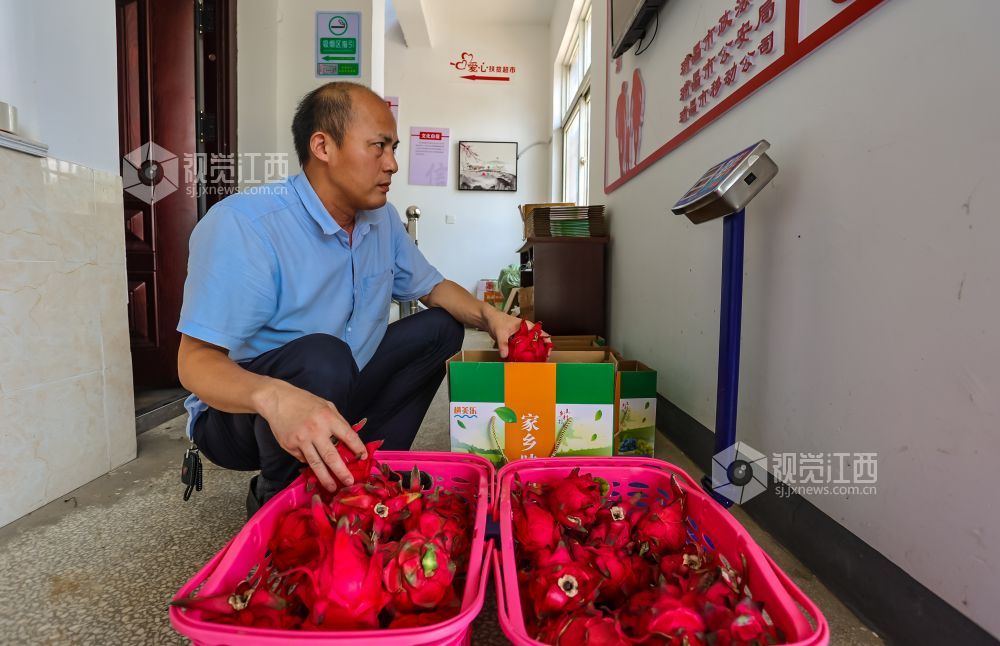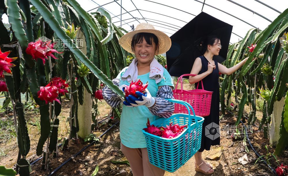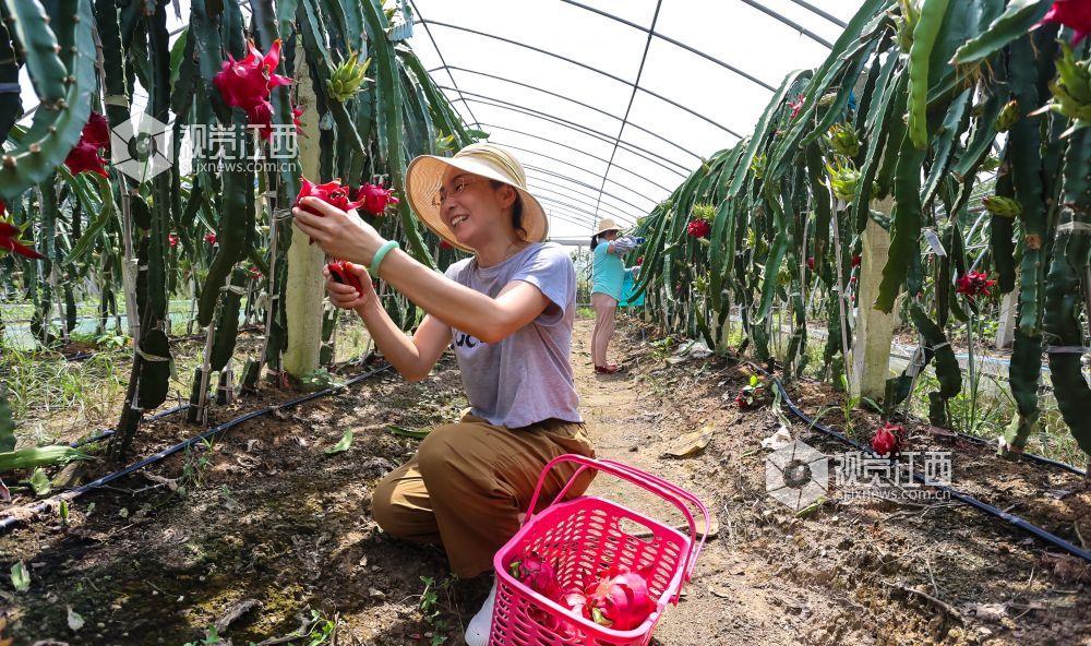 2021年8月23日,江西省瑞昌市横港镇繁荣村火龙果种植基地,村民们正在采收、包装火龙果。