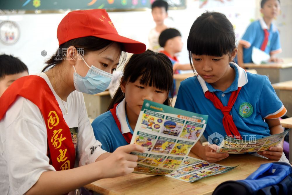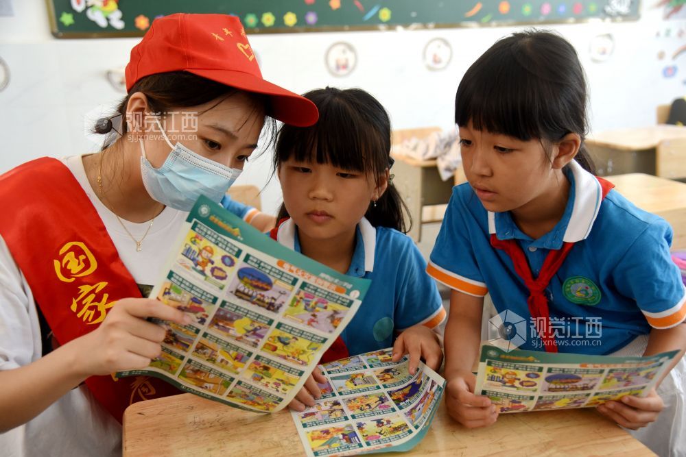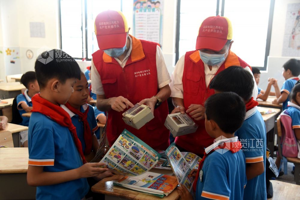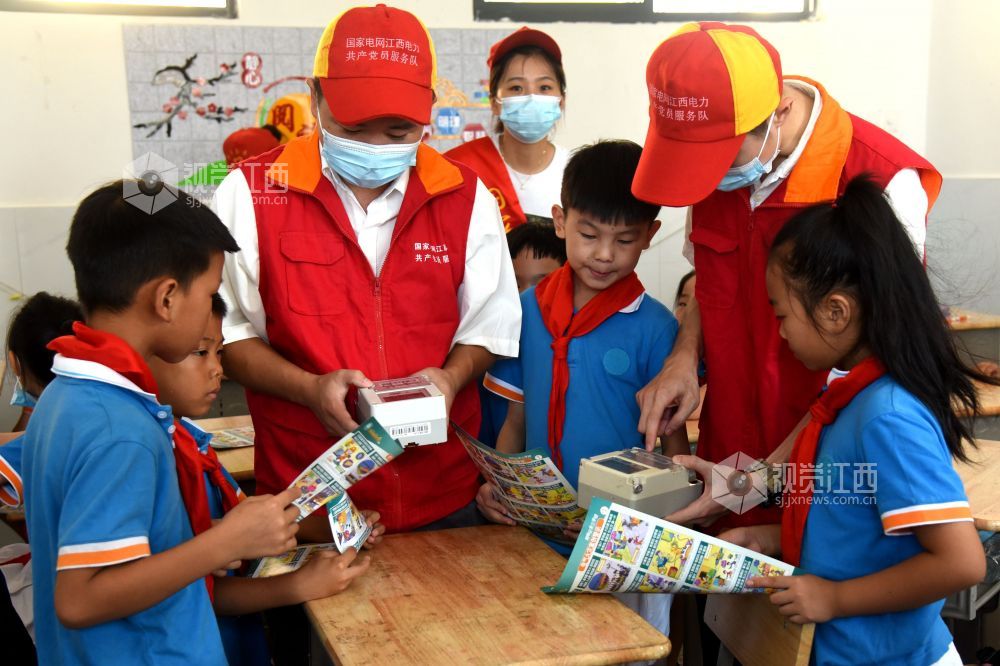 2021年9月1日,开学第一天,在江西省抚州市南丰县嘉禾小学,国网南丰县供电公司共产党员服务队的志愿者们正在给学生上用电安全教育课。