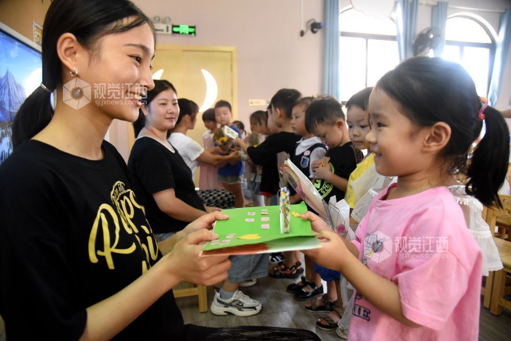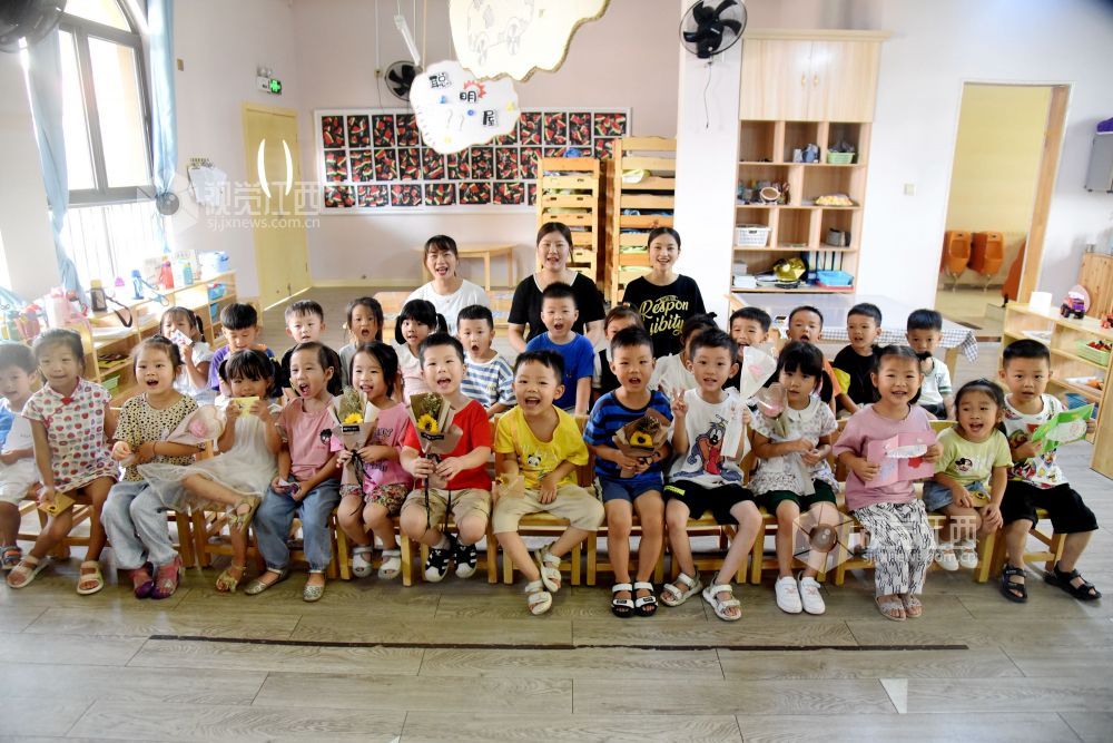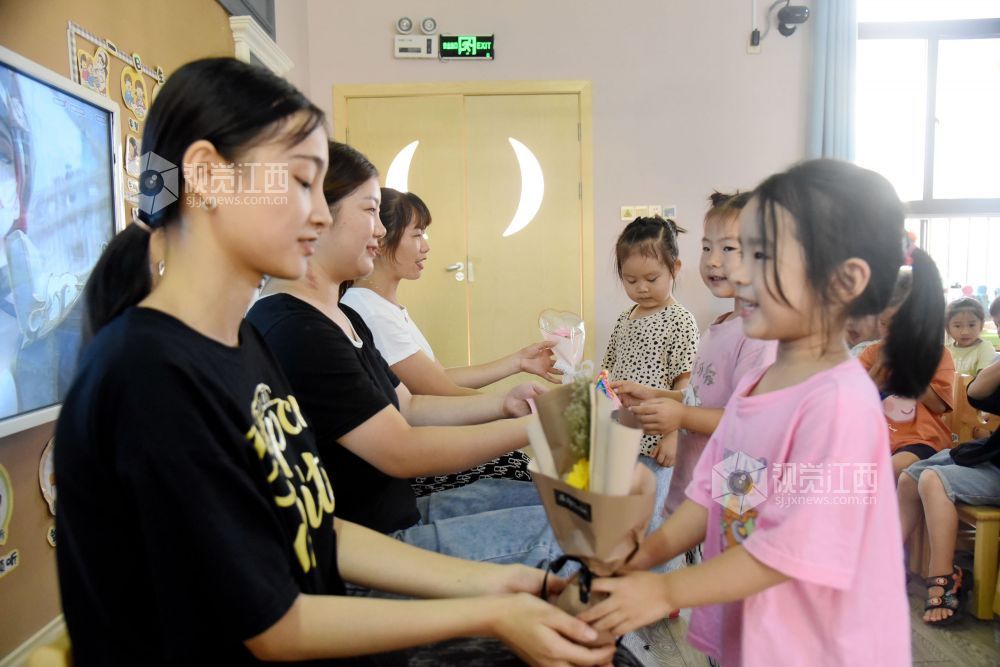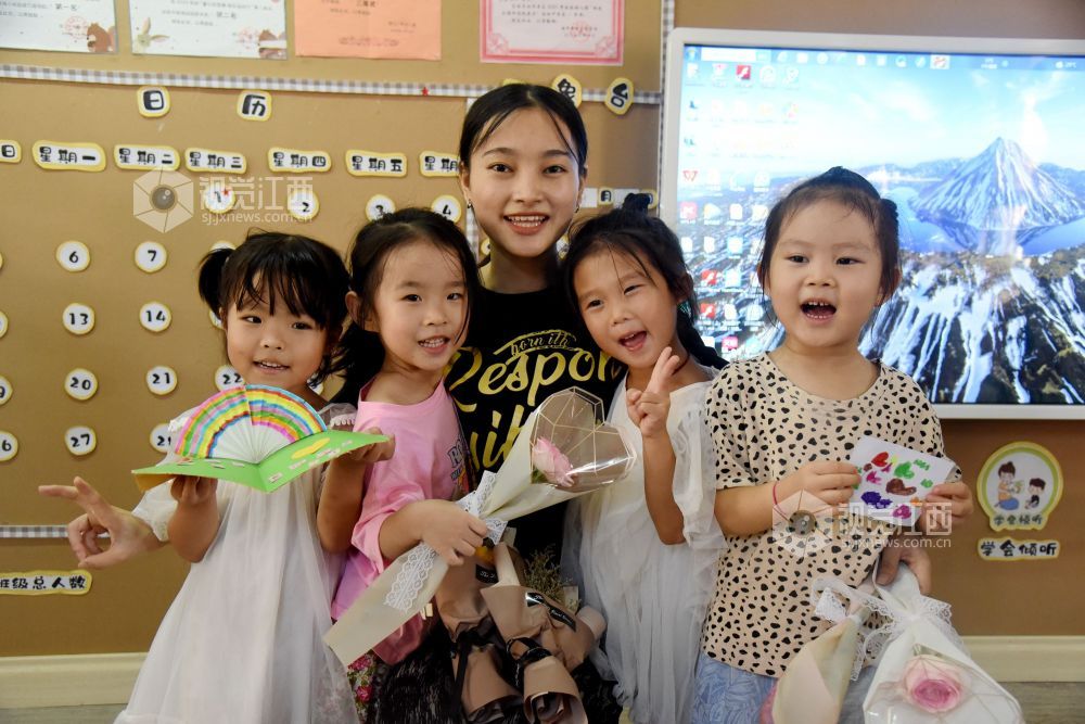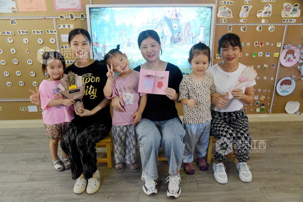 2021年9月9日,江西省抚州市南丰县一幼儿园中(3)班的小朋友将贺卡、鲜花送给老师,祝老师节日快乐。