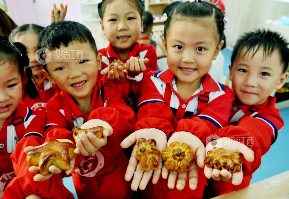 2021年9月17日,江西省德兴市城南幼儿园小朋友,开心将自己亲手制作的童趣月饼准备送去烤制。