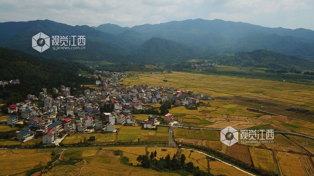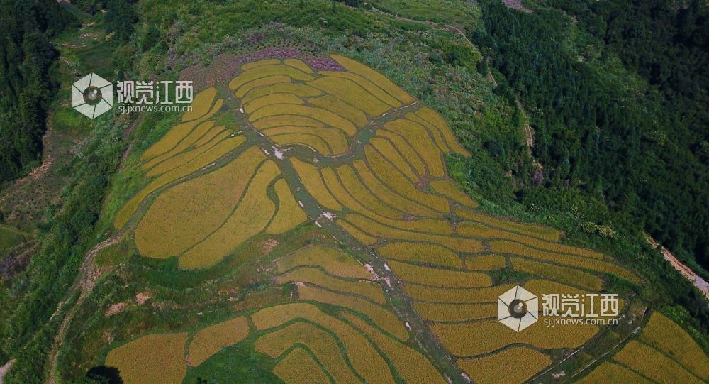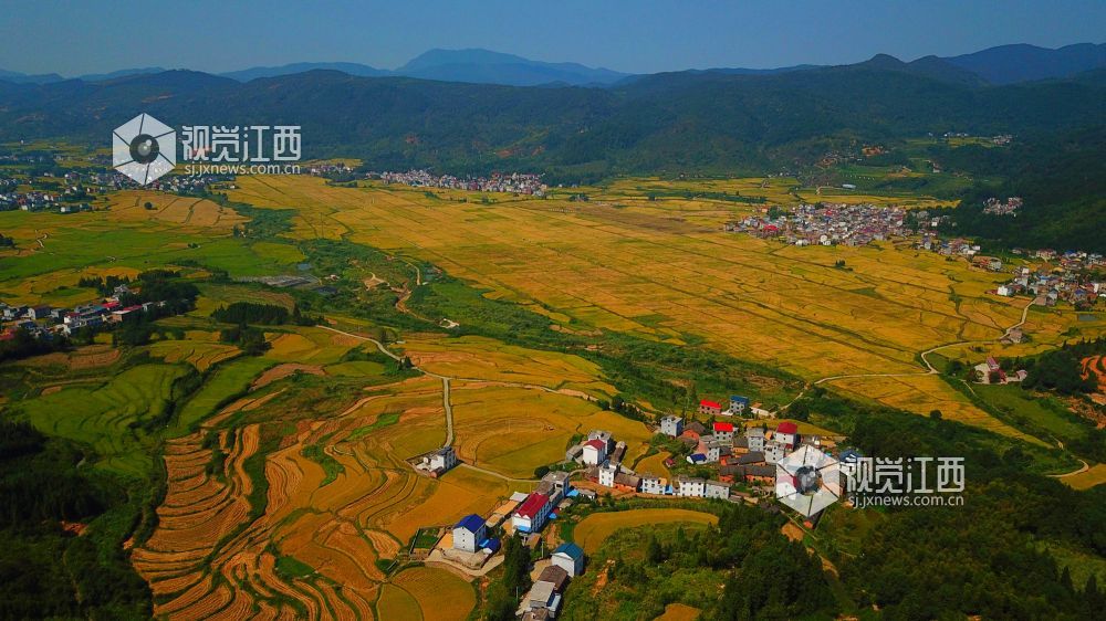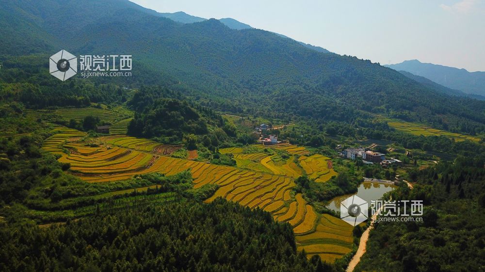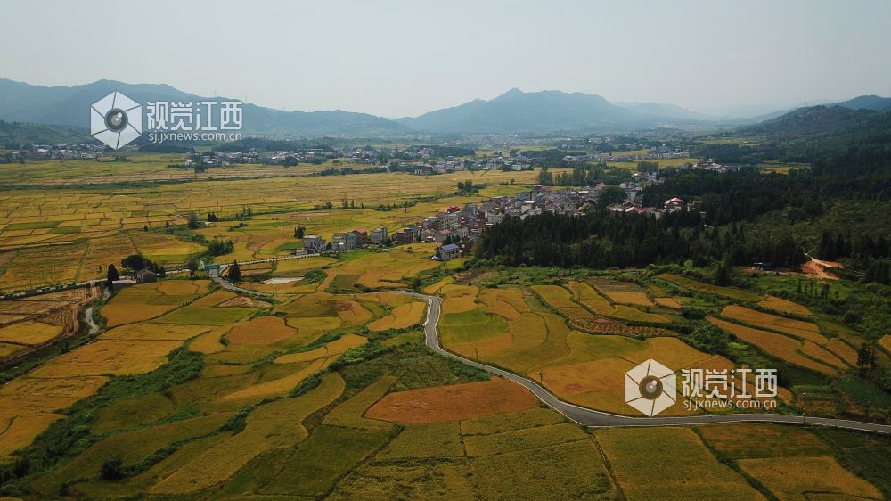 9月16日,江西省莲花县高洲乡朱家村、高滩村田垄一万多亩水稻丰收在望,金灿灿的水稻就像一张铺在田野上的画卷一样,田野里红顶白墙的民居点缀其间显得格外耀眼,泛黄的稻谷与自然的梯田线条勾勒出一幅幅美妙的金秋田野图。