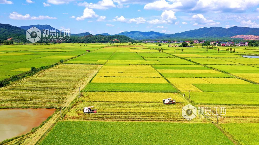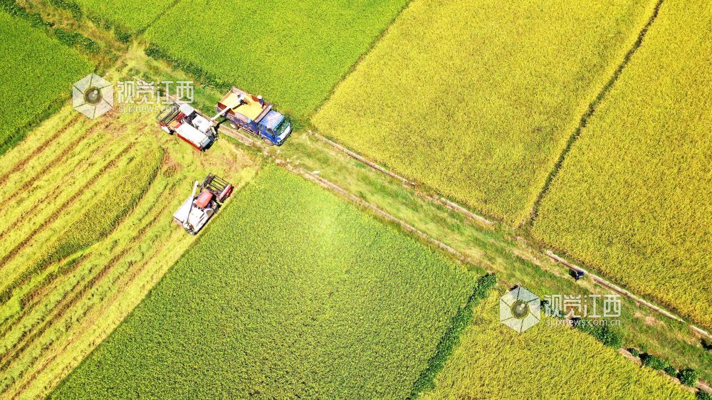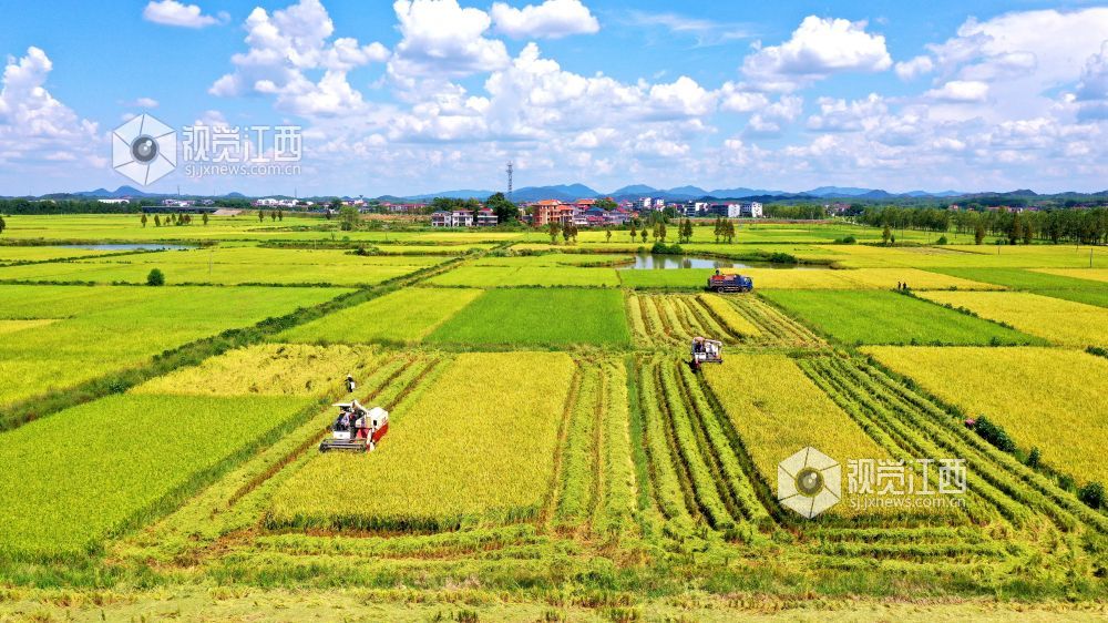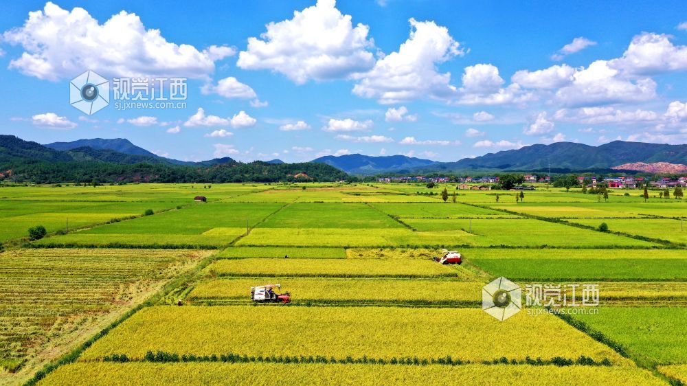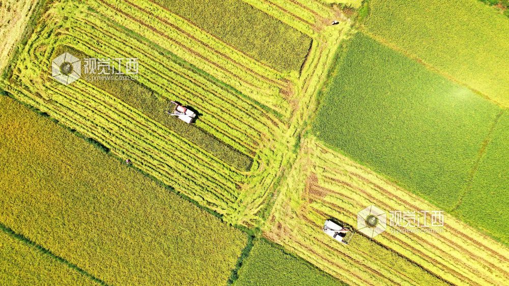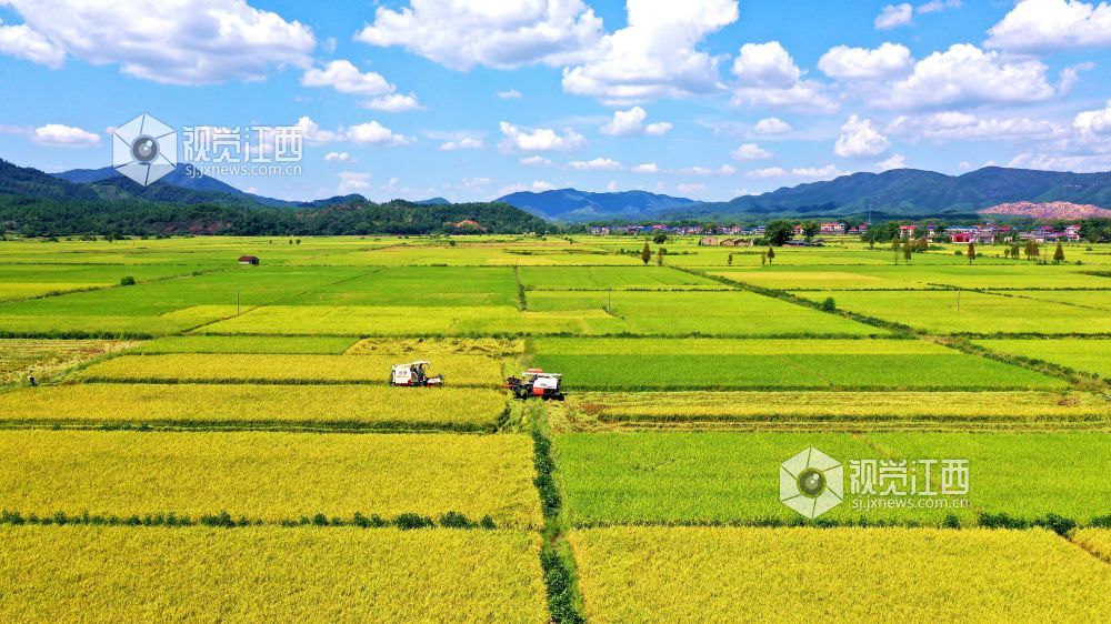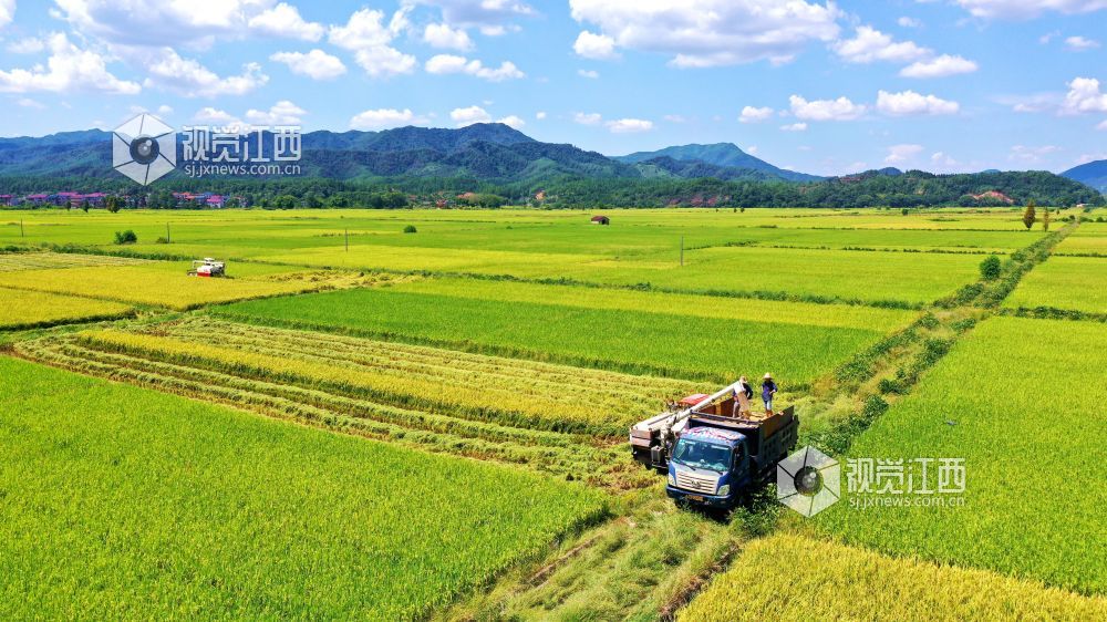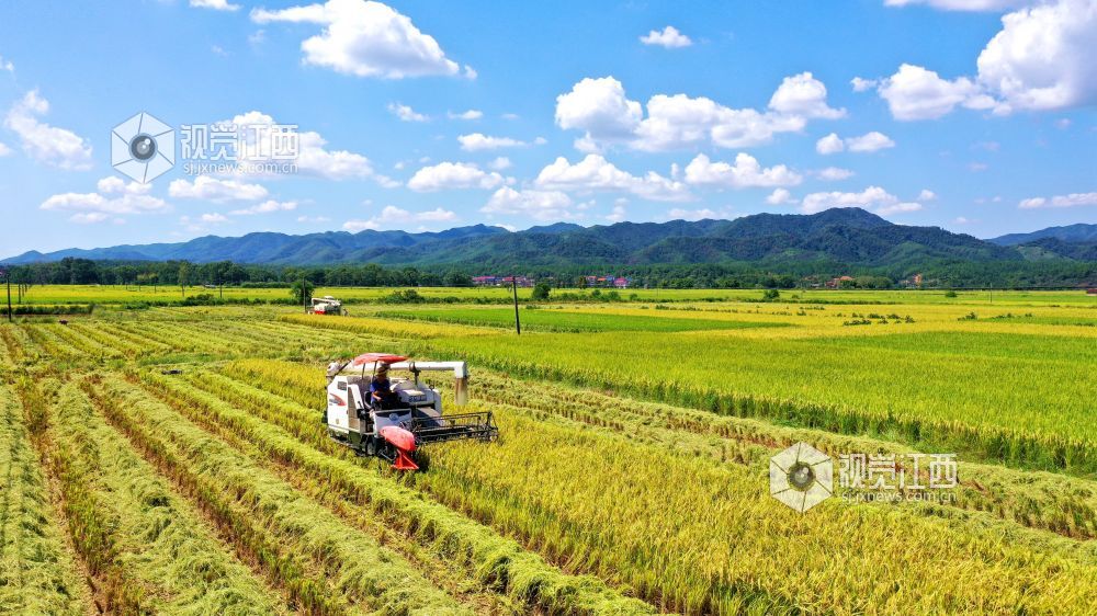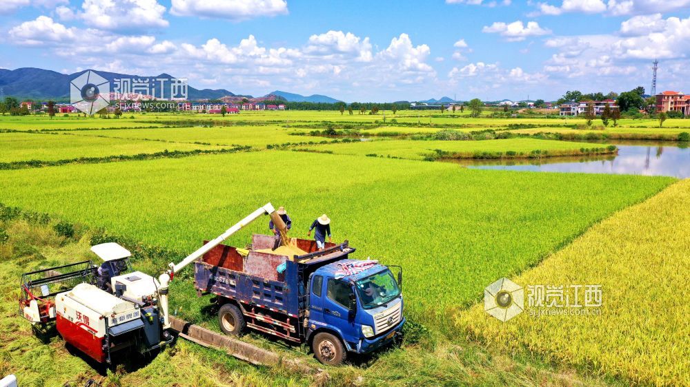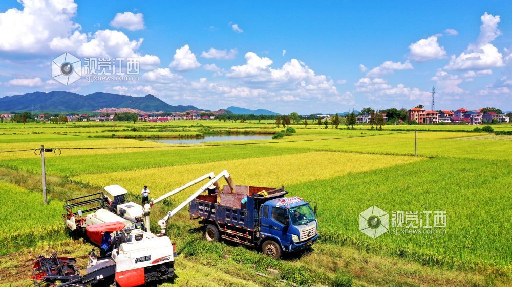 金秋时节,江西省吉水县粮农抢抓晴好天气收割晚稻,确保颗粒归仓。