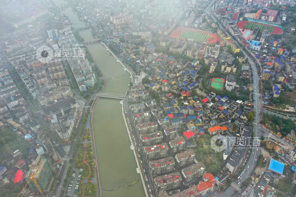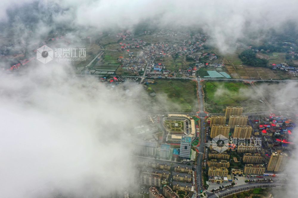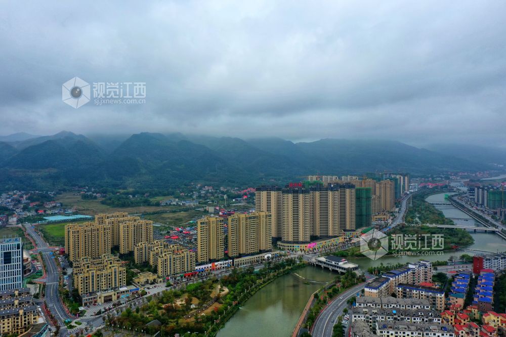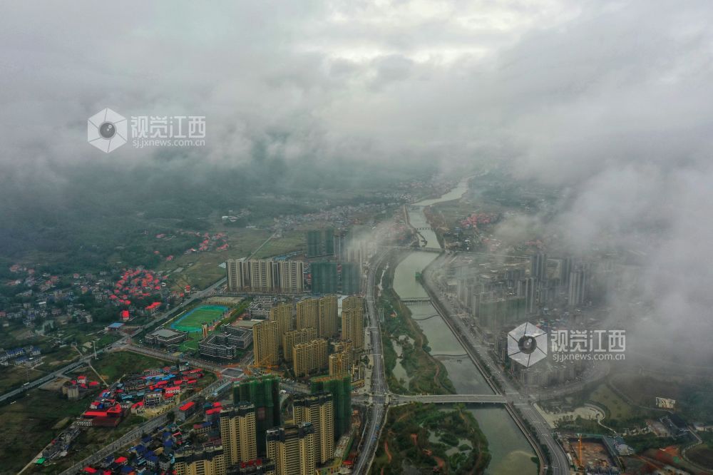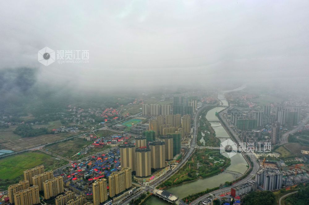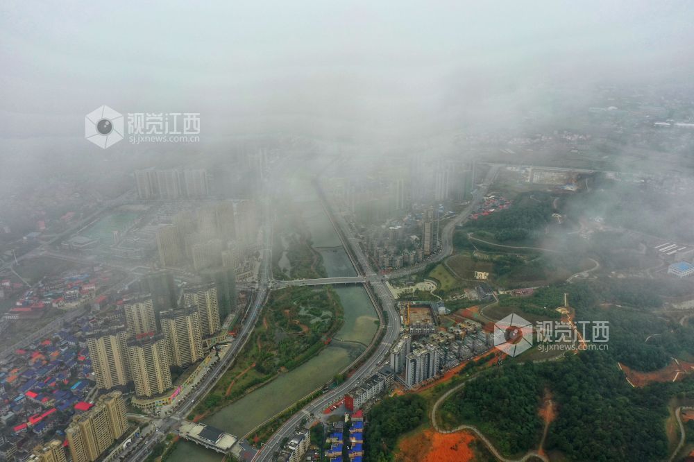 2021年11月6日,大雨过后,无人机航拍江西省萍乡市芦溪县袁河两岸,云雾缭绕,风景美如画。