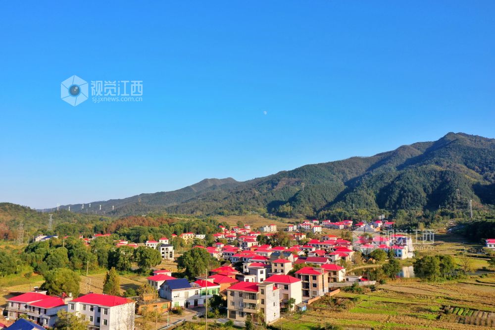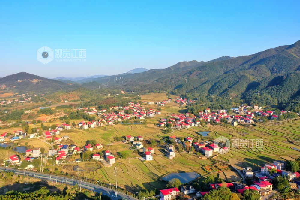 2021年11月14日,在江西省萍乡市芦溪县芦溪镇境内,冬日的暖阳映射着美丽的田园,绿树环村、风景优美,构成一幅初冬田园风景画。