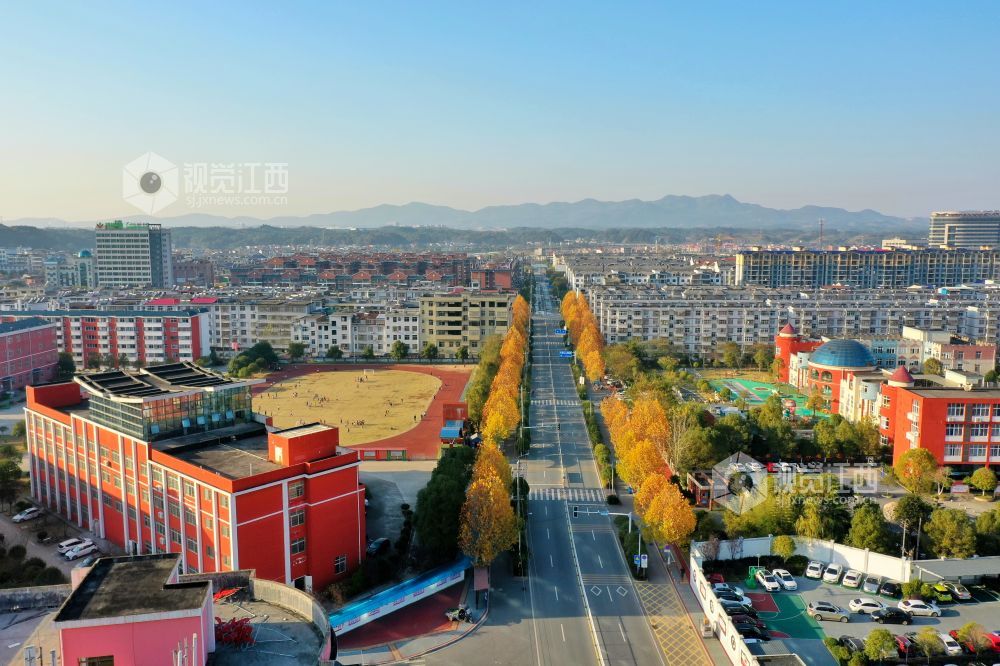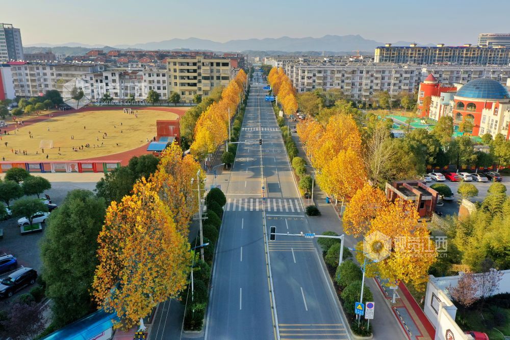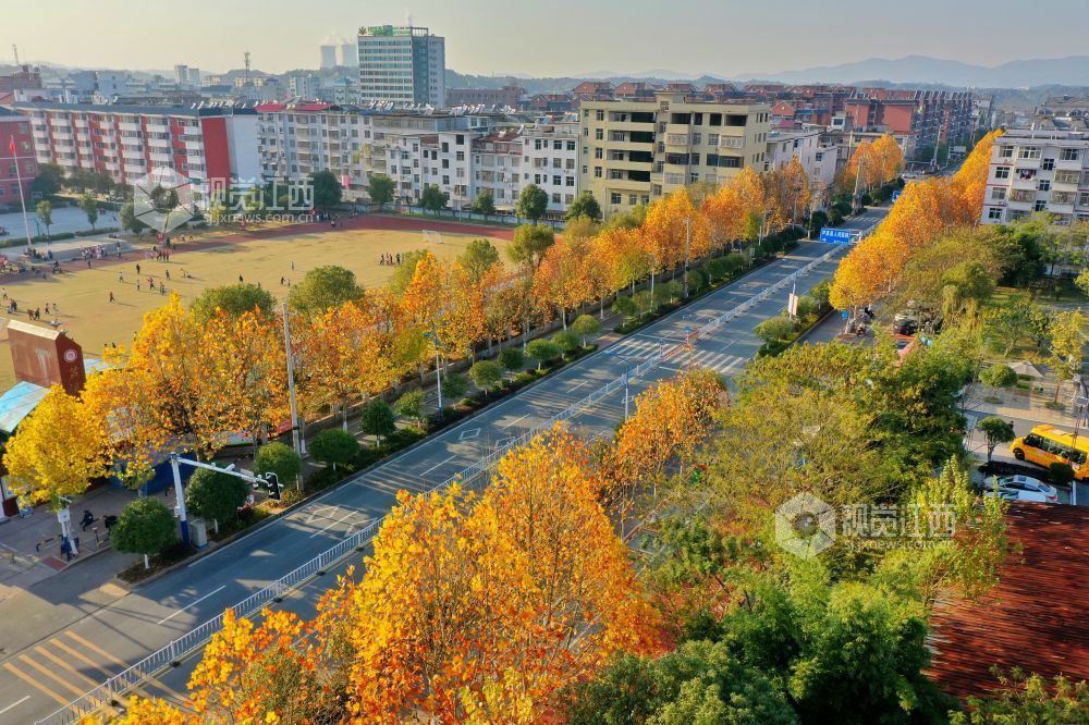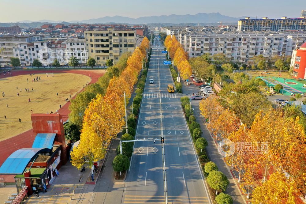 2021年12月2日,江西省萍乡市芦溪县丰泉村,法国梧桐树披上了金黄色外衣,吸引大批市民前来游玩打卡。