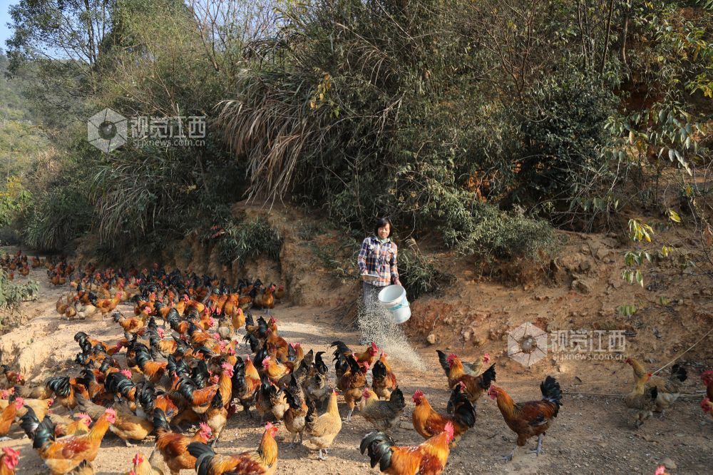 12月11日,江西省莲花县神泉乡神泉村脱贫户刘罗元正在该村养鸡基地喂鸡。