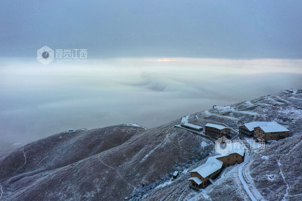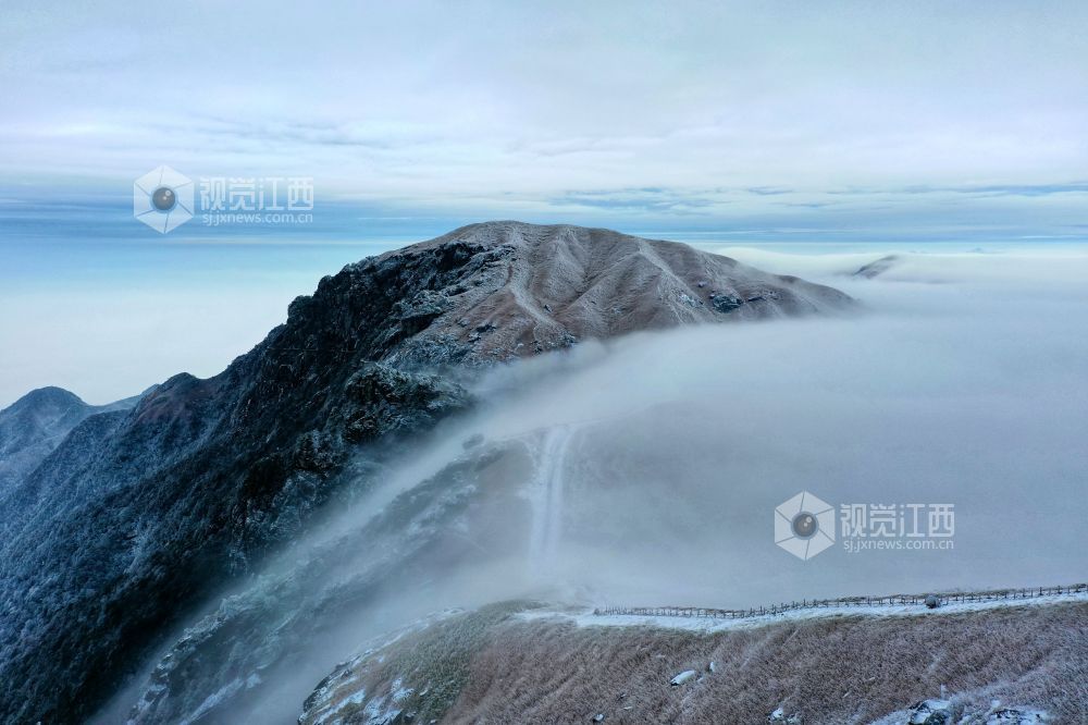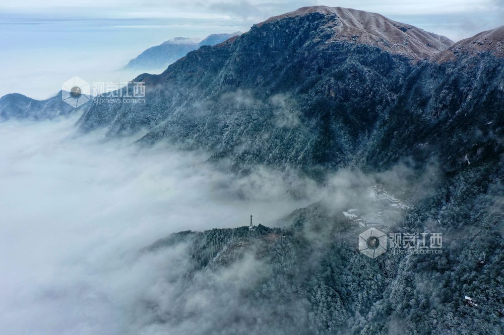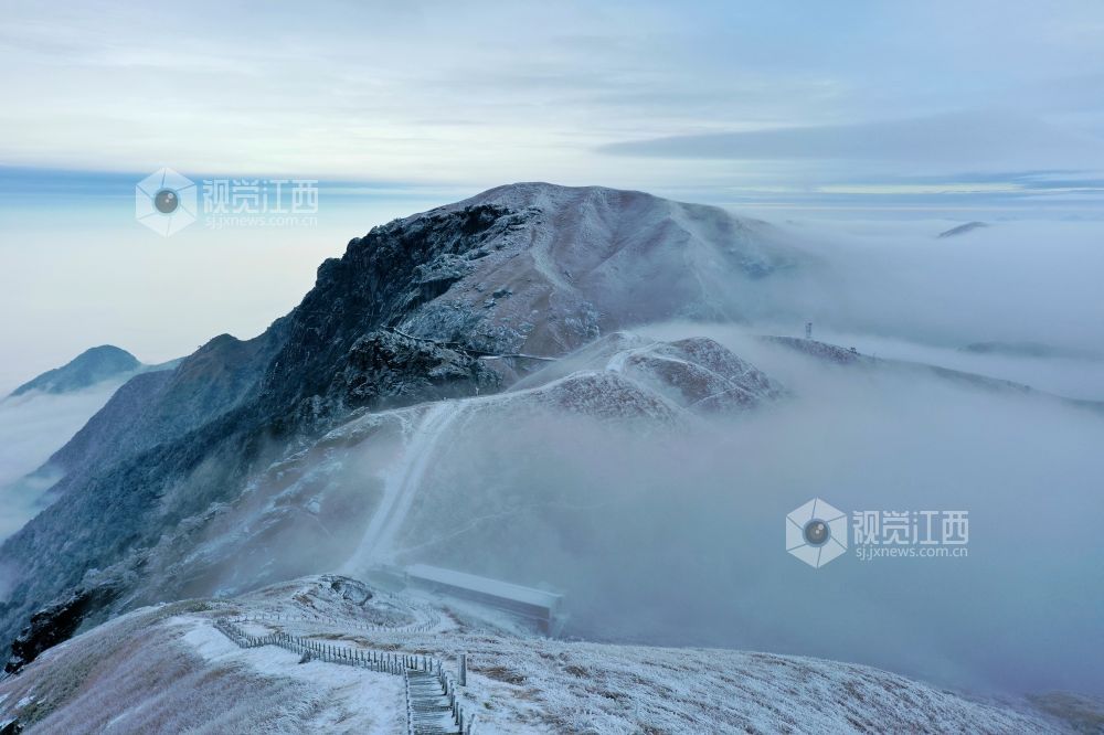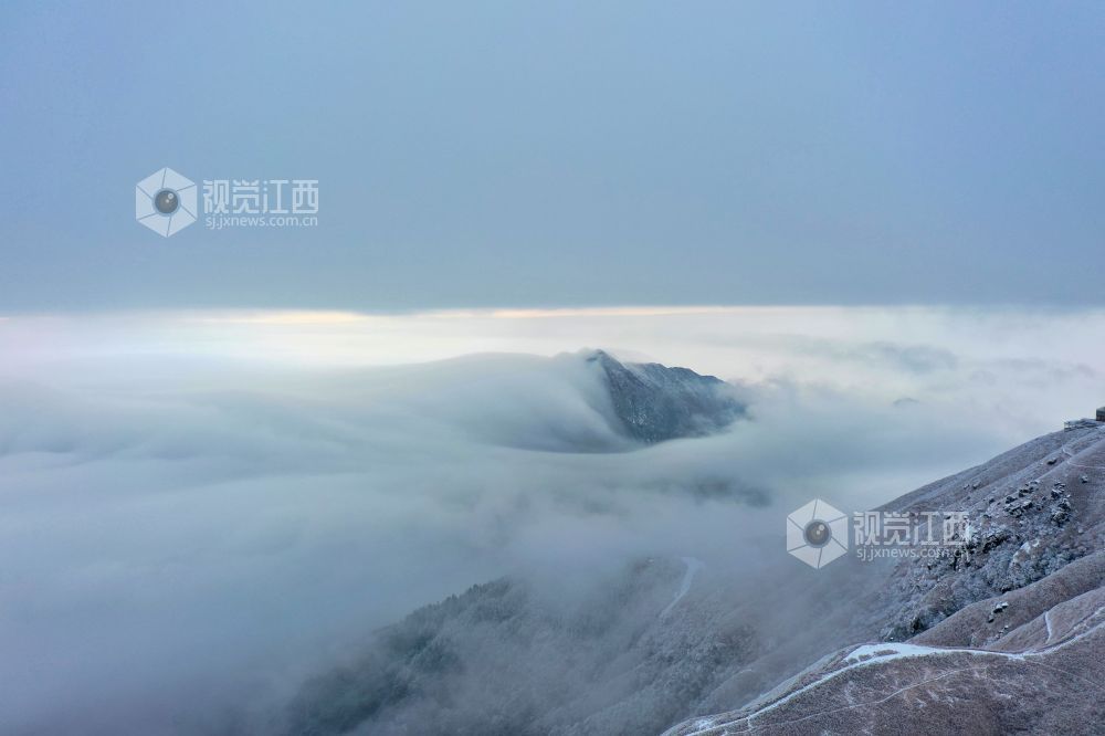 2021年12月27日,江西省萍乡市武功山迎来大范围降雪天气,雪后的山川大地披上银装,云雾缭绕。
