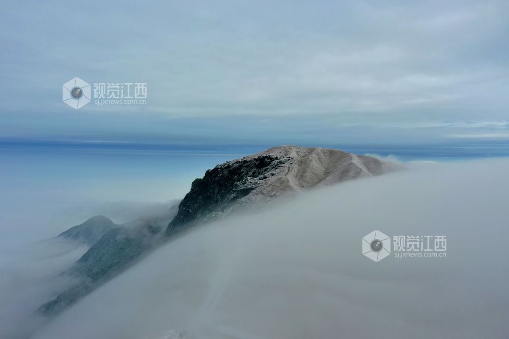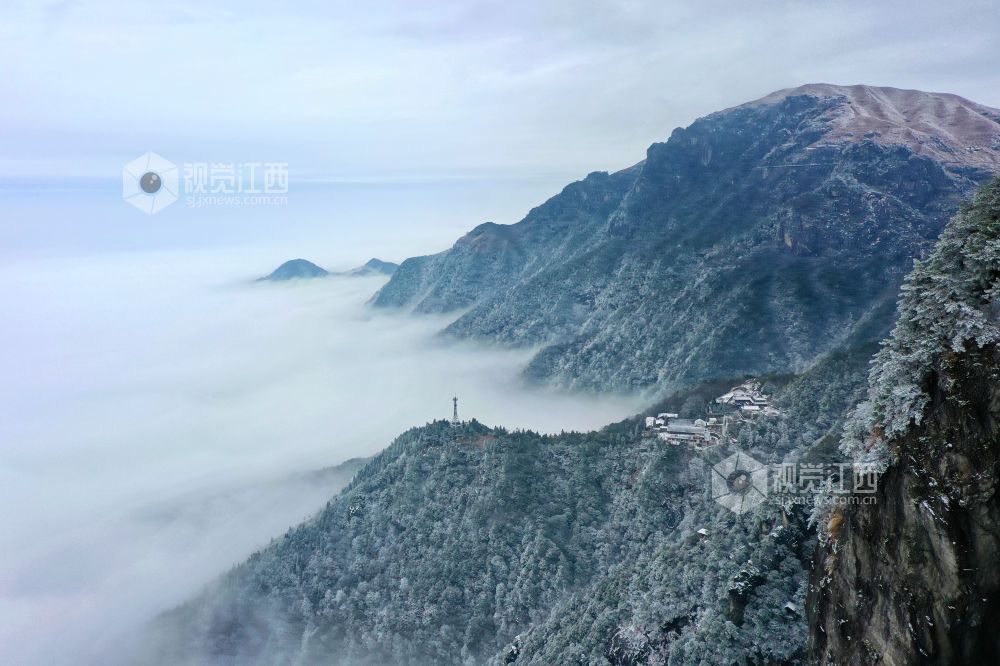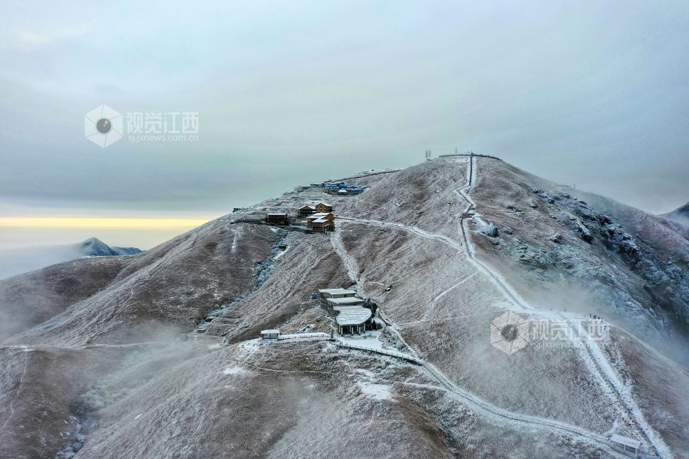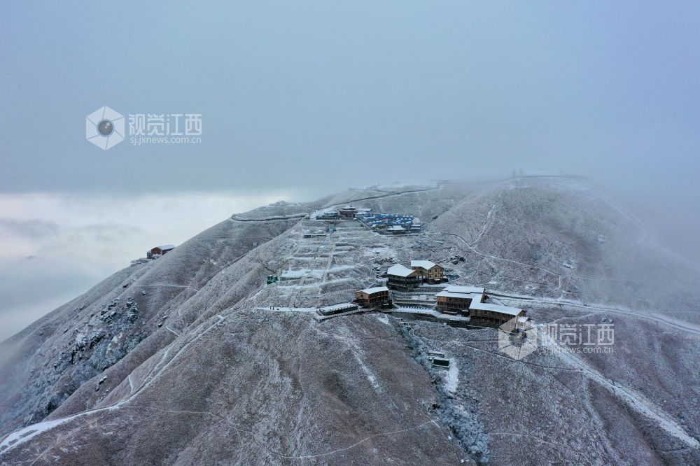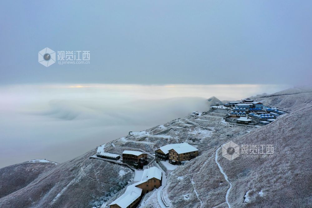 2021年12月27日,江西省萍乡市武功山迎来大范围降雪天气,雪后的山川大地披上银装,云雾缭绕。