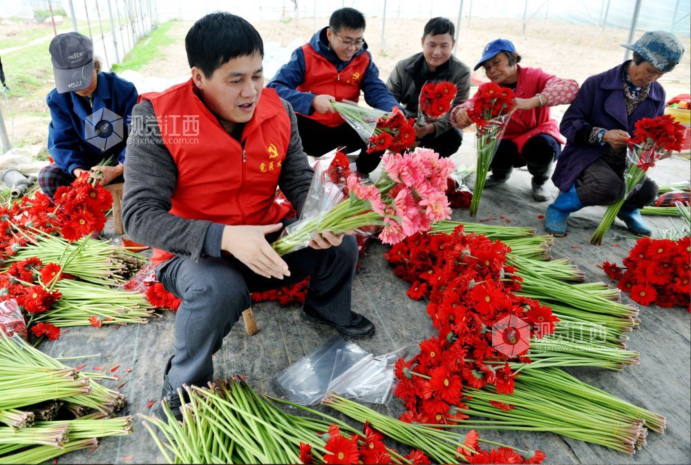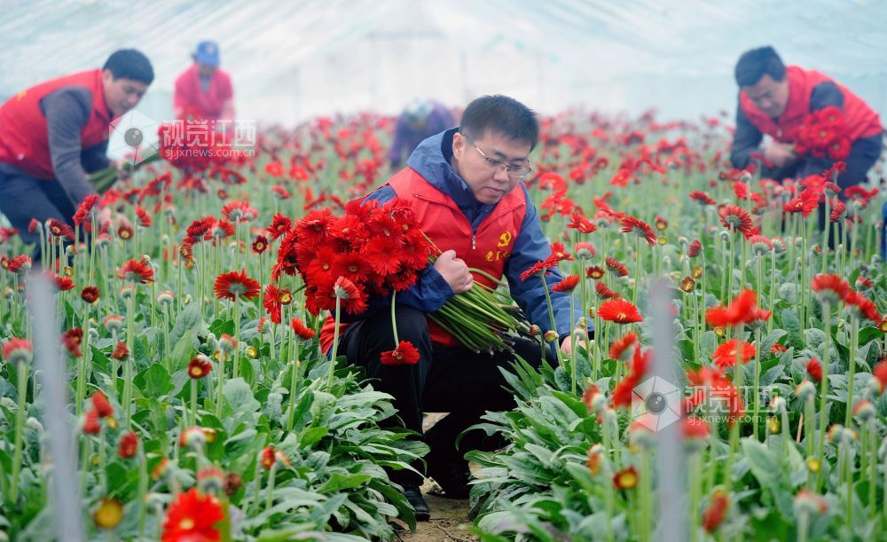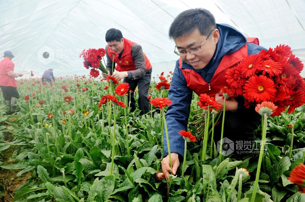 2022年1月4日,江西省德兴市万村乡党员干部正在该乡万村村蒋家大棚花卉基地,帮助花农采摘急需订单新鲜花卉。仅当天,就有数万支不同颜色的非洲菊打包销往杭州。