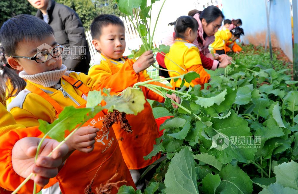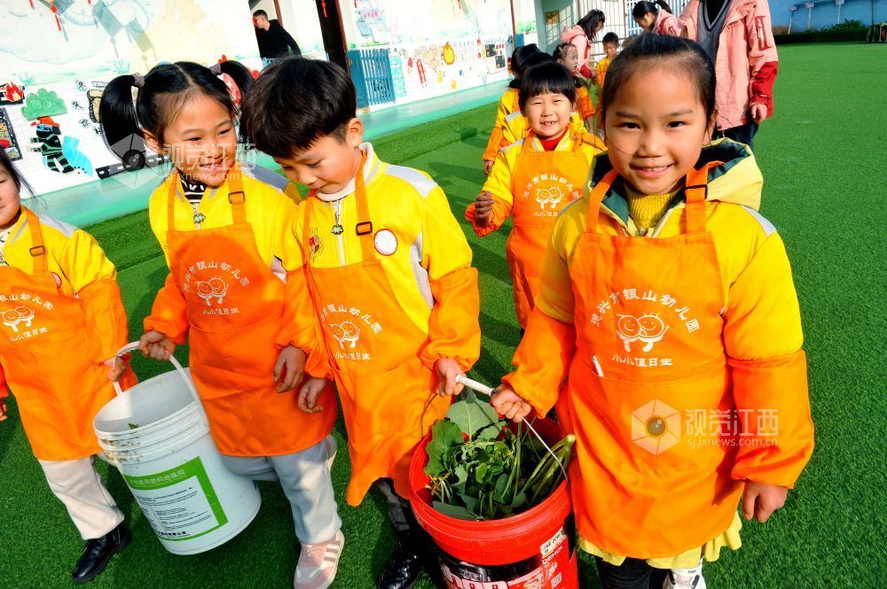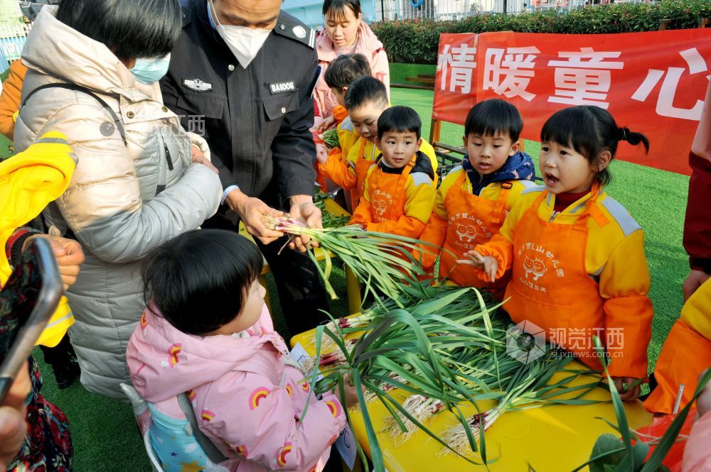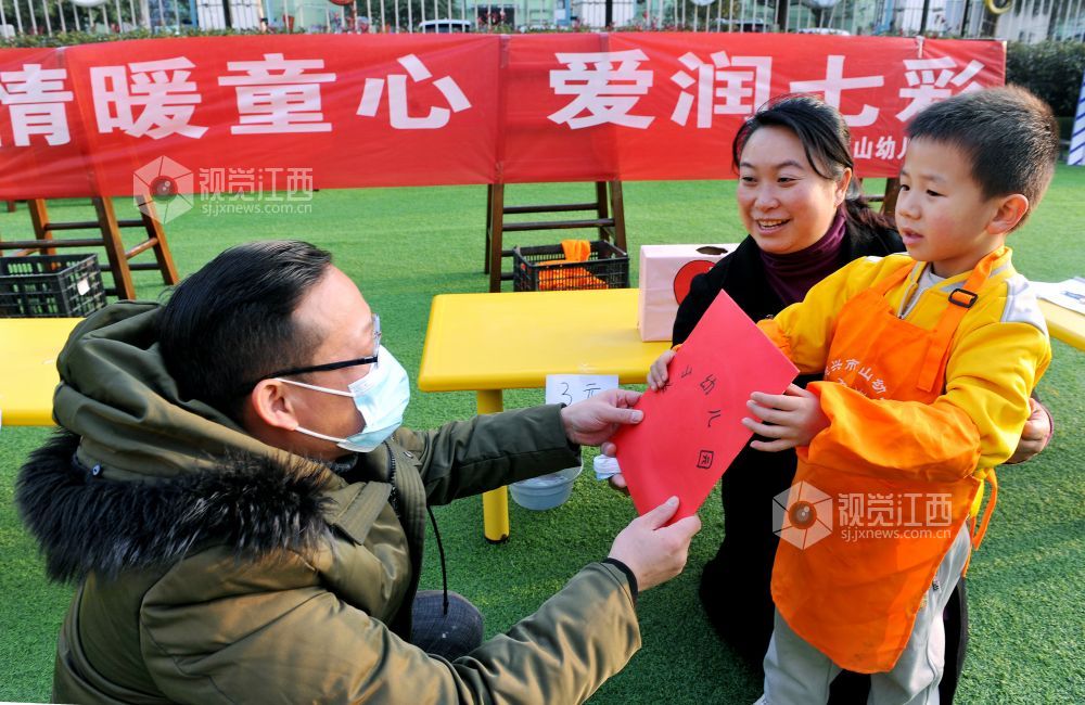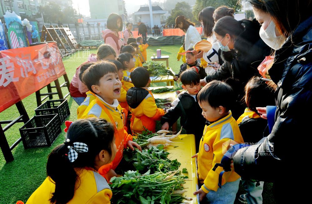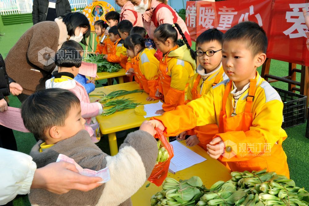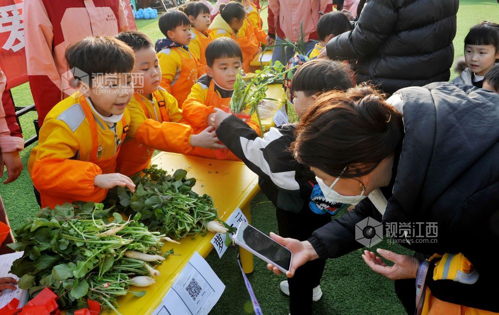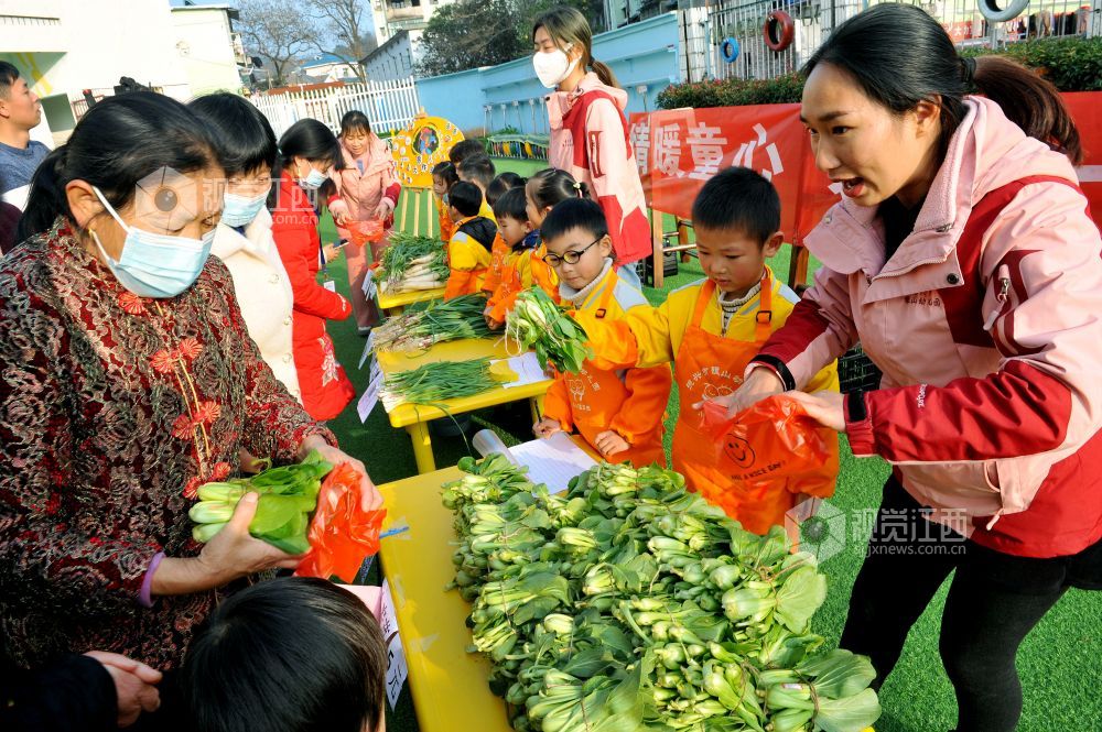2022年1月11日,江西省德兴市银山幼儿园大中班的小朋友正在园内“摆摊”,为身患重病的同学义卖自己亲手种下的蔬菜。