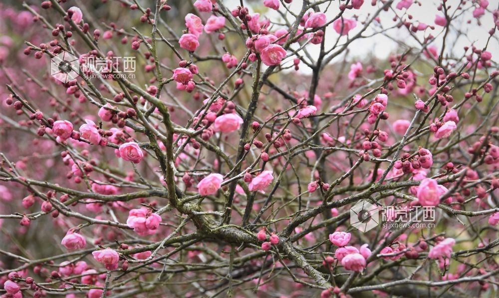 2022年2月5日,江西省鄱阳县一公园内梅花盛开,为湖城增添了亮丽的美景。