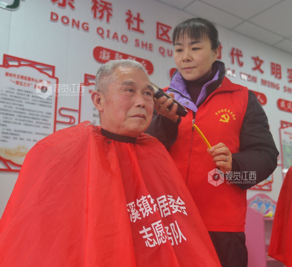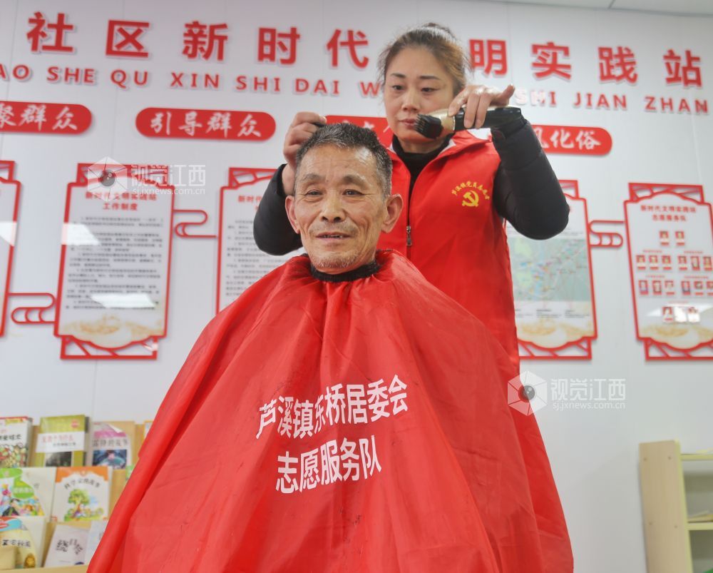 2022年2月18日,江西省萍乡市芦溪县芦溪镇东桥社区,社区党员志愿服务队正在免费为老年人理发。