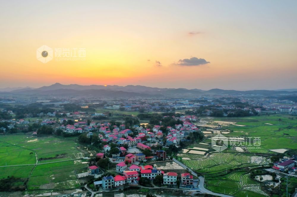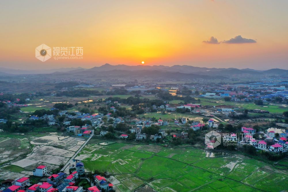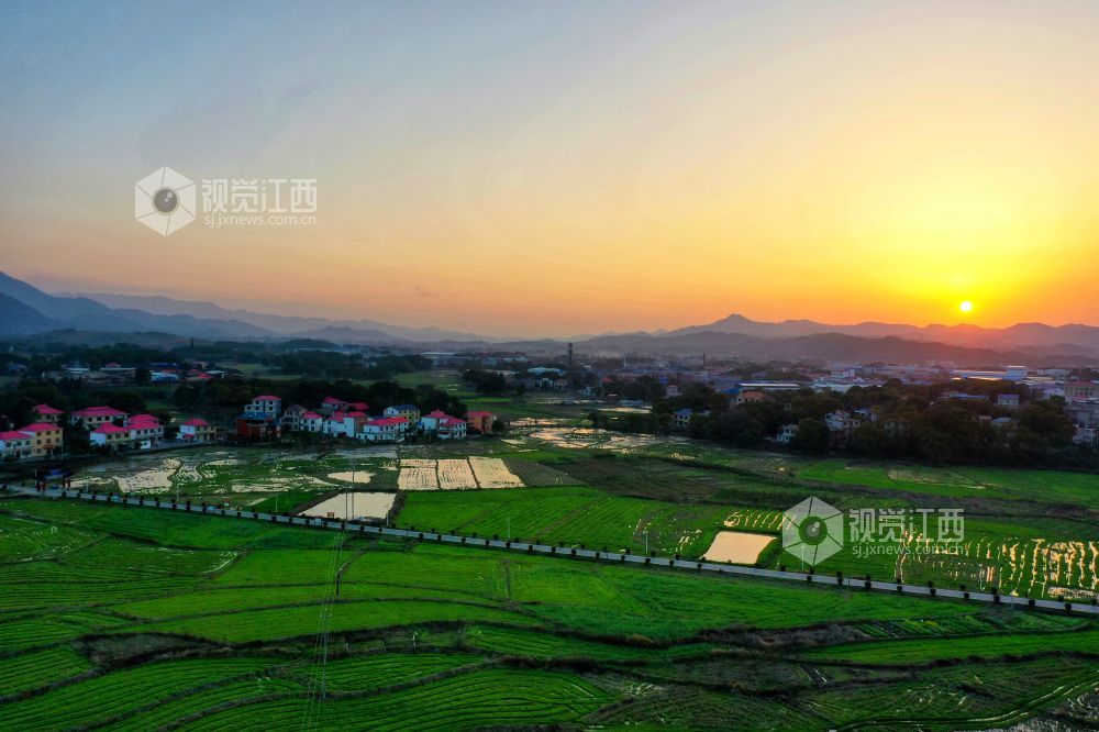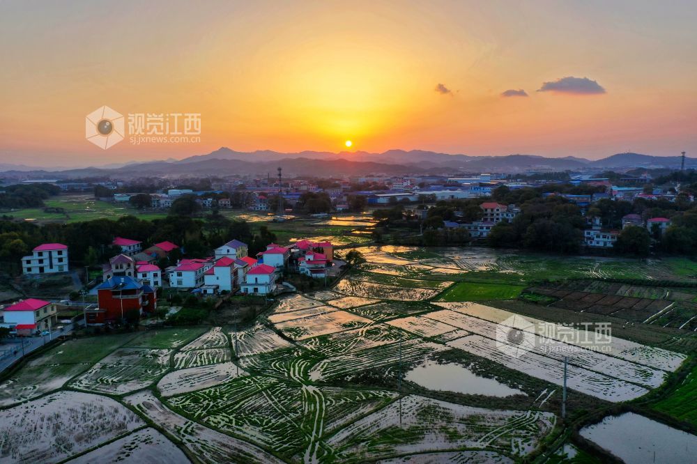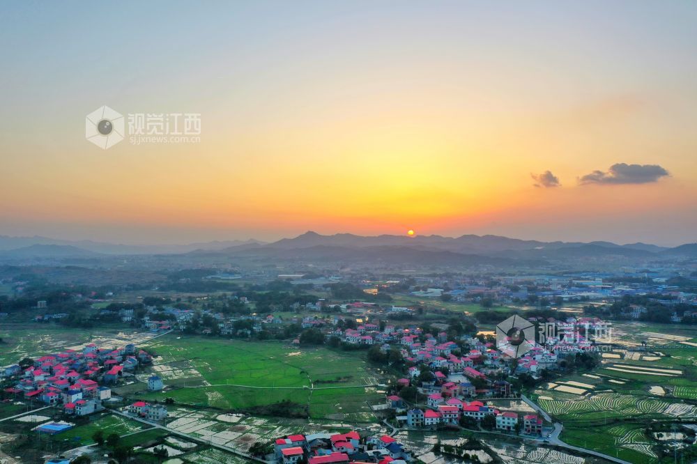 2022年3月7日,江西省萍乡市芦溪县芦溪镇潭田村一带日落夕阳唯美如画。当日傍晚,天空上出现日落夕阳的醉人美景,将春日里的乡村洒下了一层缤纷绚丽的色彩,分外夺目,美不胜收。