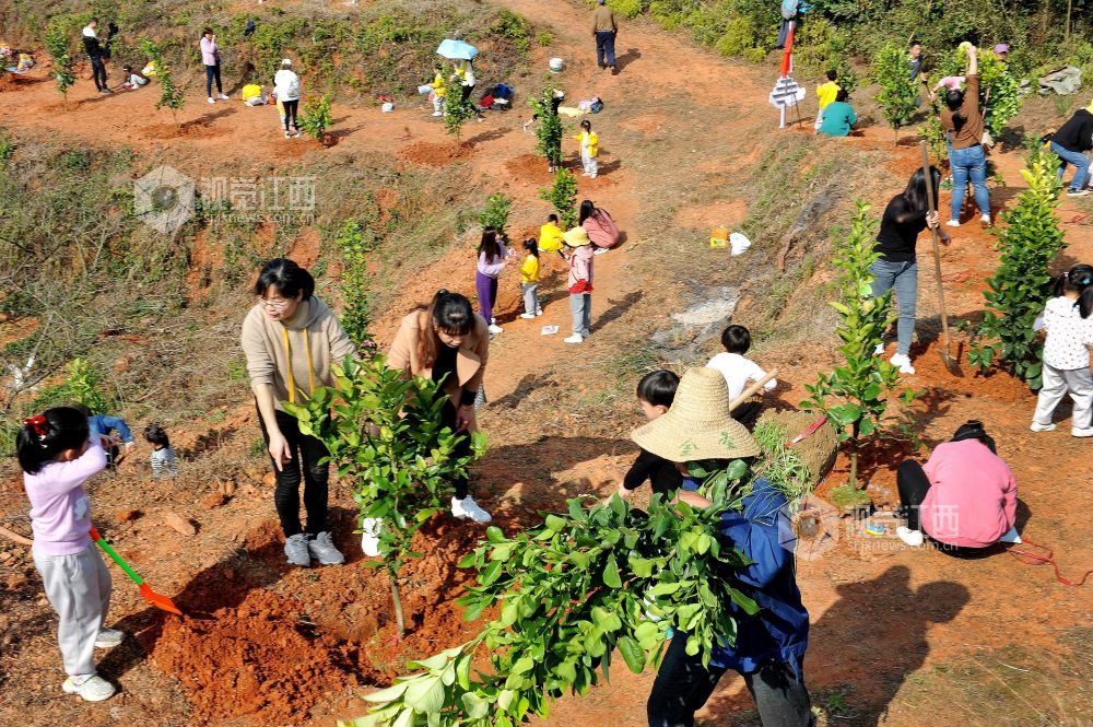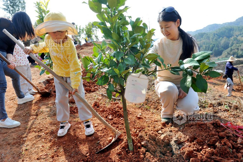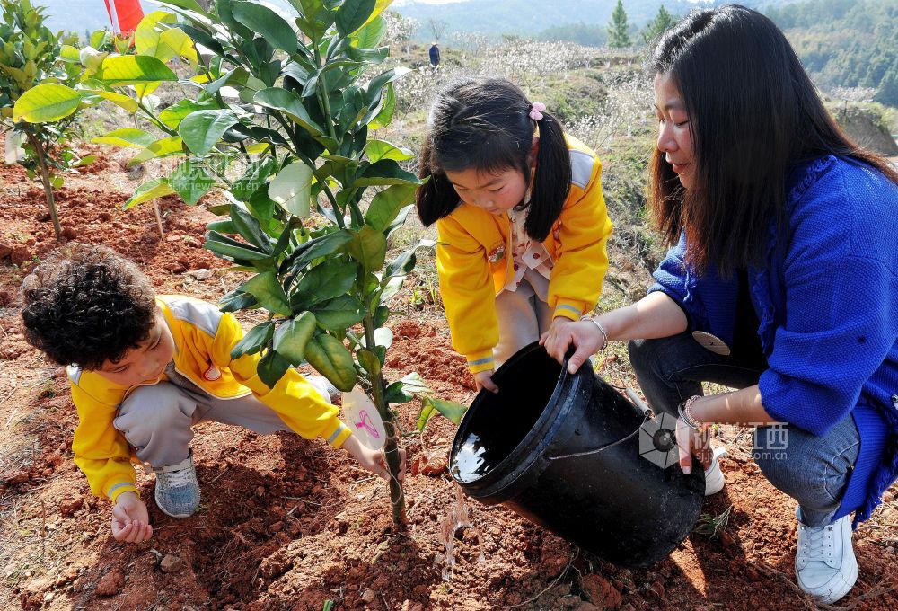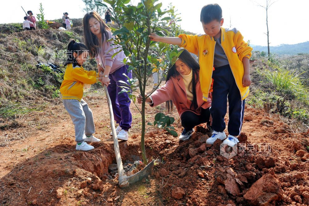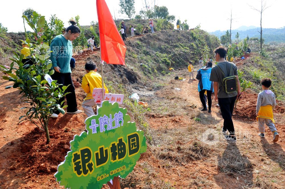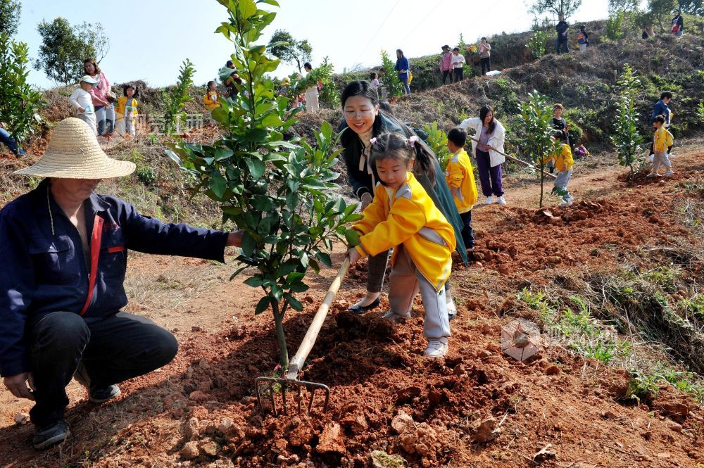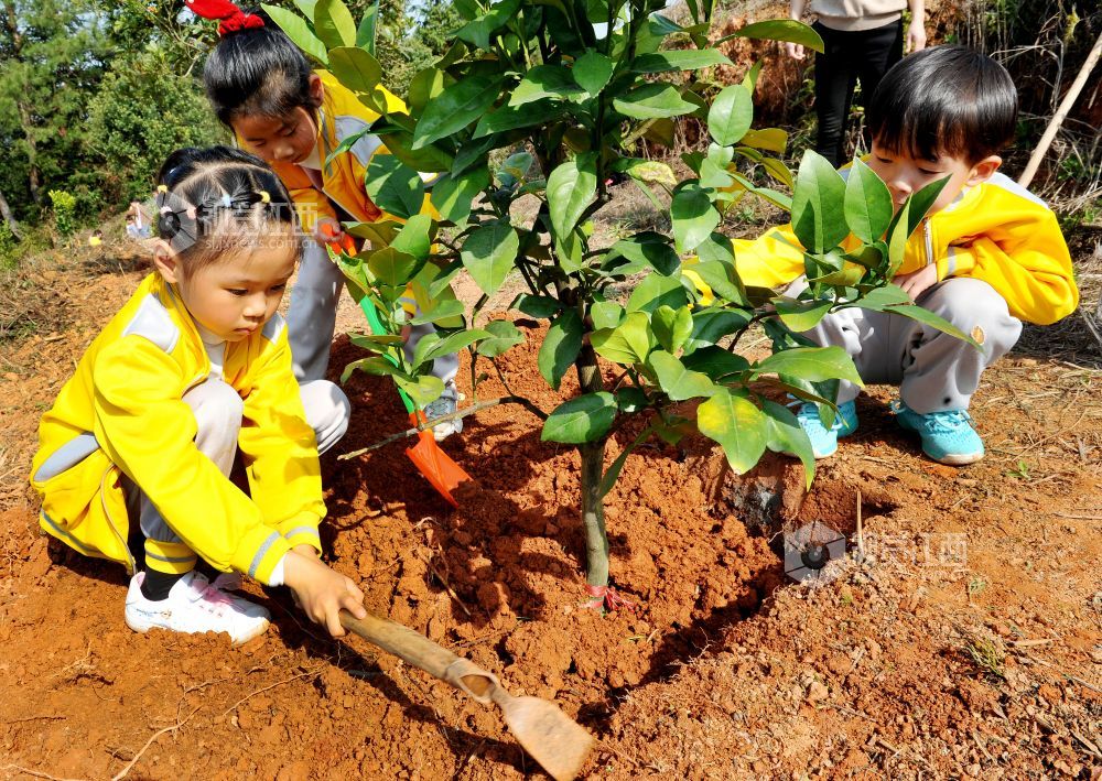 植树节前夕,江西省德兴市银山幼儿园组织大班的小朋友来到当地楼上楼乡村观光园山坡上,开展了一次亲子植树活动。30余名小朋友在家长和农民伯伯的帮助下,亲手种下和认养了一棵棵柚子树,旨在培养孩子们从小认知自然、热爱环境、呵护家园。