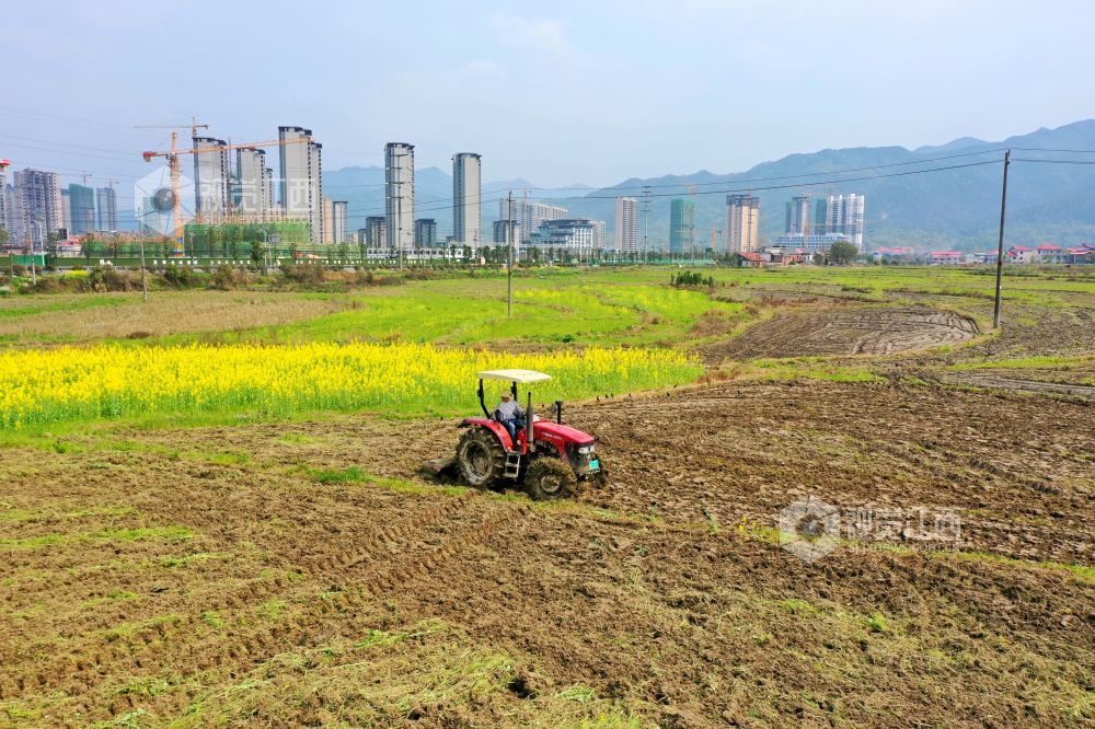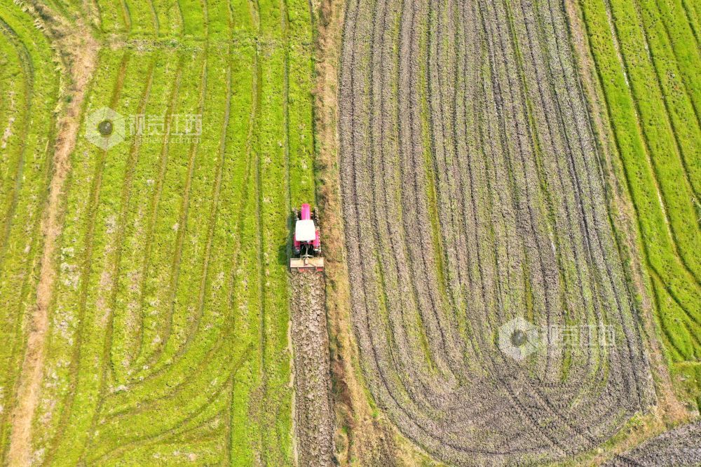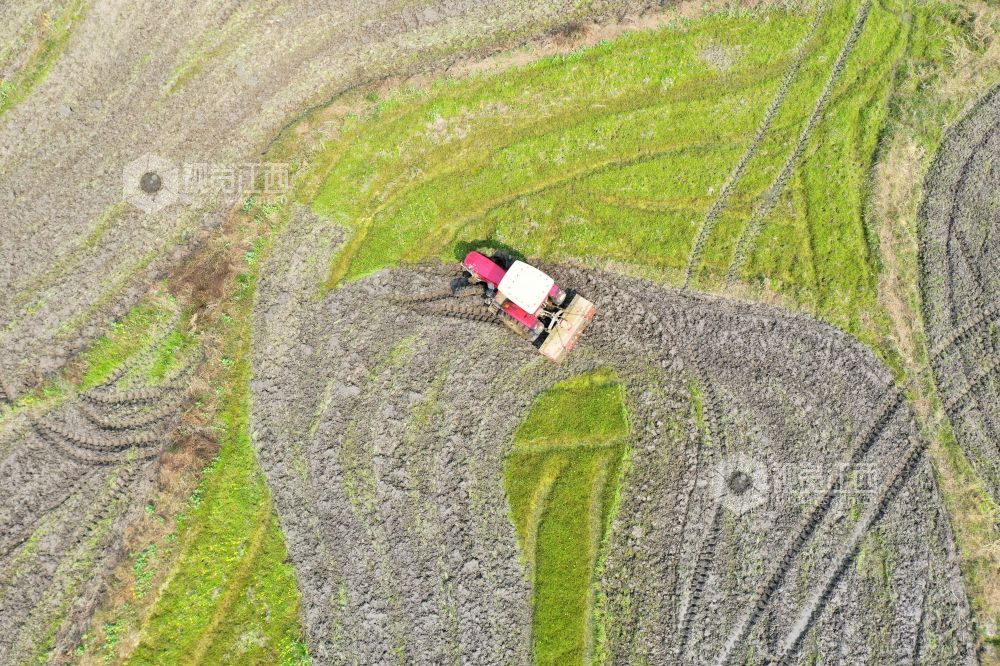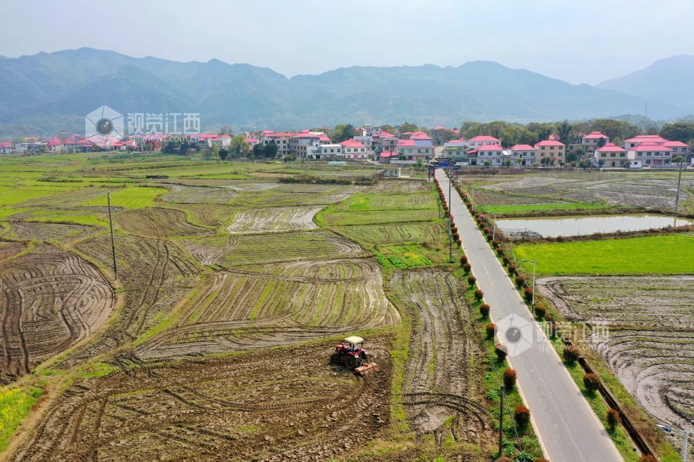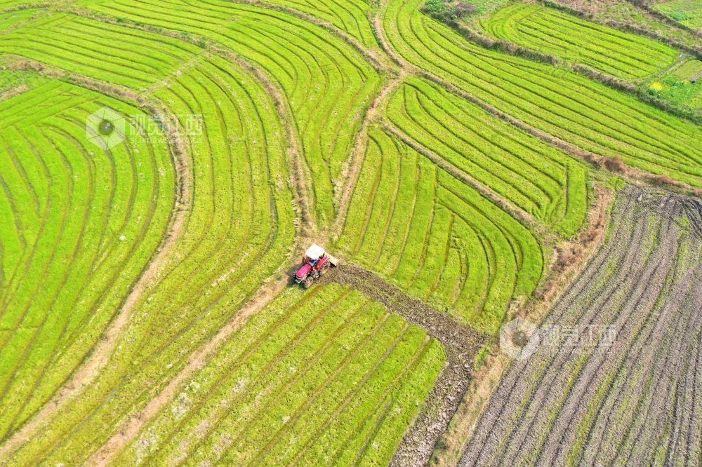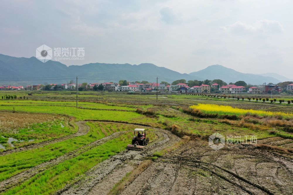 2022年3月14日,江西省萍乡市芦溪县芦溪镇潭田村田园里拖拉机在翻耕农田、村民在忙碌劳作。