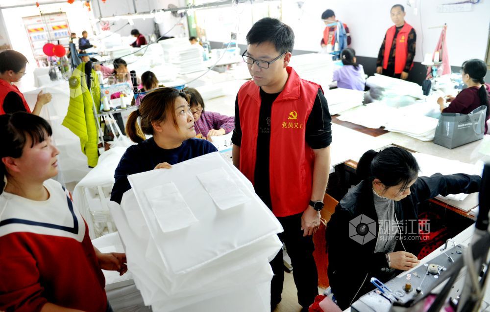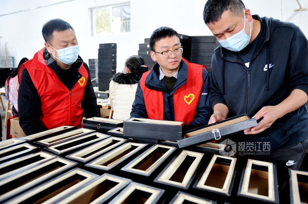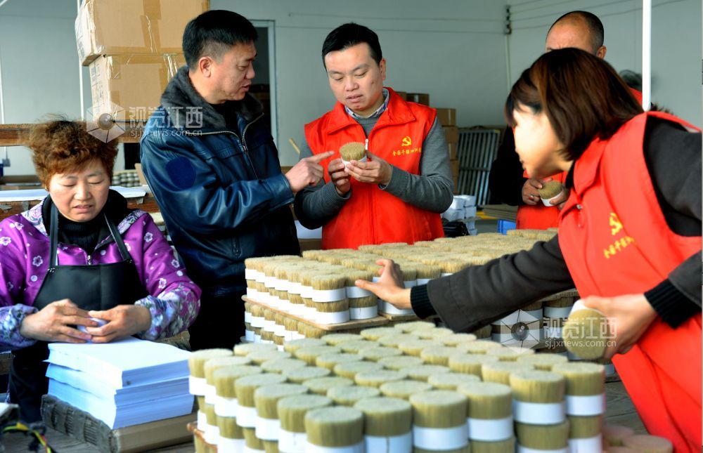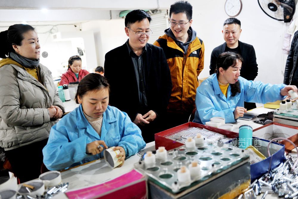 2022年3月28日,在江西省德兴市花桥镇党员干部正在该镇花桥村化妆笔制作车间了解其生产情况。