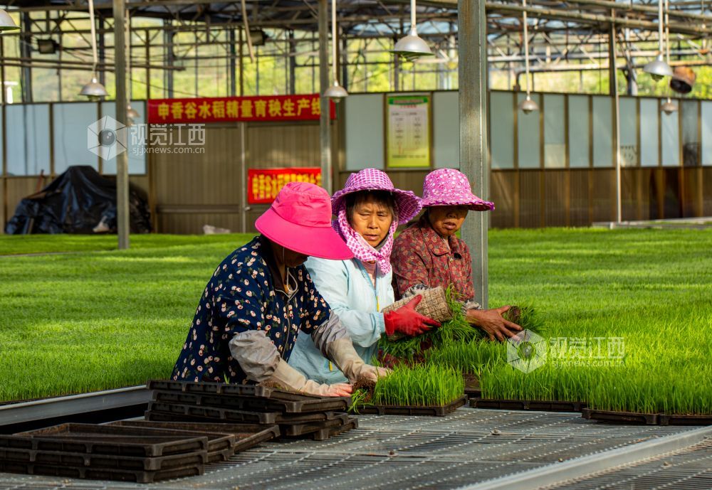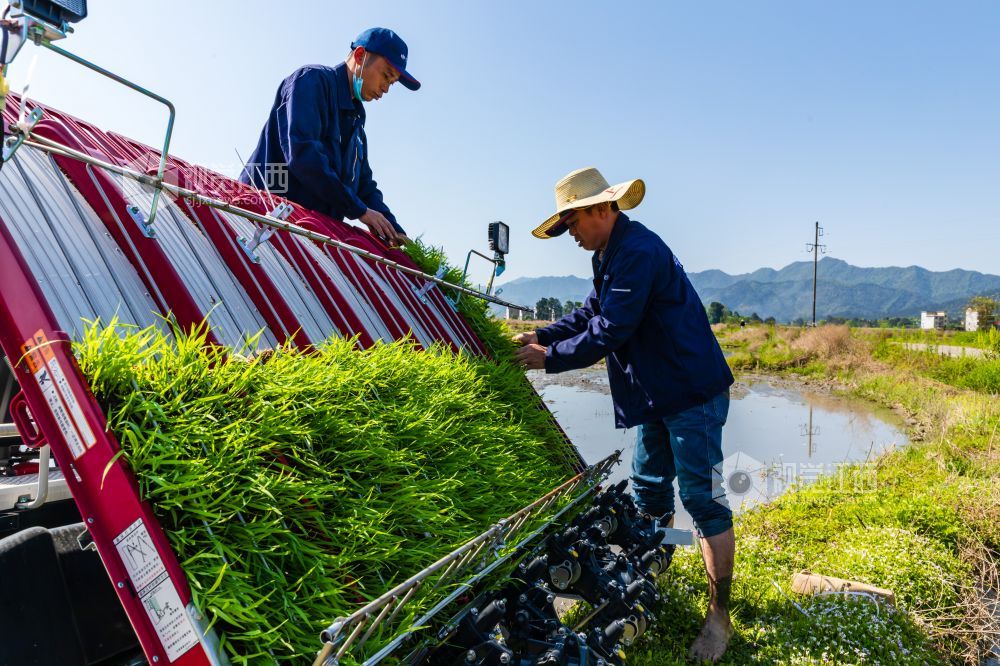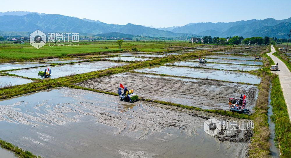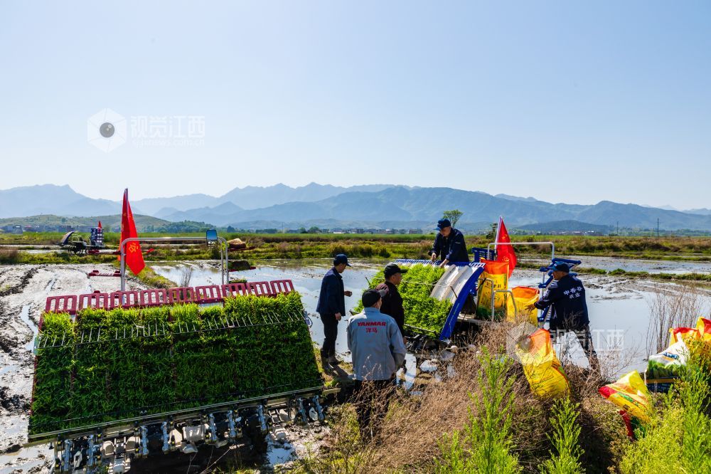 眼下正是春耕生产的关键时节, 4月9日,在江西省永新县龙源口镇泮中村高标准农田示范基地,当地种粮大户王春文带领10名农机手正驾驶着插秧机在田里来回穿梭,一株株秧苗被插入稻田里,站立成一排排,成为春日里生机勃发的一道风景。