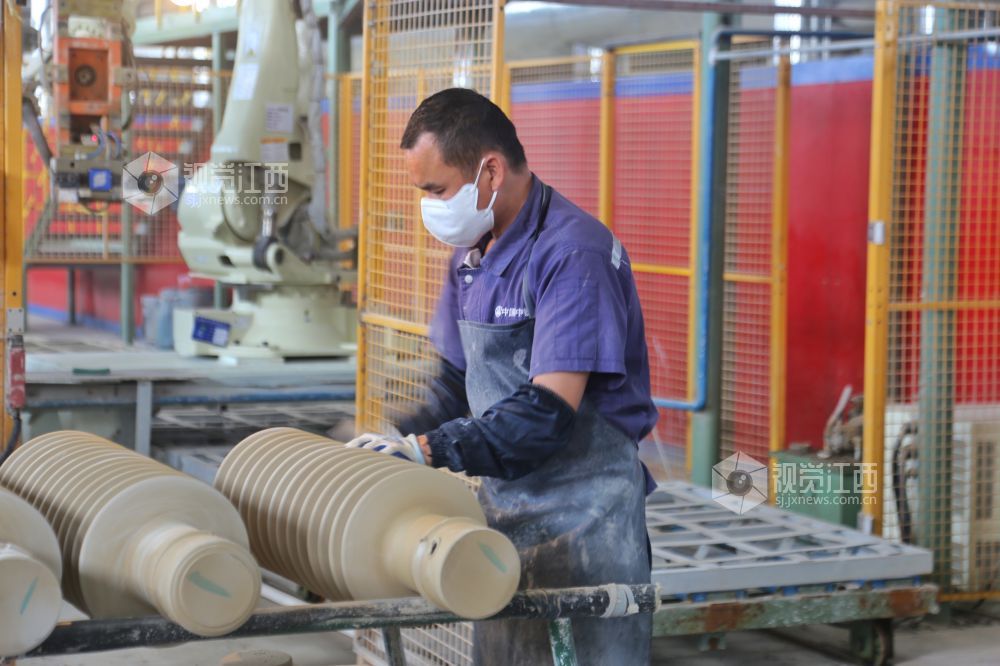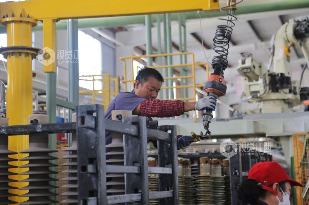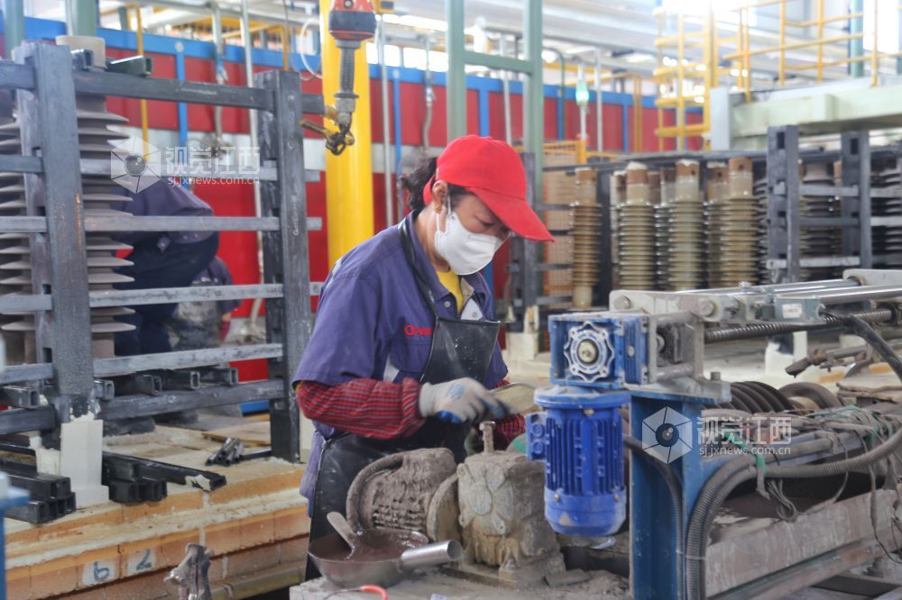 2022年5月3日,在江西省萍乡市芦溪县中铁国材绝缘材料有限公司,工人们放弃假日休息,坚守岗位,加紧生产电瓷产品。视觉江西 王强 摄