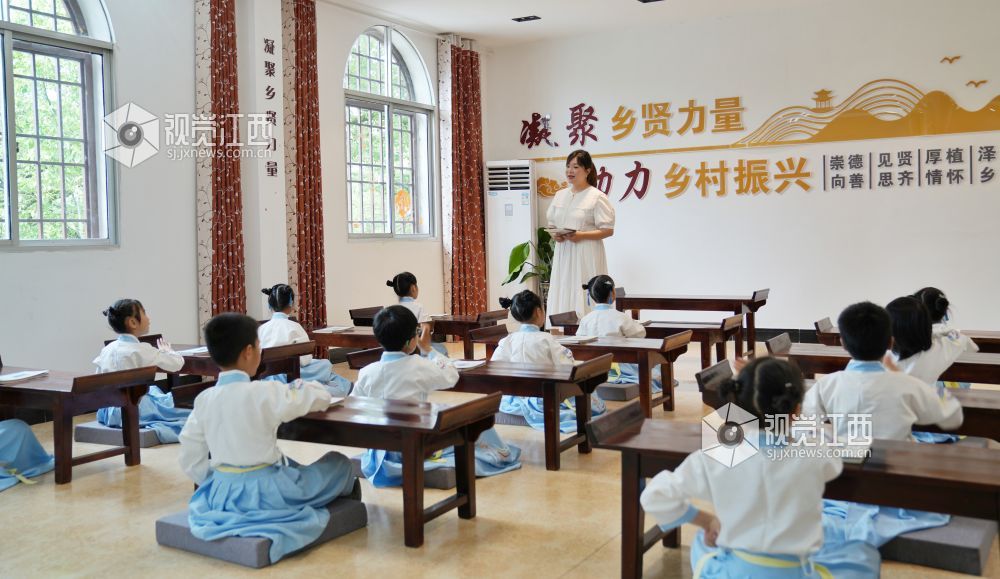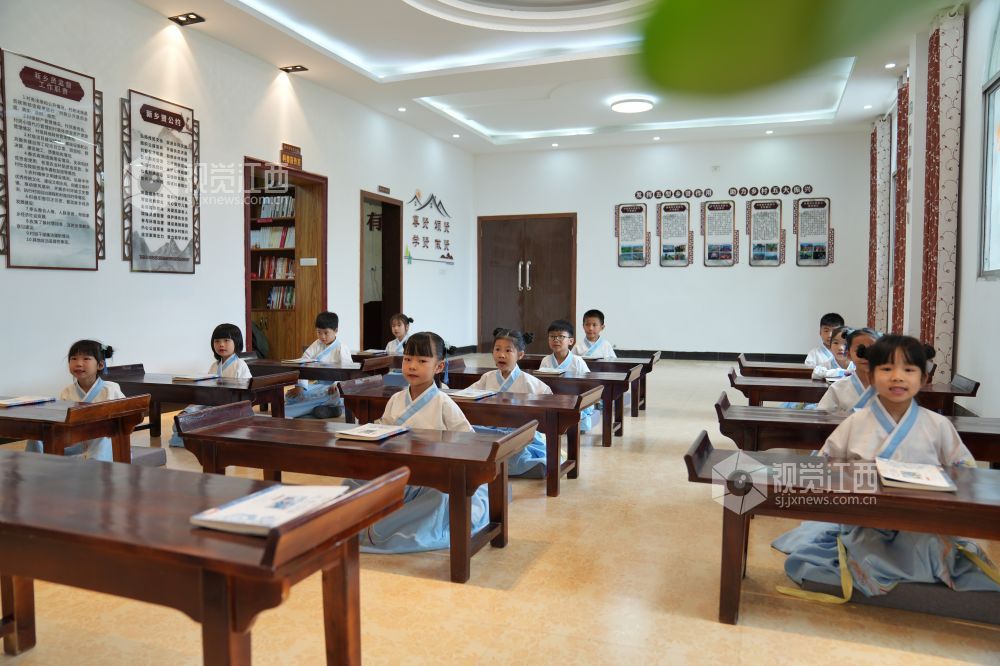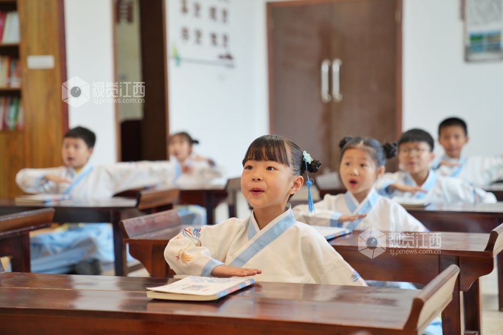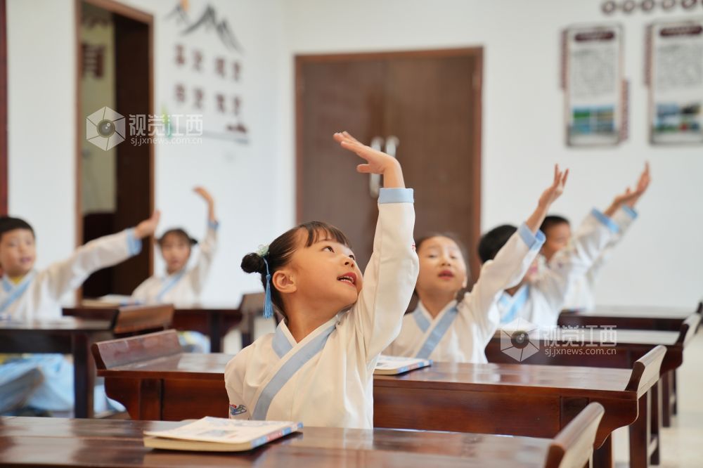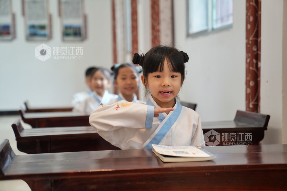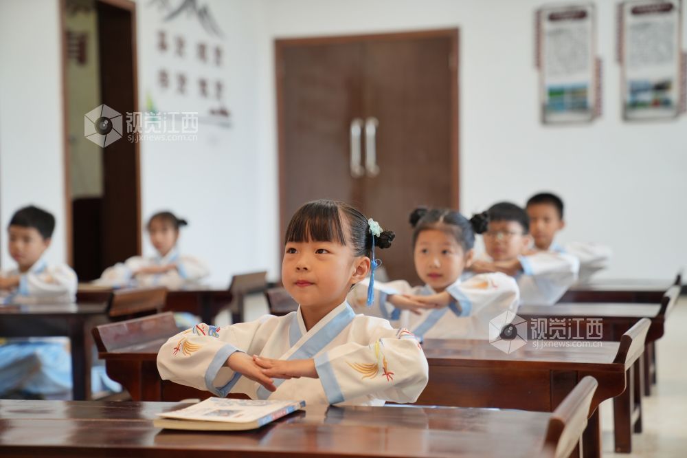 2022年6月14日,在江西省萍乡市芦溪县芦溪镇东阳书院活动大厅里,东阳小学的学生身穿汉服,在老师的带领下上“国学小课堂”。