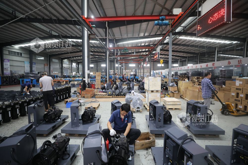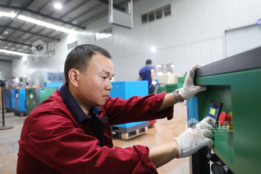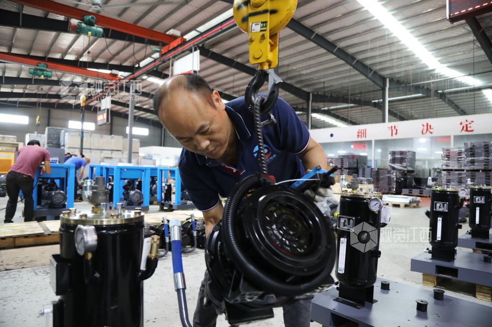 2022年6月18日,江西省莲花县工业园区一公司生产车间,员工正在忙着生产出口东欧市场的空压机订单。今年以来,莲花县努力克服疫情带来的影响,围绕“强攻二季度、确保双过半”的目标,出台多项政策扶持企业发展,确保稳增长、稳就业、惠民生。