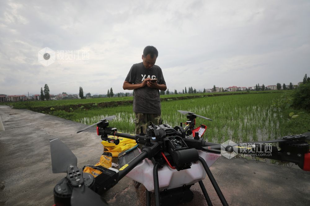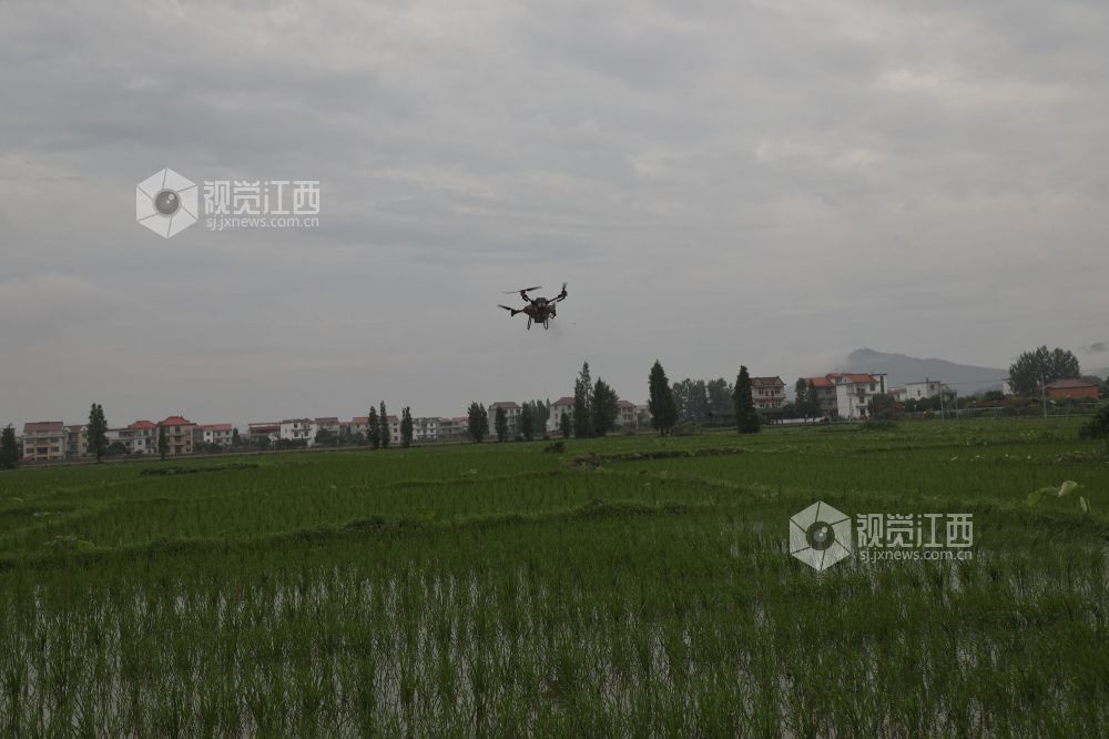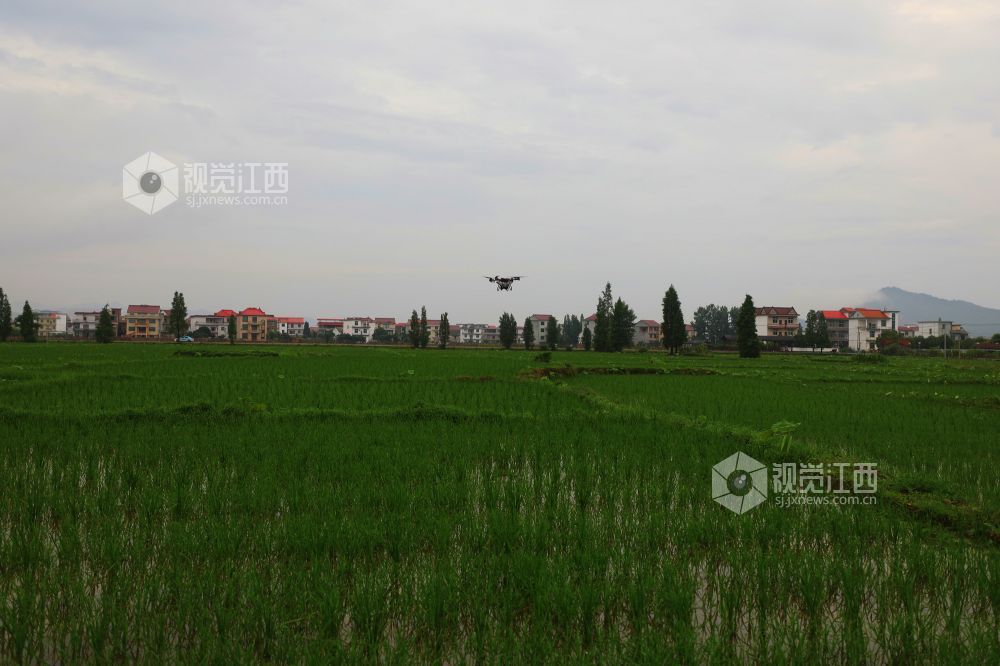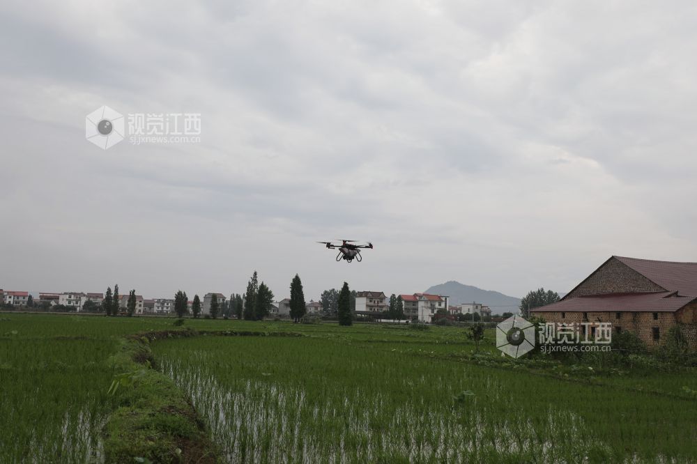眼下正是制种水稻追肥时节,6月18日,在莲花县升坊镇花园村制种基地,技术人员熟练地操作手机,一台农用无人机腾空而起,向水稻田飞去,并向下面绿油油的稻田均匀地喷洒肥料。
