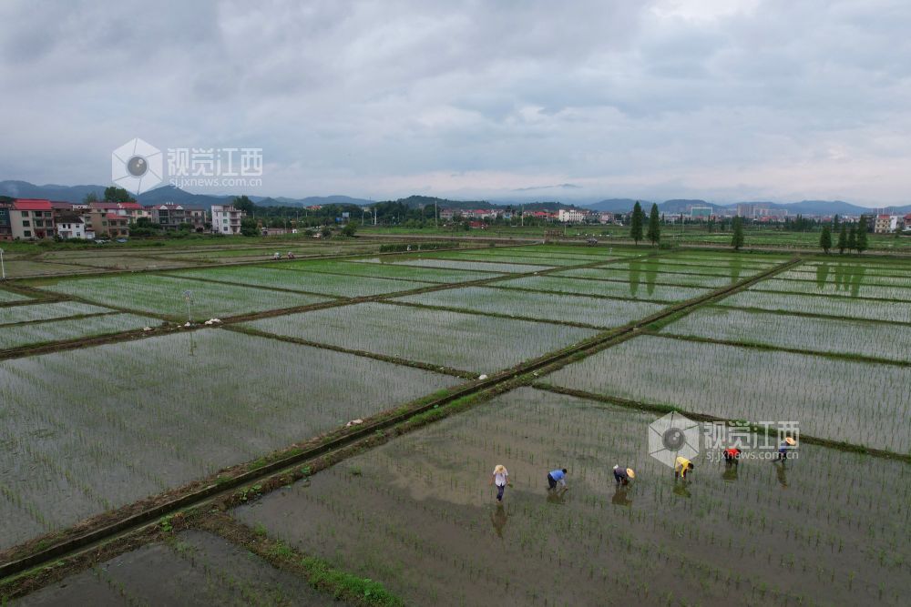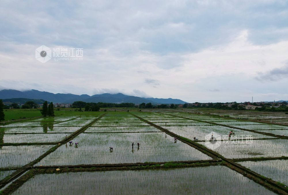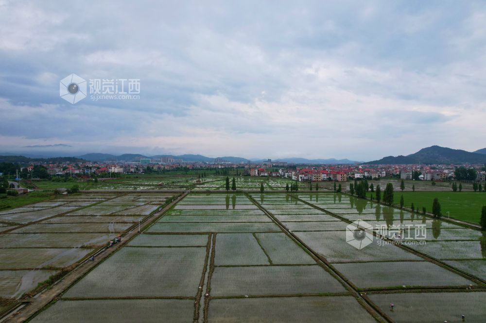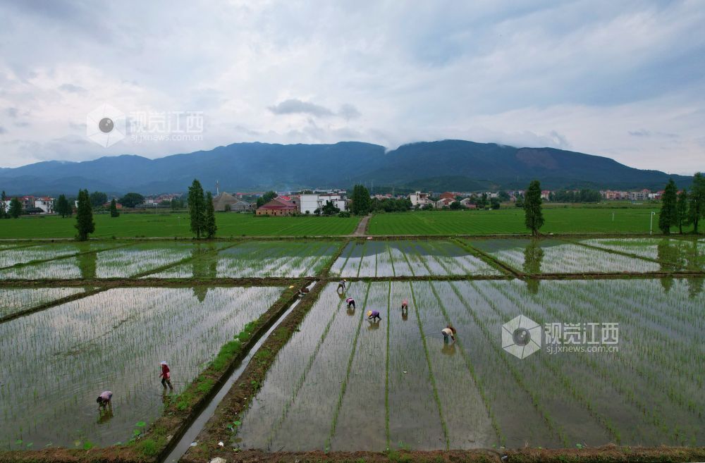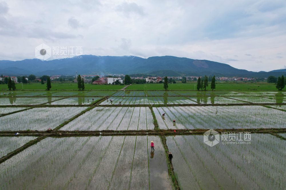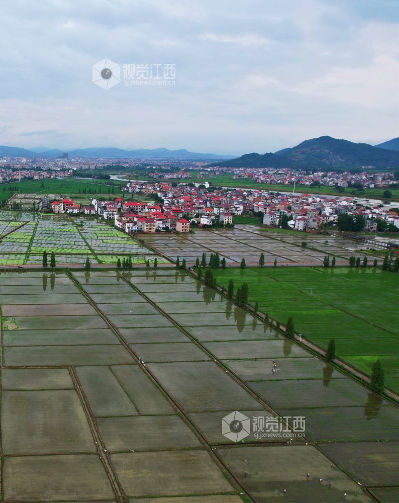 2022年06月19日,雨后的江西省莲花县琴亭镇莲花村,稻田里翠绿、淡青的禾苗,嫩绿的荷花以及正在稻田里插秧的村民与田园、河流、民居、道路、树木交相辉映,构成一幅美丽的乡村画卷。