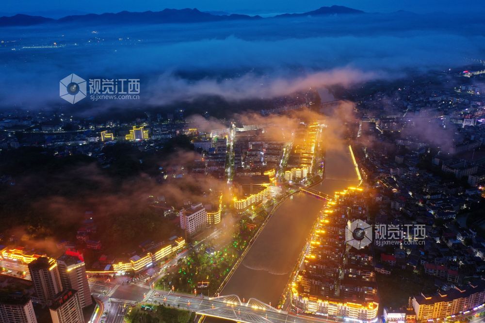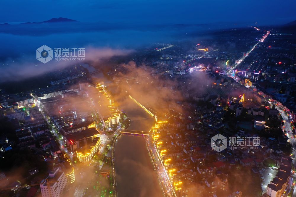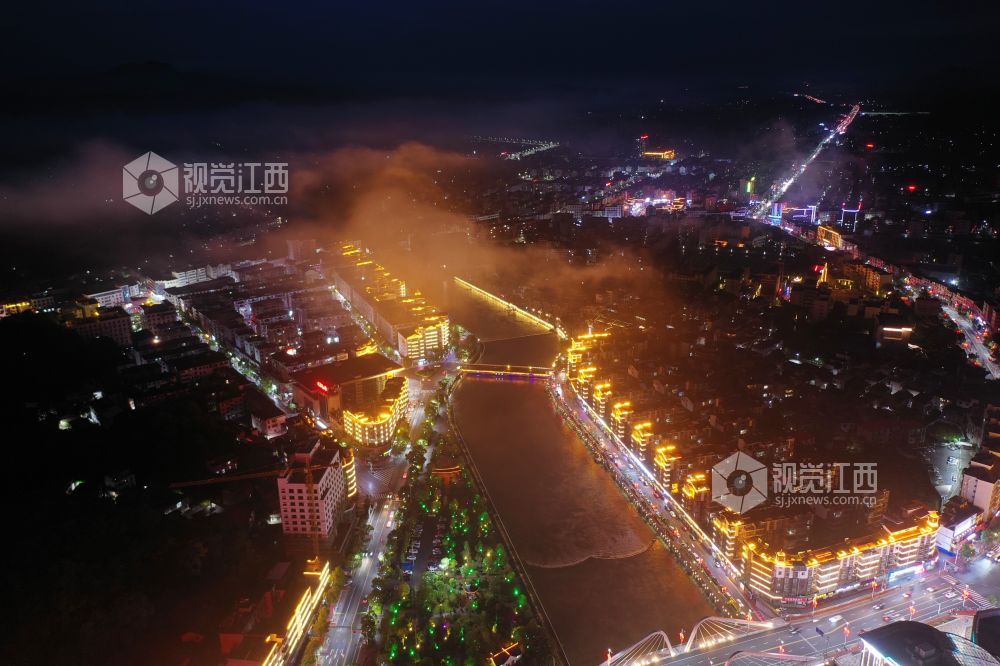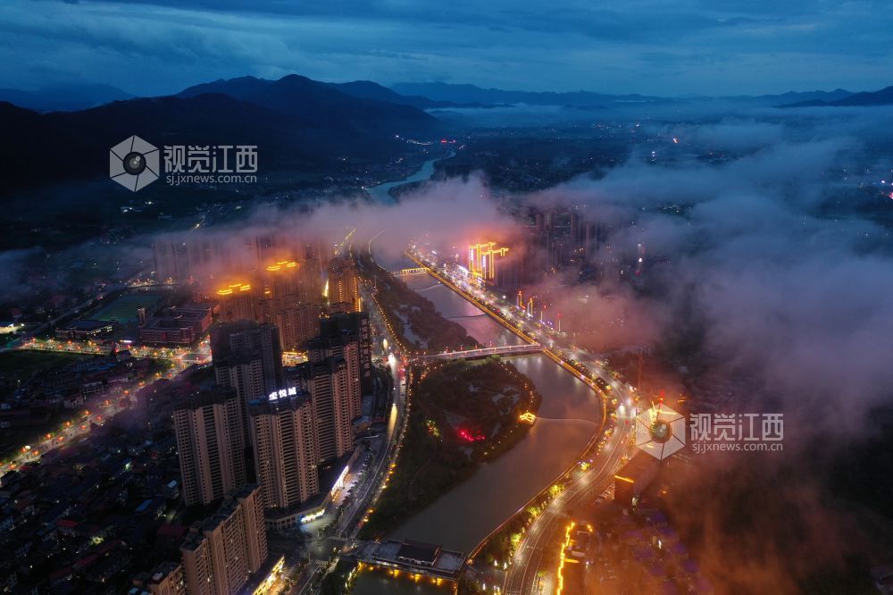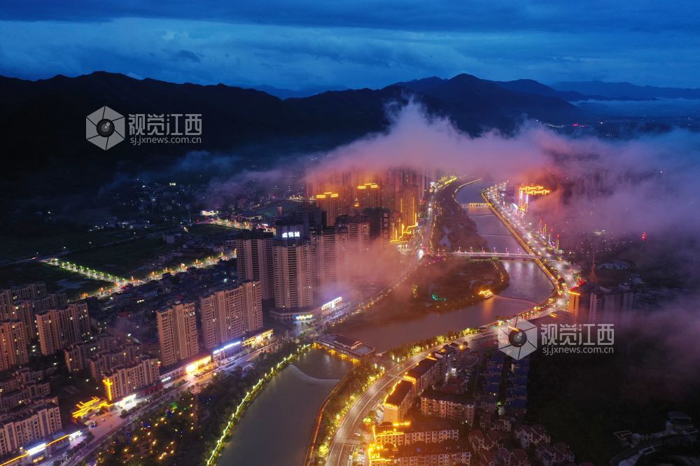 6月18日,江西省萍乡市芦溪县上空云雾缭绕,袁河两岸华灯齐放,在灯光的照耀下,整个城市五彩斑斓,如若仙境,景美如画。