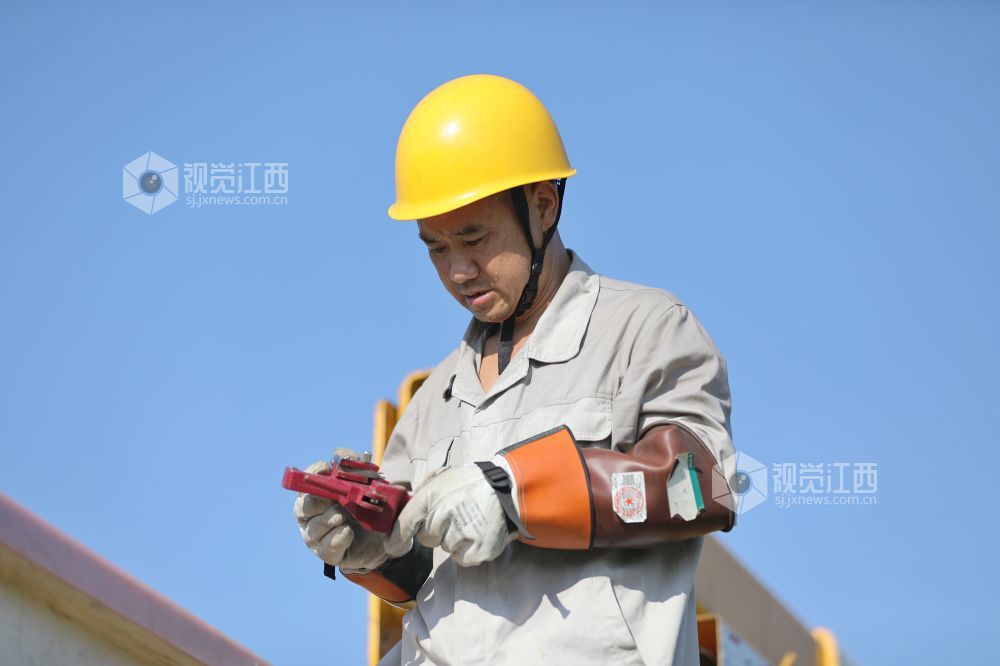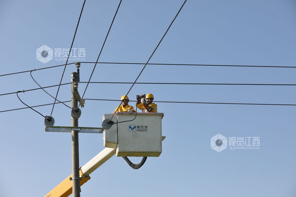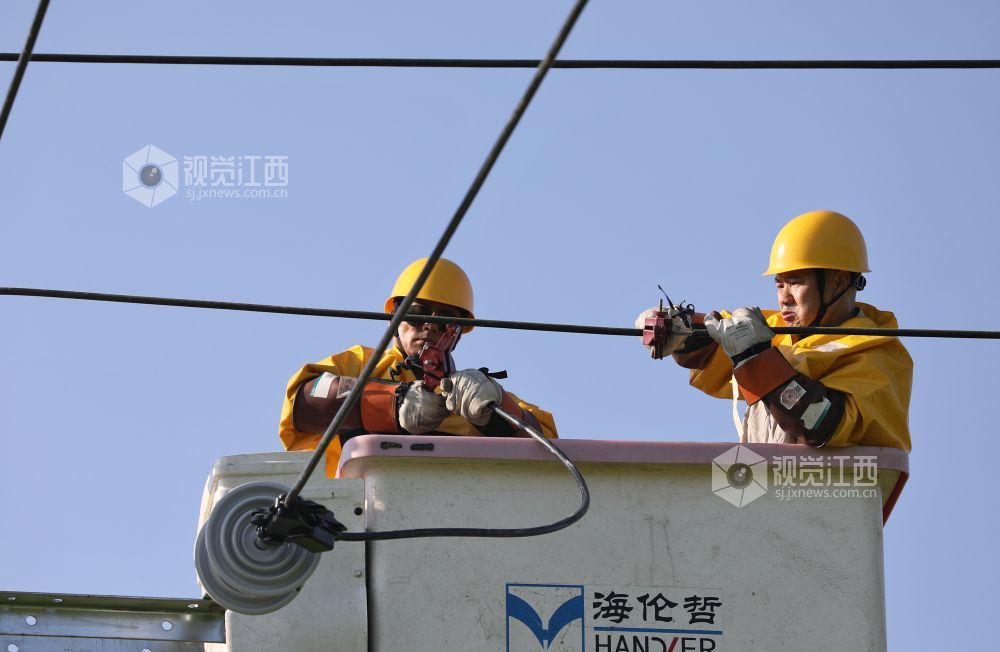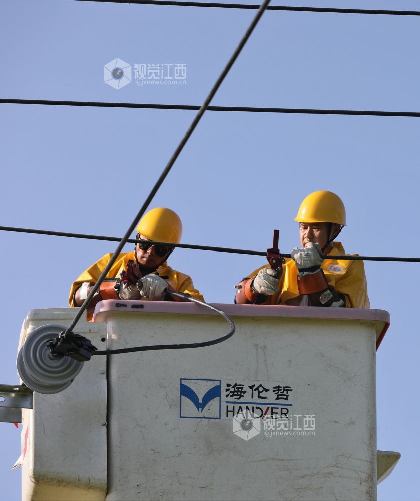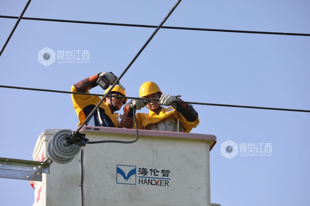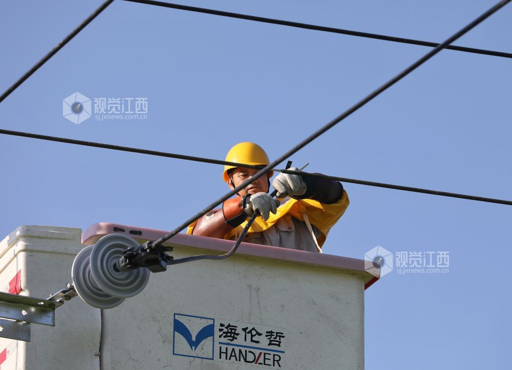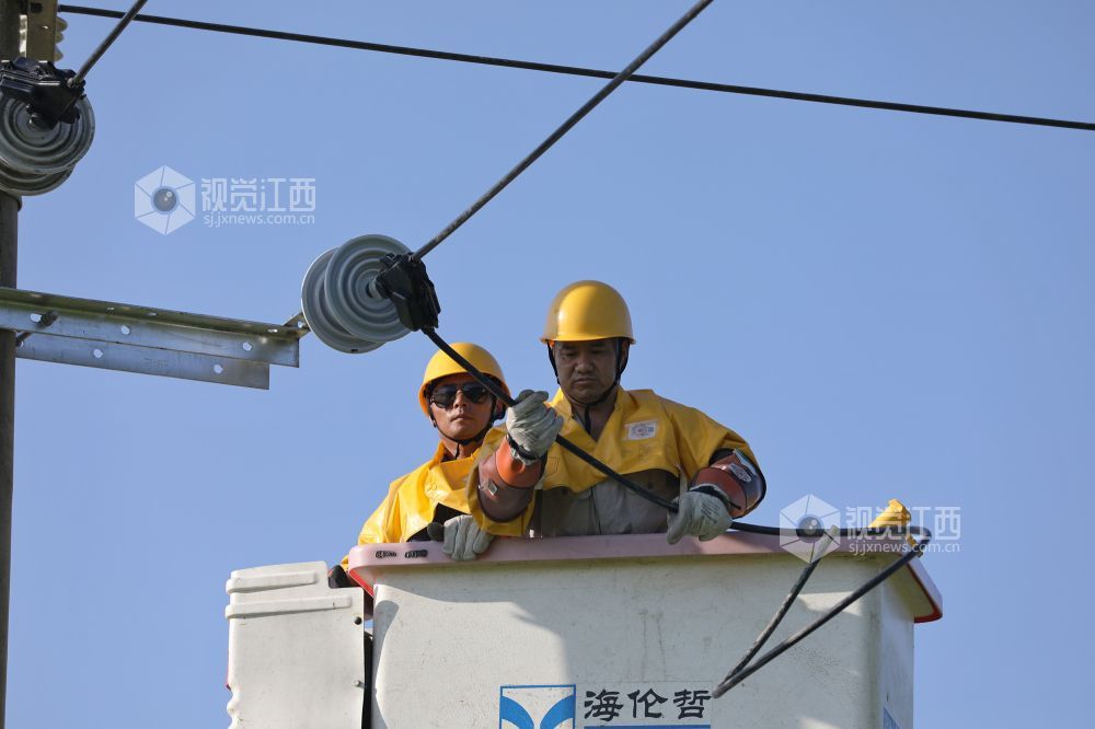 7月26日,江西省莲花县高洲乡上塘村,县供电公司带电作业班的工作人员正在搭接引线,恢复该村坳上村民小组供电。