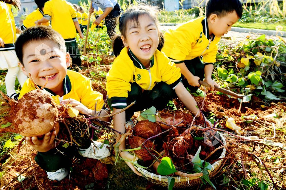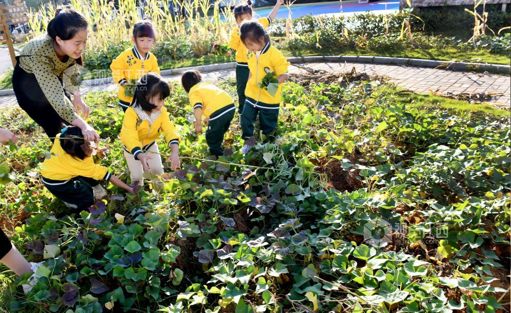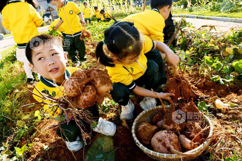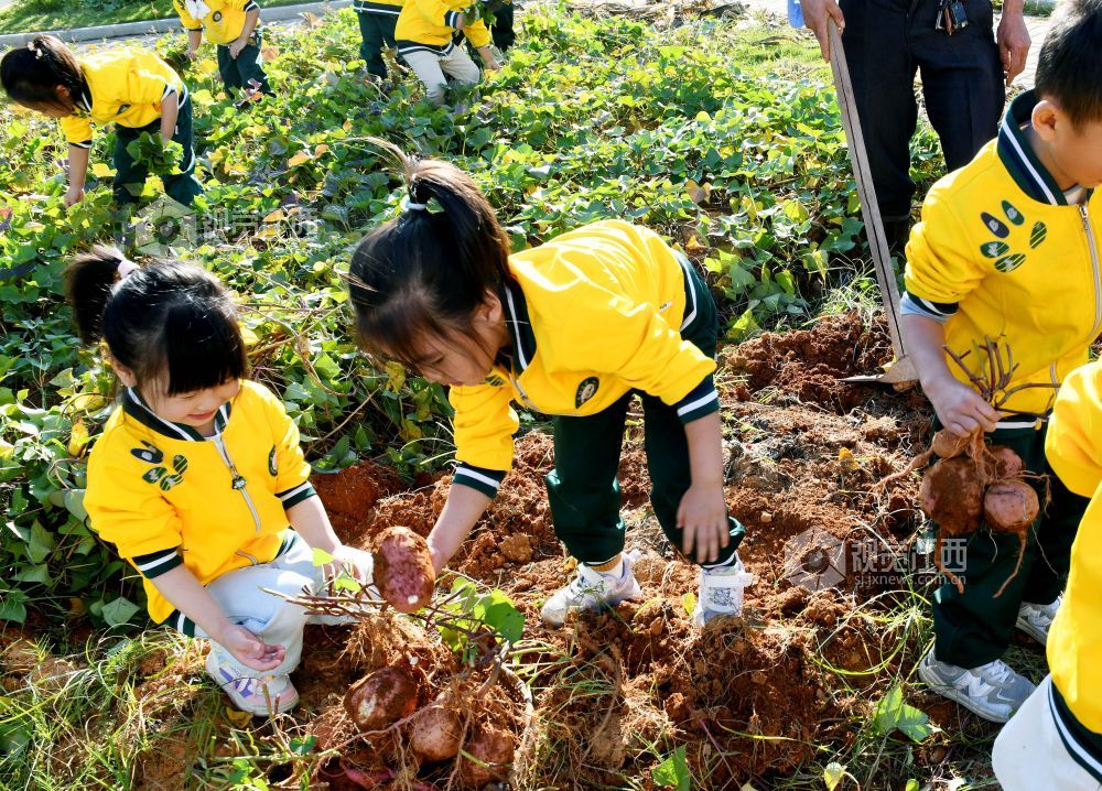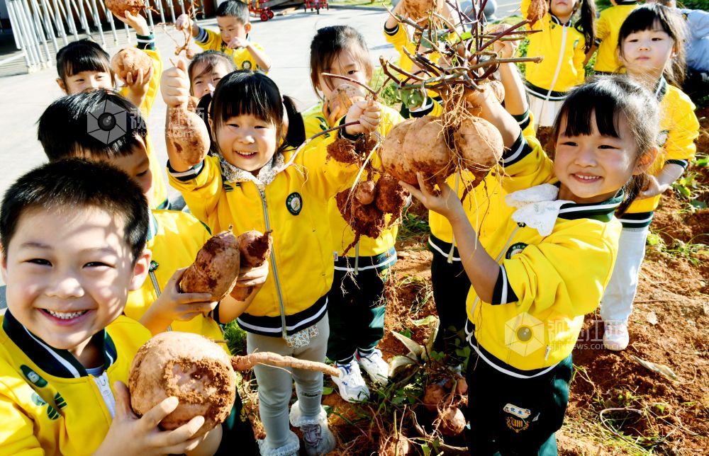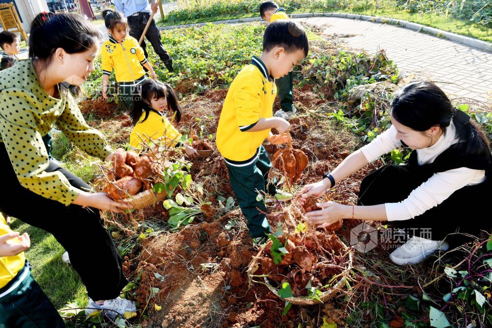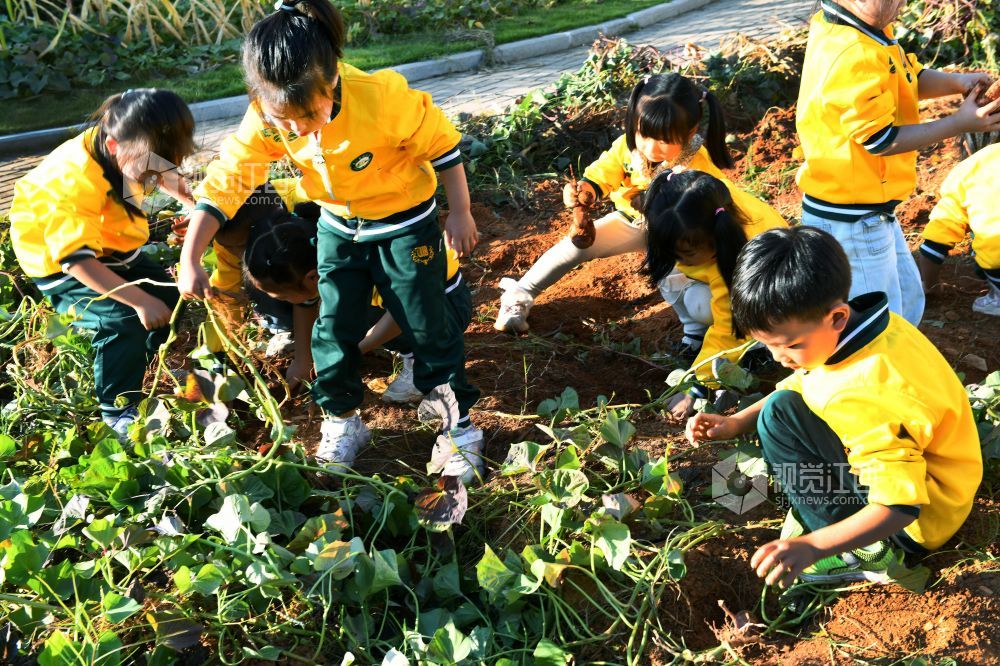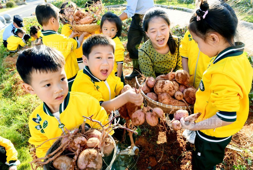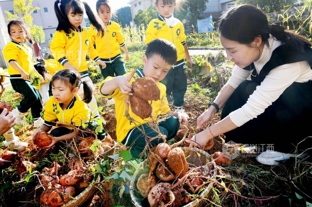 2022年10月31日,江西省德兴市幼儿园大班的小朋友正在校园内开心采收红薯。