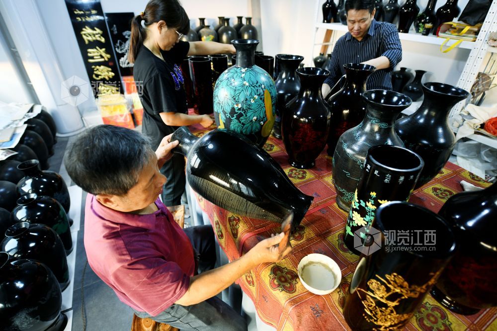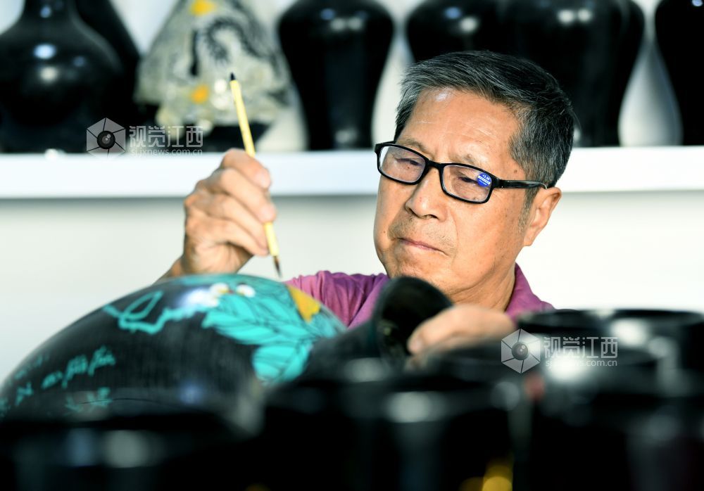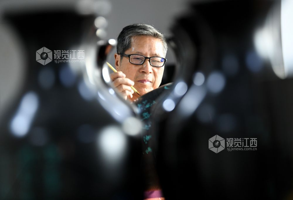 2022年11月23日,江西省鄱阳县张氏五代传承人张小华正在给国家级非物质文化遗产作品脱胎漆器工艺瓶进行上彩添色。