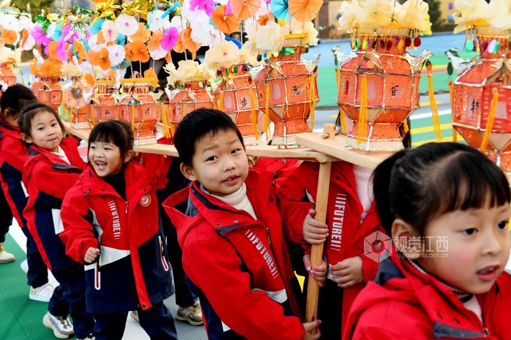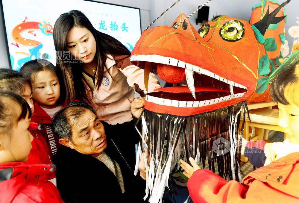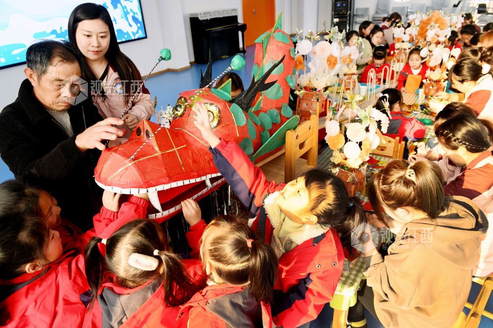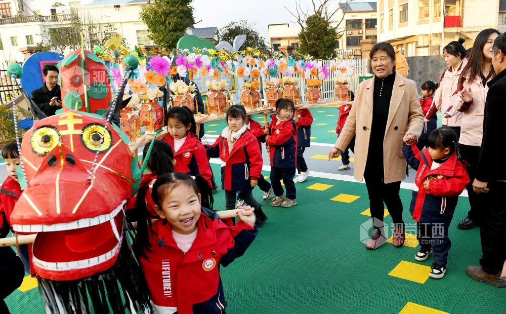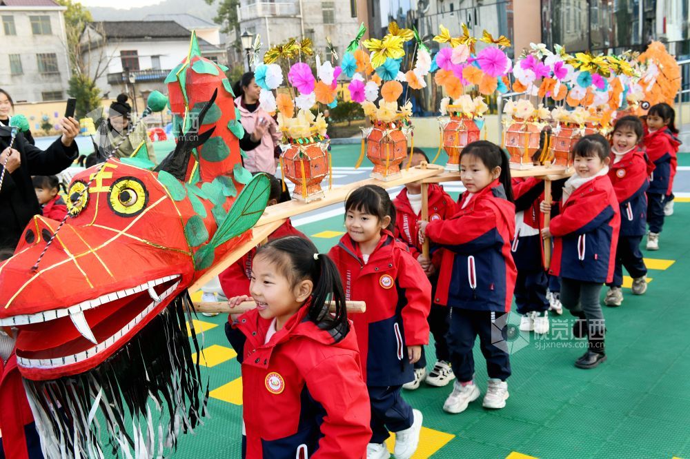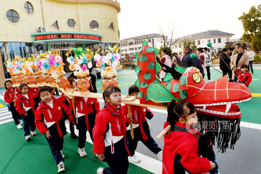 2023年2月20日,江西省德兴市新营幼儿园大班的孩子们正在校园里开心舞动微型板凳龙,吸引了家长和老师的观看。