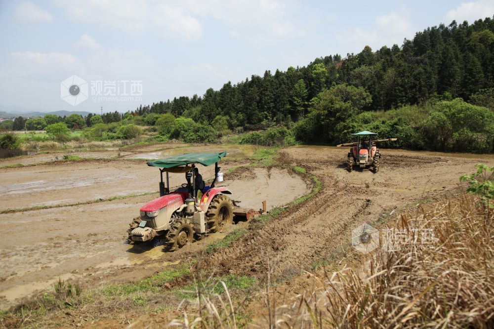 4月7日,江西省莲花县三板桥乡棠市村上冲里田垄,两台旋耕机正在平整田块,村民在忙着播种。