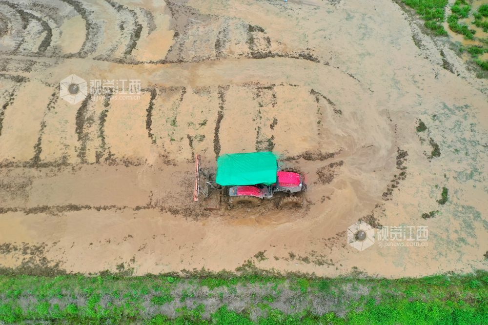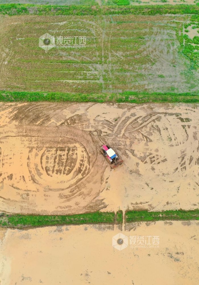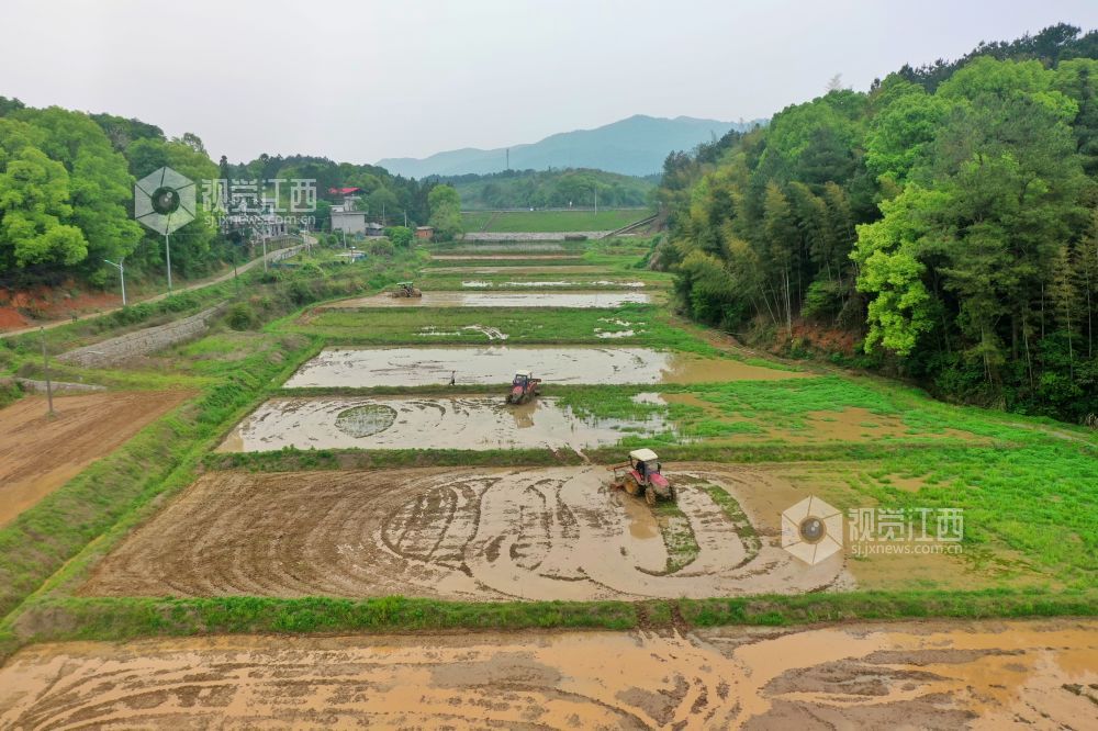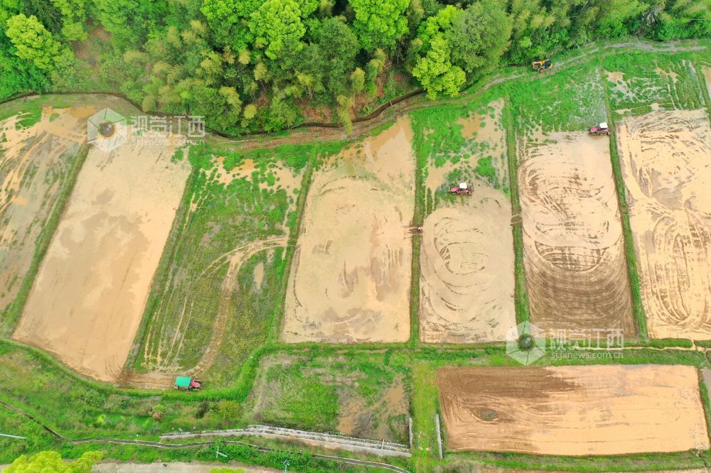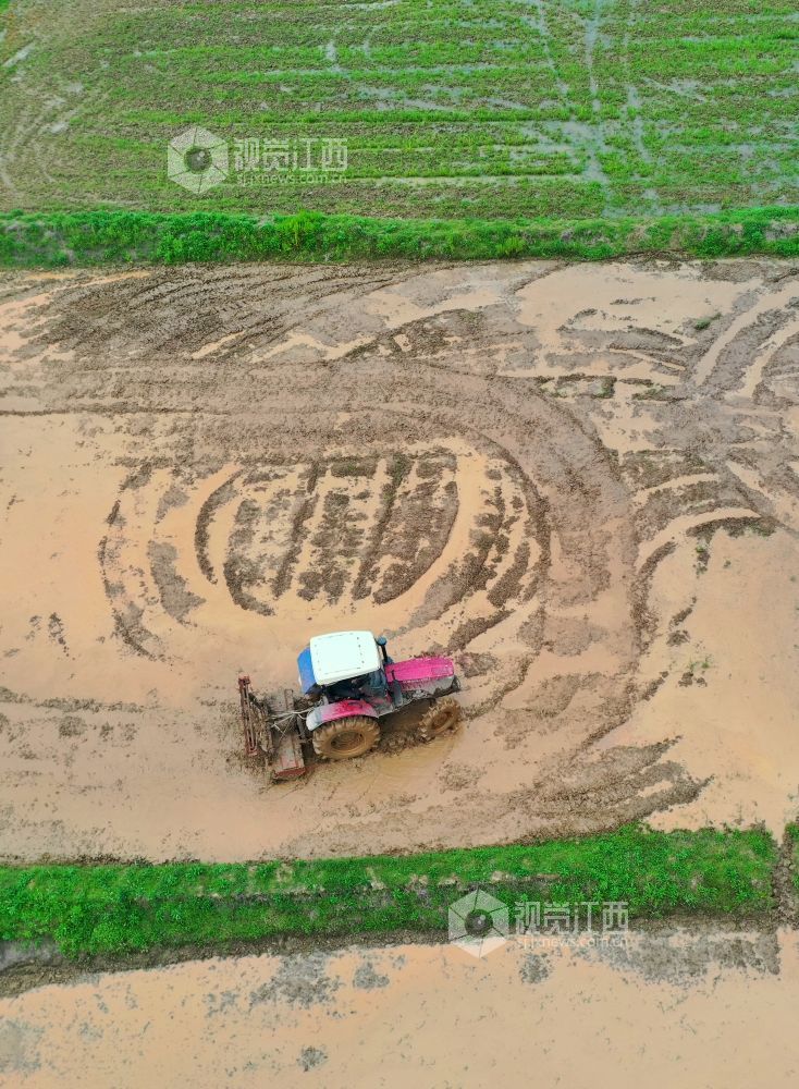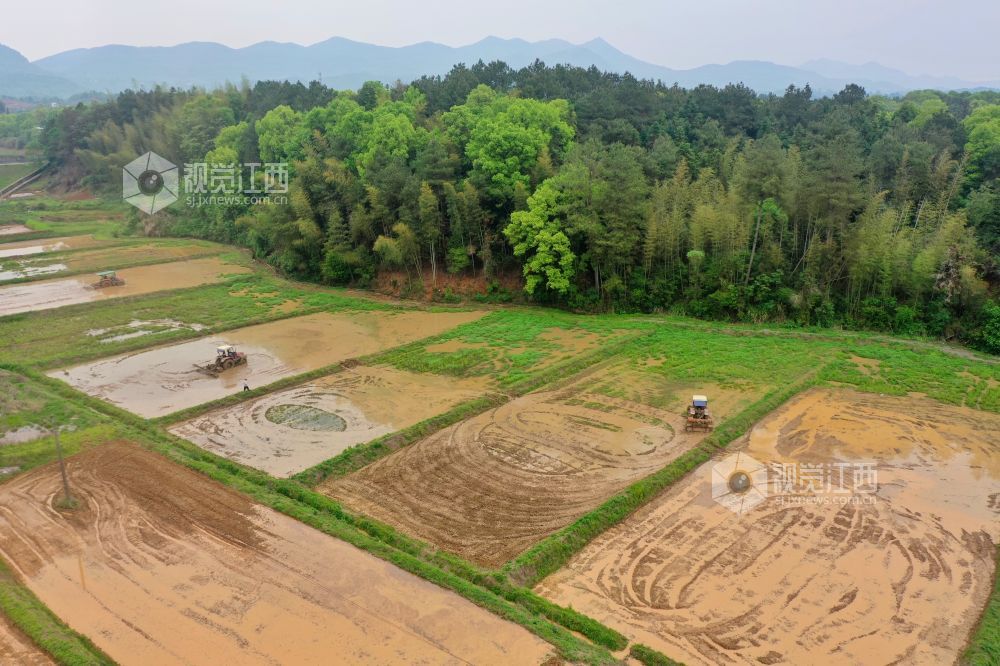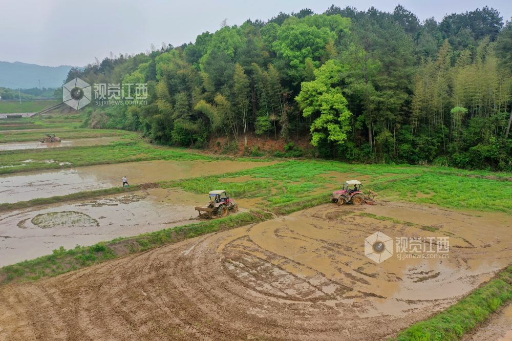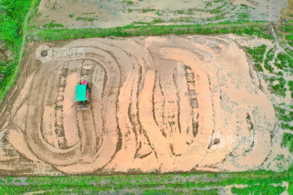 2023年4月13日,在江西省萍乡市芦溪县芦溪镇葛溪村,农民正驾驶农机翻犁稻田,机声隆隆,一派忙碌景象。