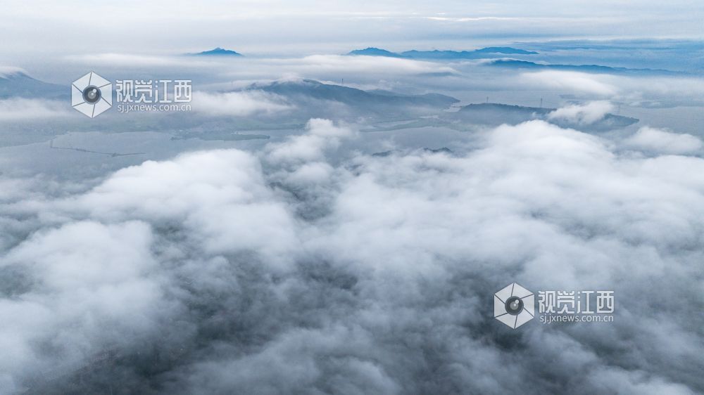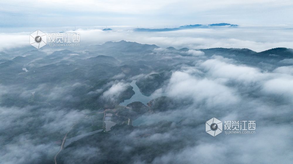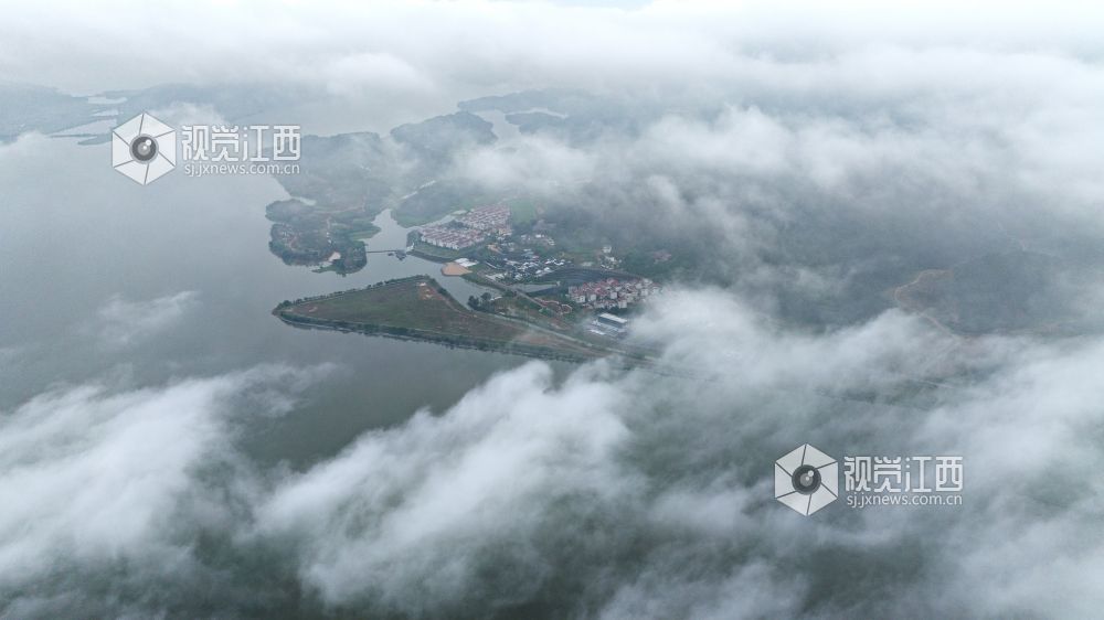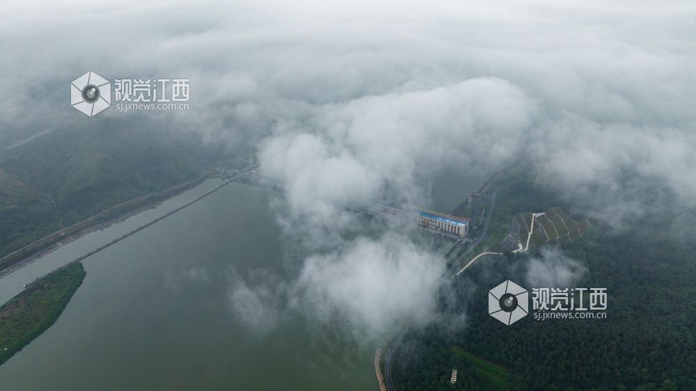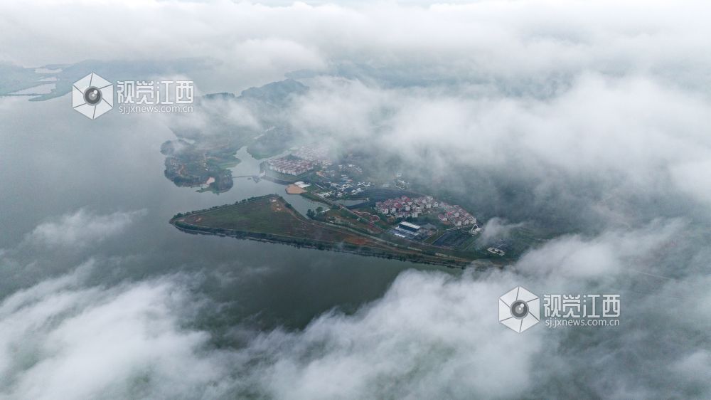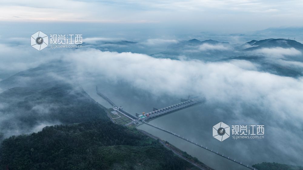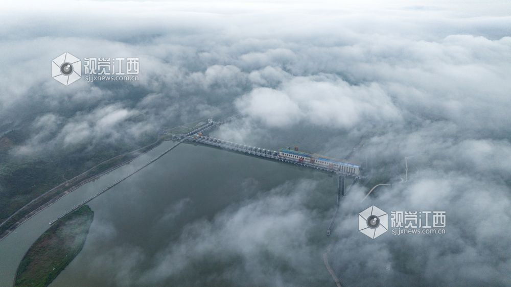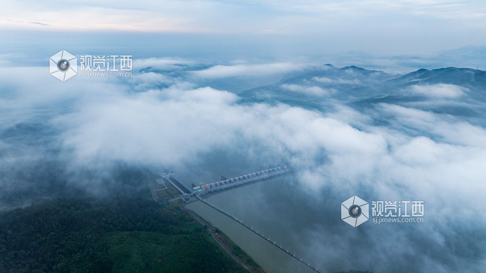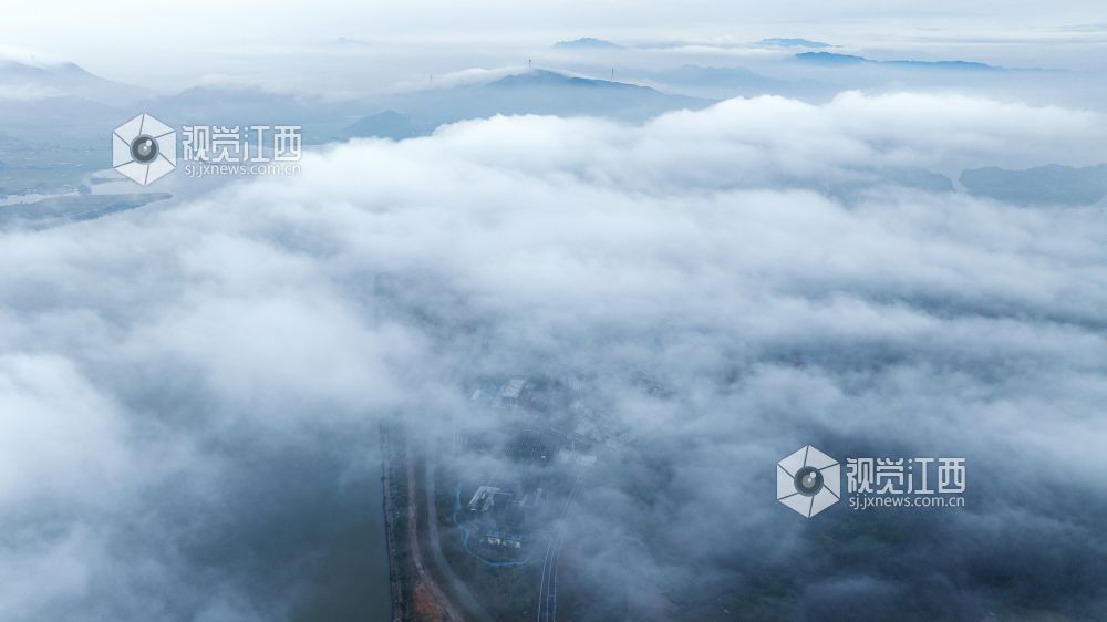 2023年6月9日, 阵雨过后的清晨,正是观看云海的最佳时机。在江西省峡江县水利枢纽的坝上和上游的蒋沙渔村形成云海的景观。放眼远望,漫漫云海在座座山峰间奔涌,时如飘逸的轻纱,时如滚滚波涛。莽莽群山和赣江之中,云海翻腾,云雾弥漫、波澜壮阔,蔚为壮观。云雾缭绕的村庄与云海、形成一幅画卷,美不胜收。