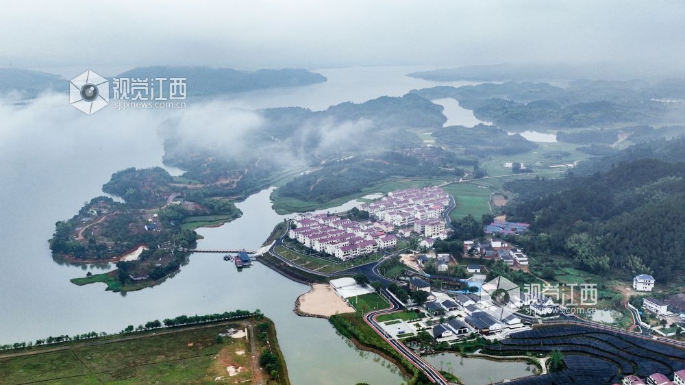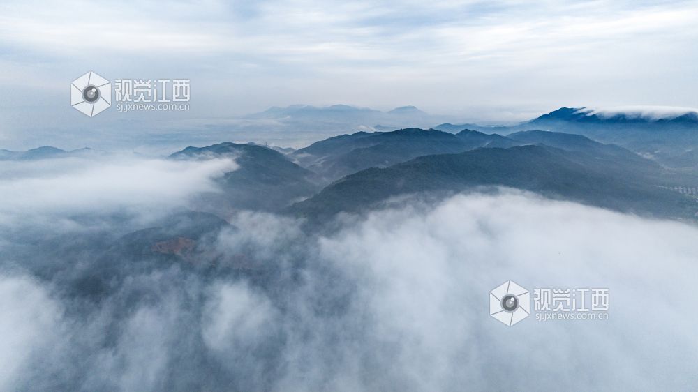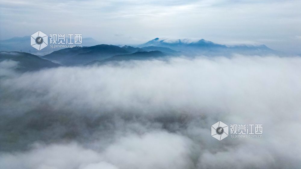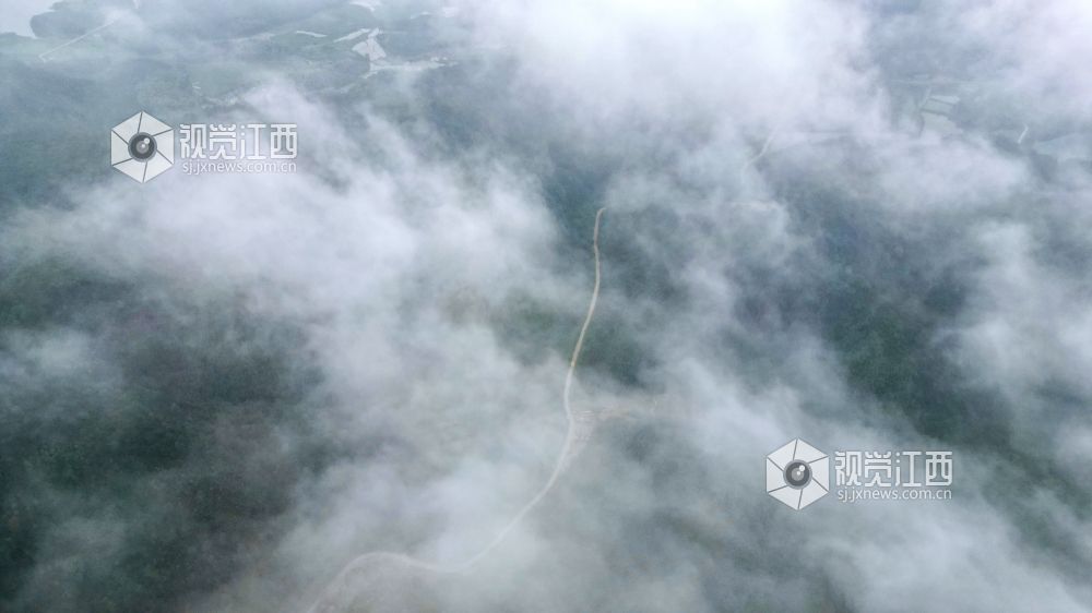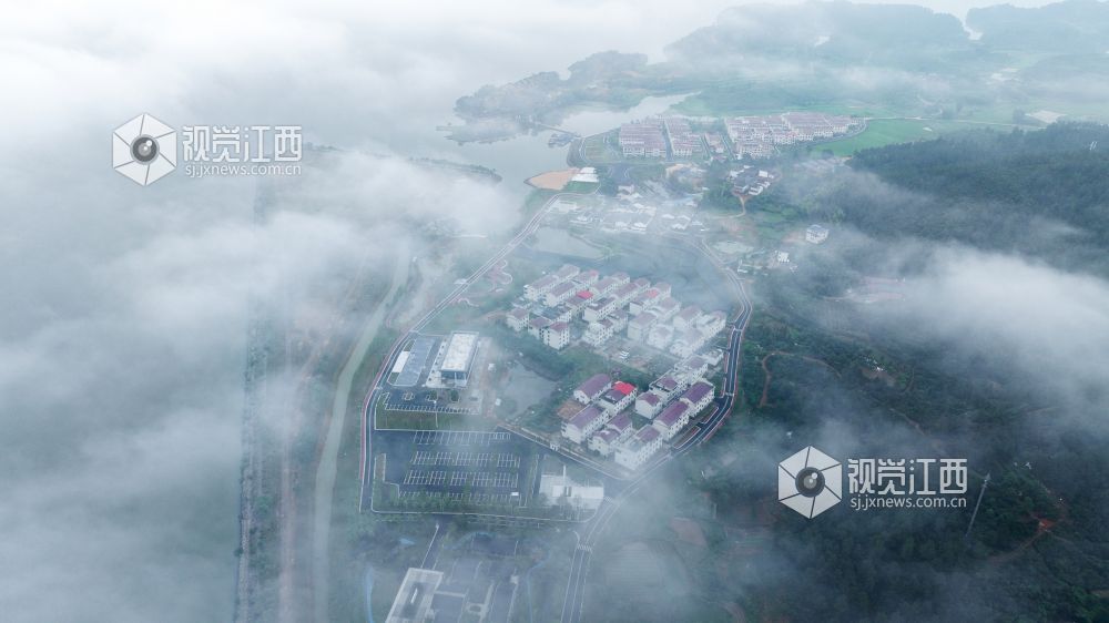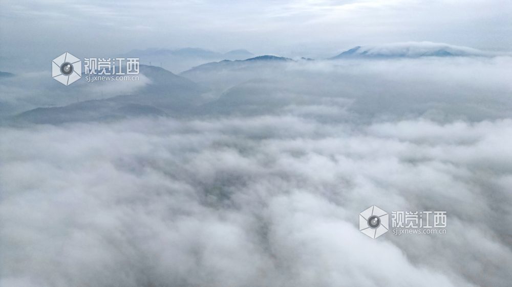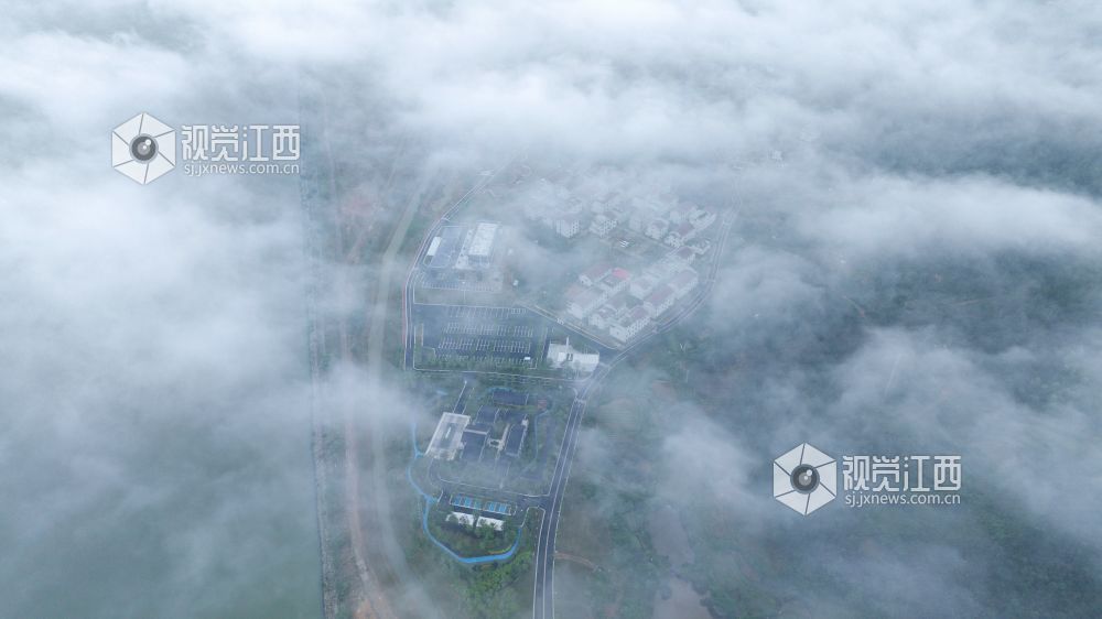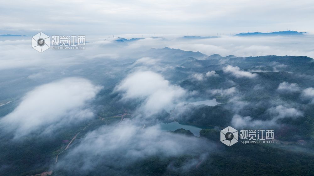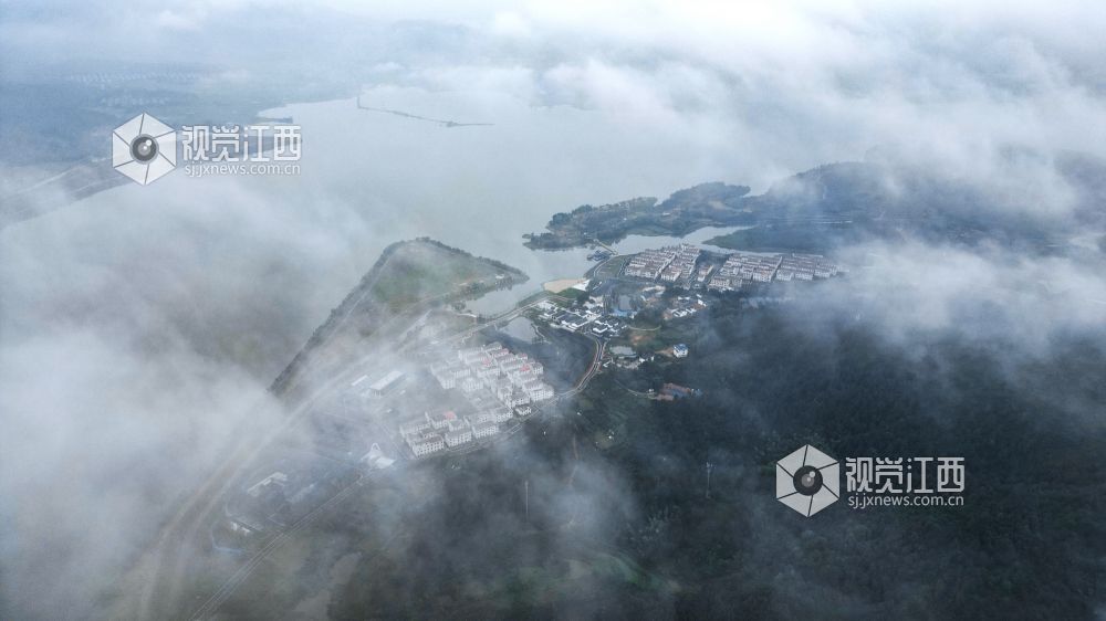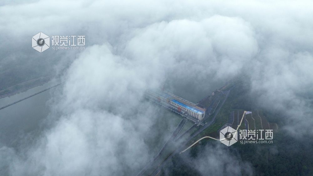 2023年6月9日, 阵雨过后的清晨,正是观看云海的最佳时机。在江西省峡江县水利枢纽的坝上和上游的蒋沙渔村形成云海的景观。放眼远望,漫漫云海在座座山峰间奔涌,时如飘逸的轻纱,时如滚滚波涛。莽莽群山和赣江之中,云海翻腾,云雾弥漫、波澜壮阔,蔚为壮观。云雾缭绕的村庄与云海、形成一幅画卷,美不胜收。