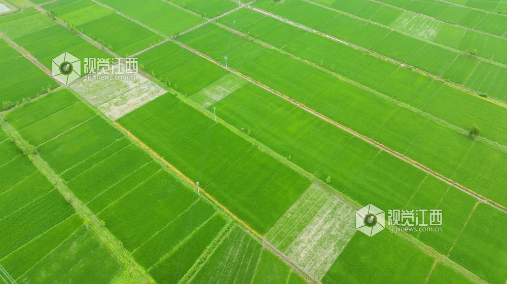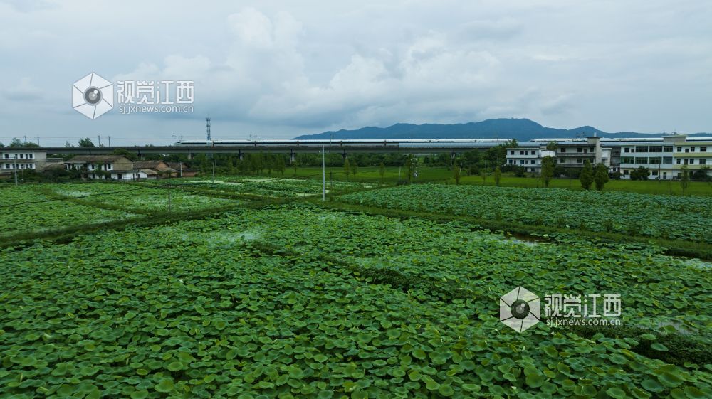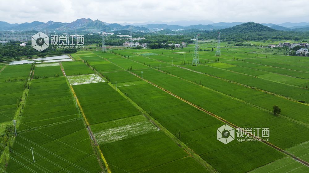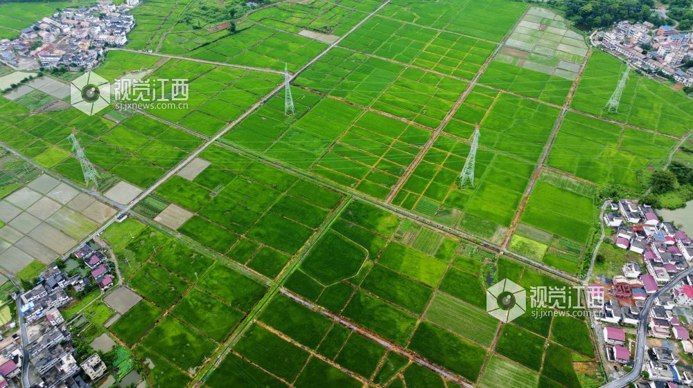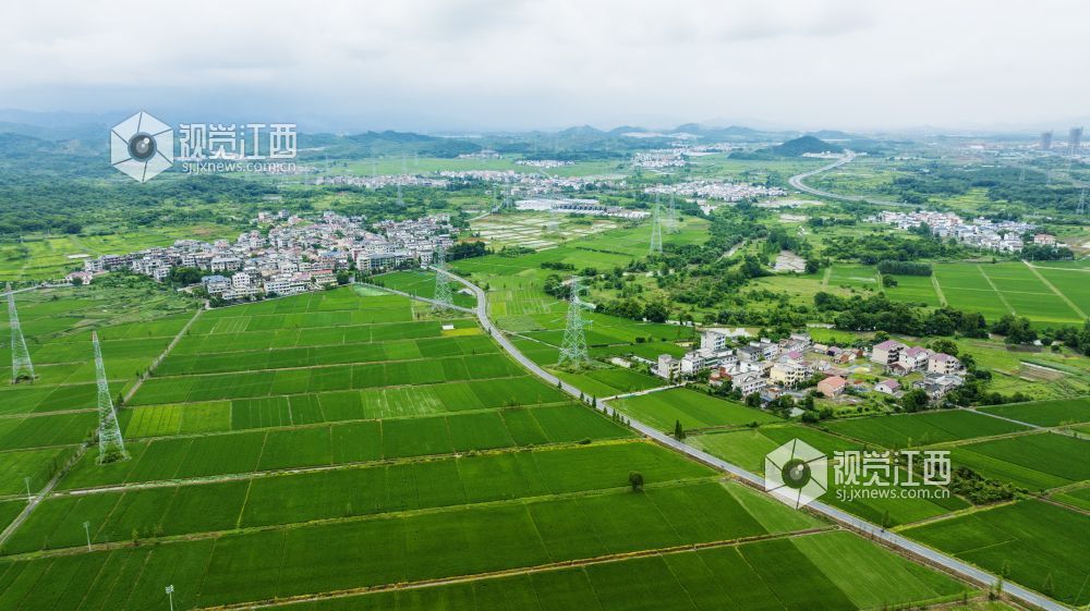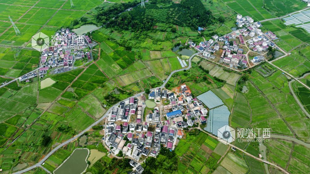6月21日,江西新余仙女湖区观巢镇,田园、道路、房屋、青山组成了一幅美丽的生态画卷。