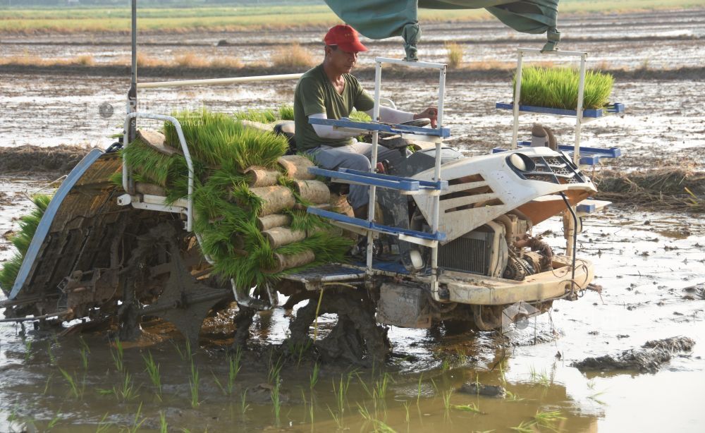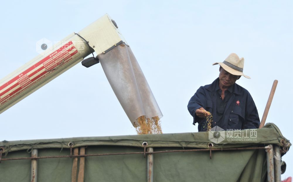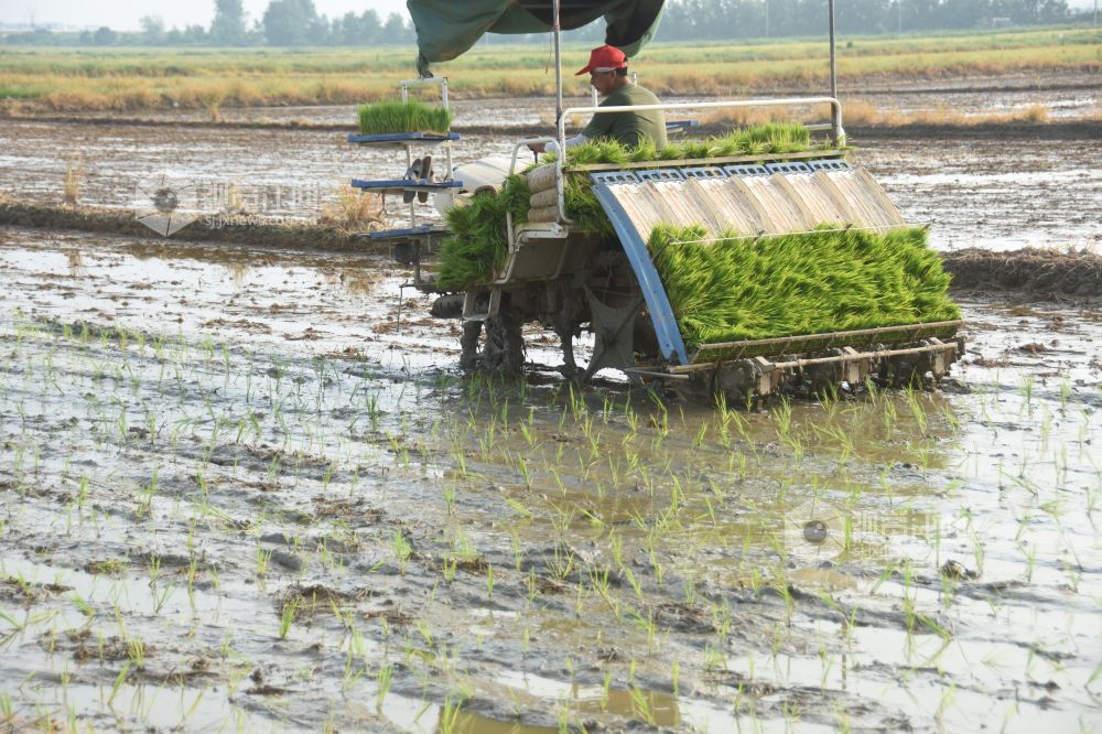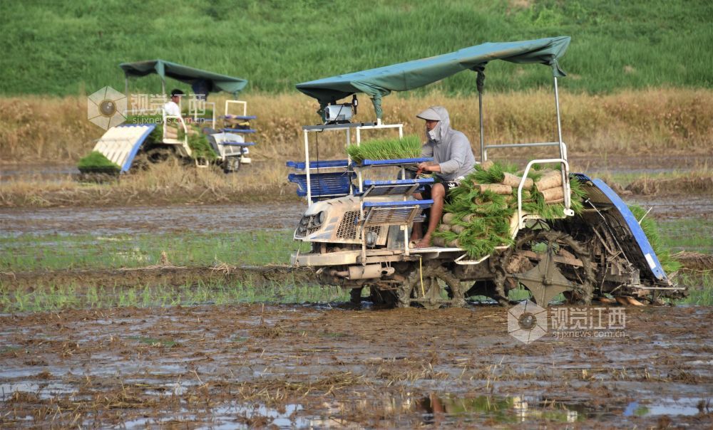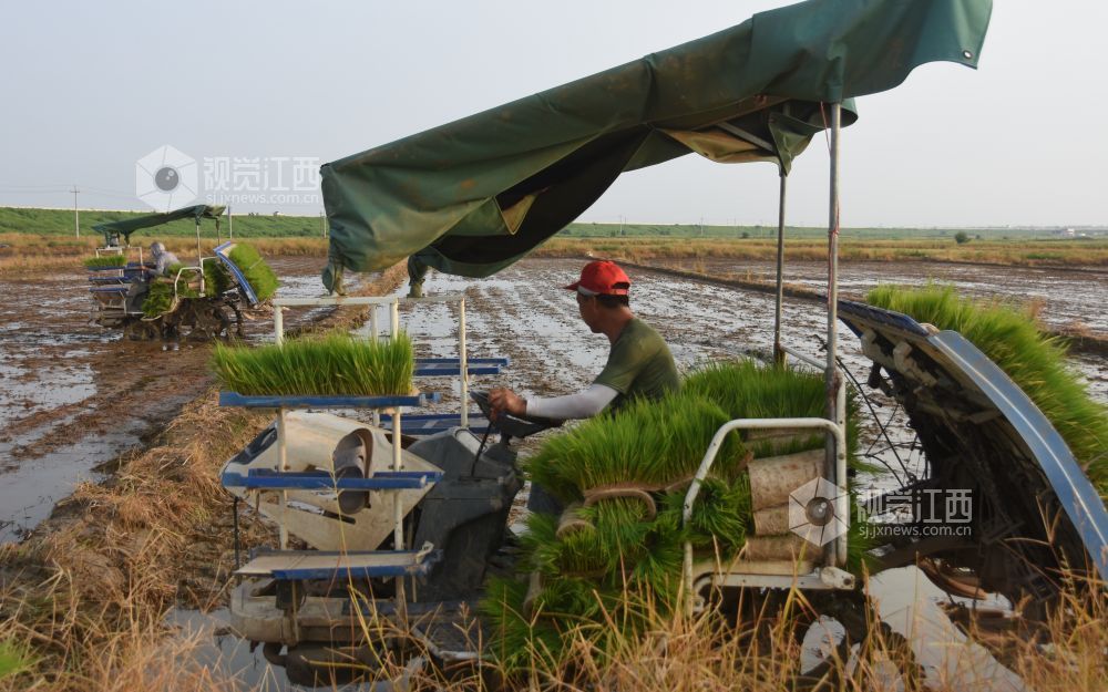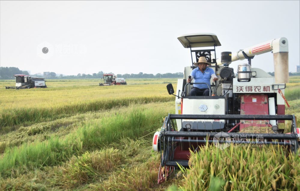 2023年7月15日,烈日炎炎“三伏”天,江西省鄱阳县双港镇种粮大户正组织农机手,收割早稻、抢插晚稻,实施“双抢”作业。千亩稻田机声隆隆,ー派繁忙。