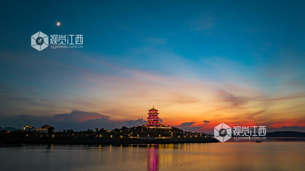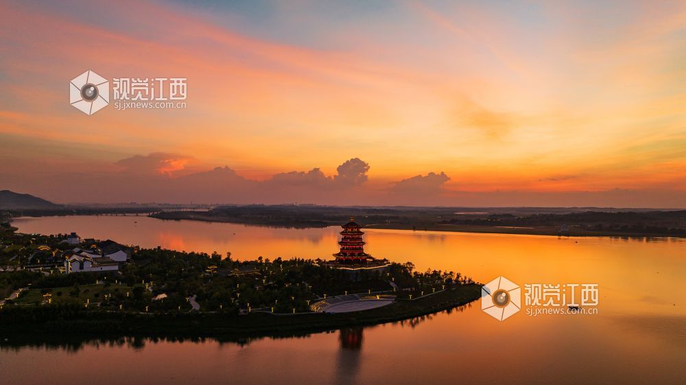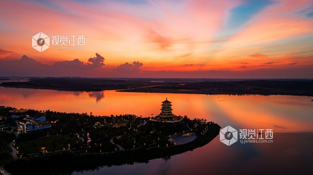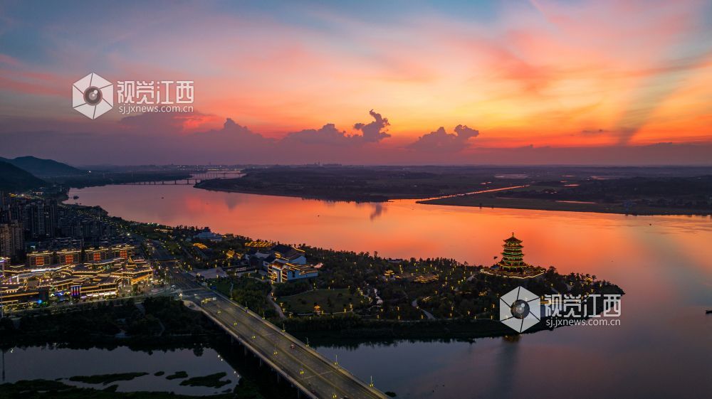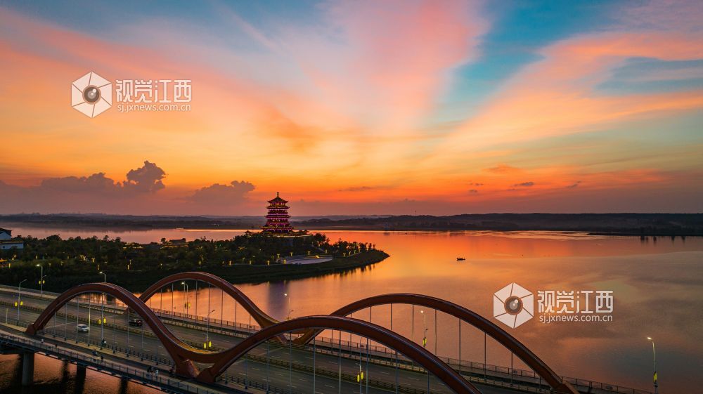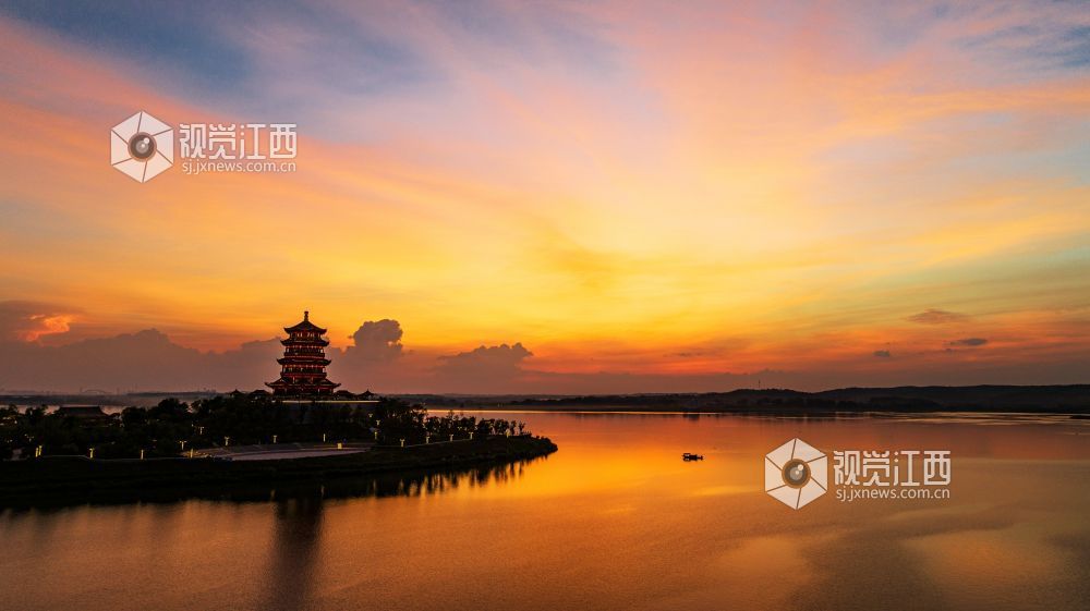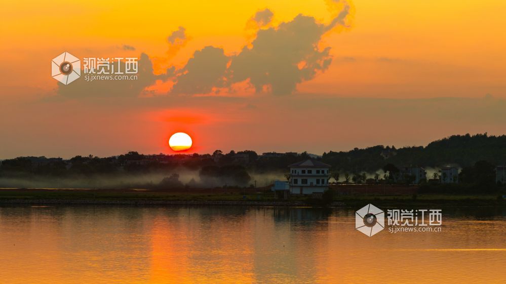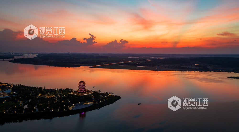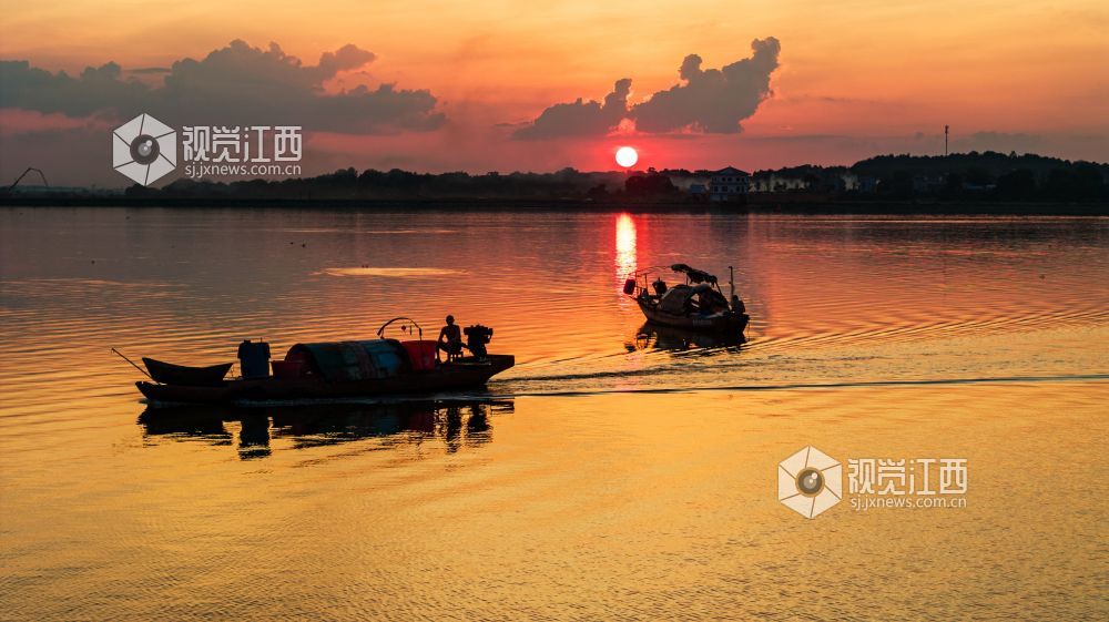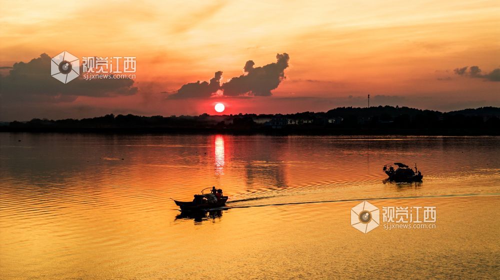 2023年9月20日,江西省吉安市吉水县赣江恩江交汇处,霞光灿烂,将天空和江面映红,天水一色,壮美如画。