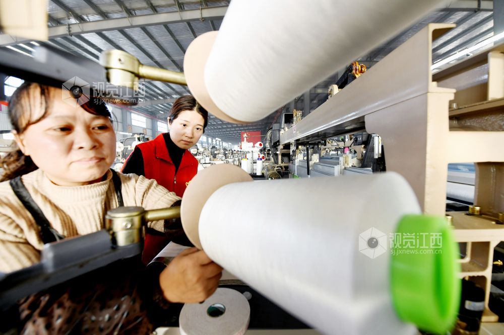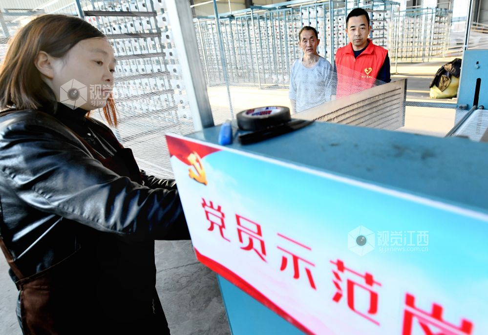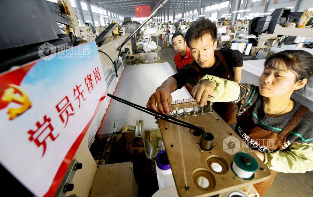 2023年12月9日,在江西省德兴市工业园一纺织企业车间的“党员先锋岗”,一名党员正在指导新来员工正确操作纺织设备。