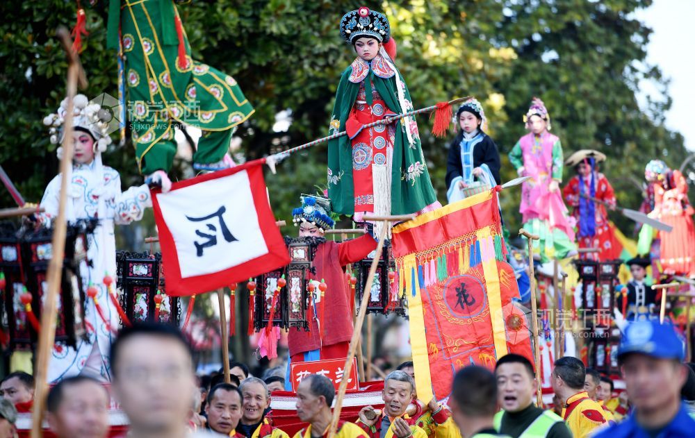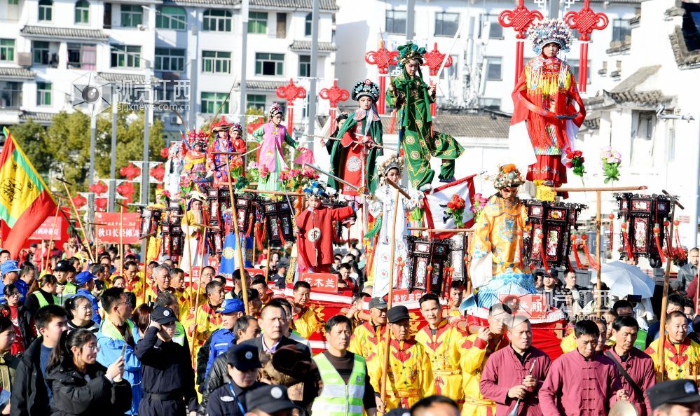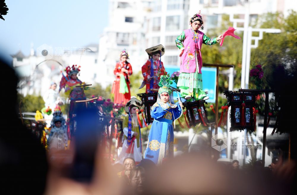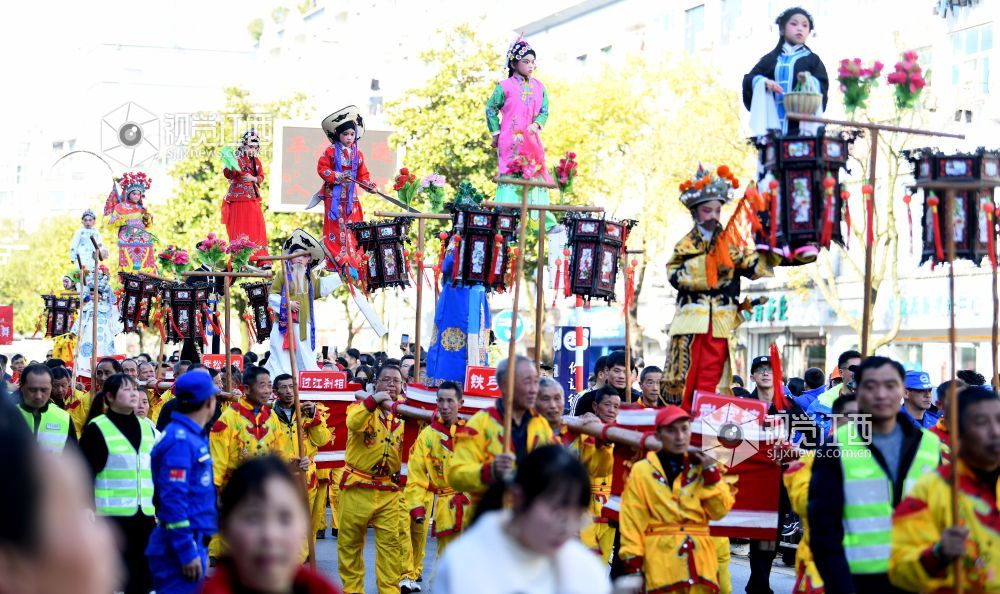 据了解,江西婺源县国家级非遗项目甲路抬阁是当地传统民间绝技,每年春节期间当地都有抬阁走村踩街表演的习俗。抬阁其最为精彩的地方就是位于上盘架分层悬空而立的孩童。孩童们手持道具,或站立或坐着,并通过身穿古装扮演着各种不同的戏剧人物和故事中的角色,由别人抬着游行,巧妙地将支柱隐藏在彩物的间隙中,让人无法分辨出表演者是如何悬空中,不仅传承了非遗绝技,也丰富了节日氛围,深受人们的欢迎。