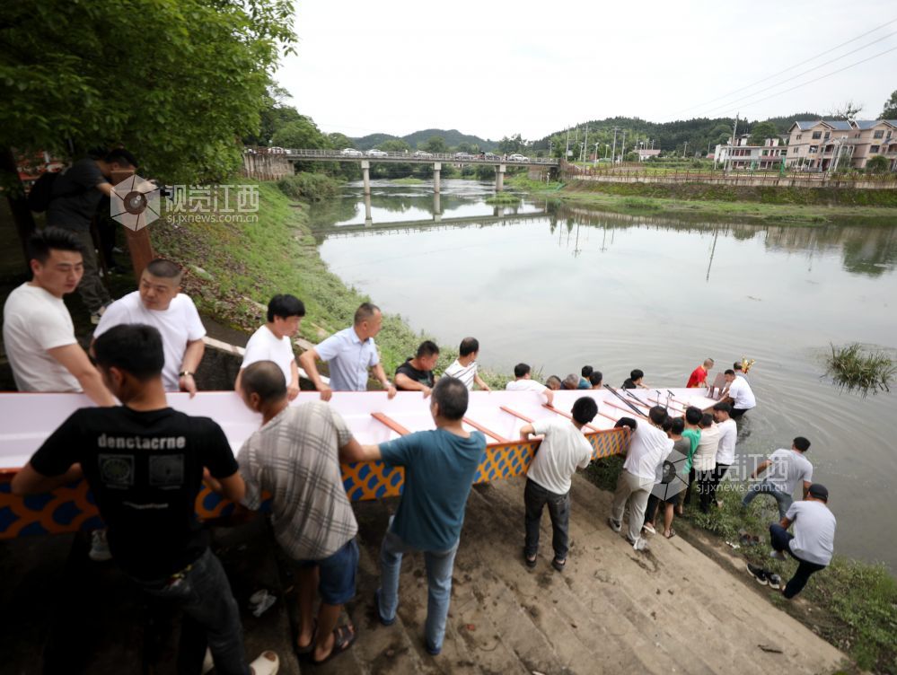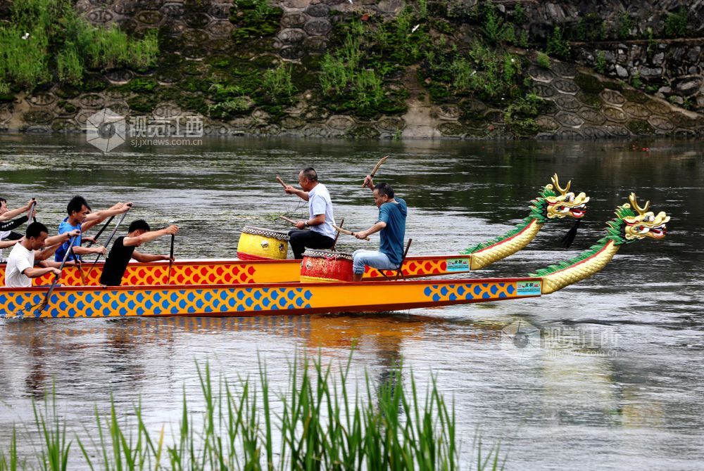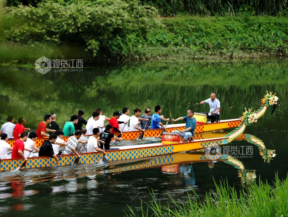 新龙舟在众人齐心协助下完成骏水仪式。随后,鼓手擂响龙舟鼓,两条龙舟齐头并进,在河面上来回巡游。摇曳的龙船、奋进的鼓点与江边美景一起构成美丽的风景线。