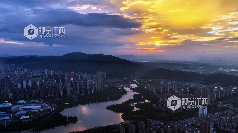 6月11日,航拍夜幕下的江西新余孔目江国家湿地公园、水清、岸绿、景美,在晚霞的映照下,孔目江国家湿地公园分外迷人,如梦如幻,美丽如画。