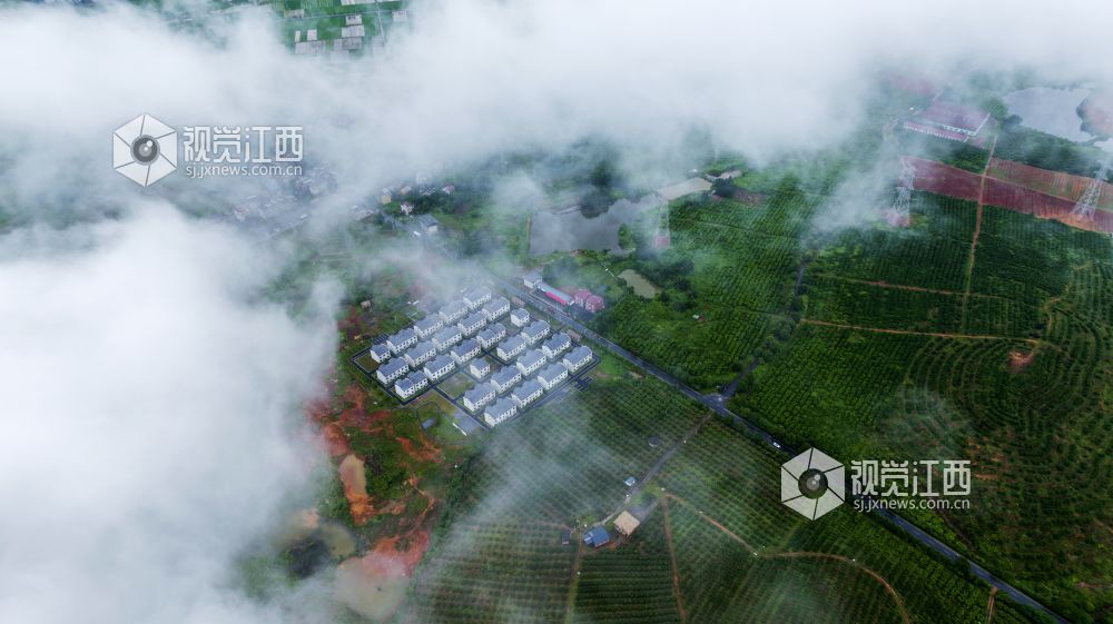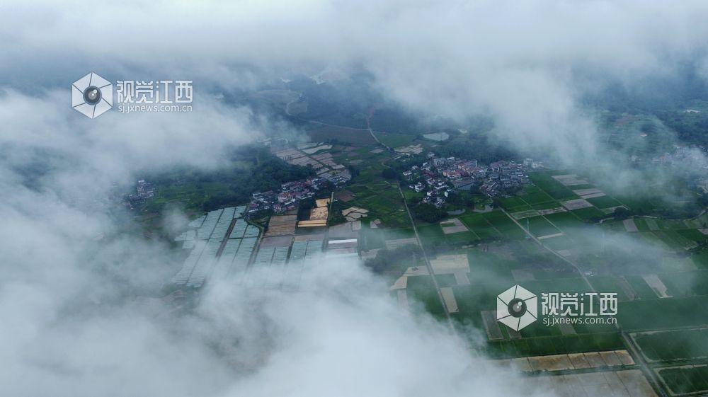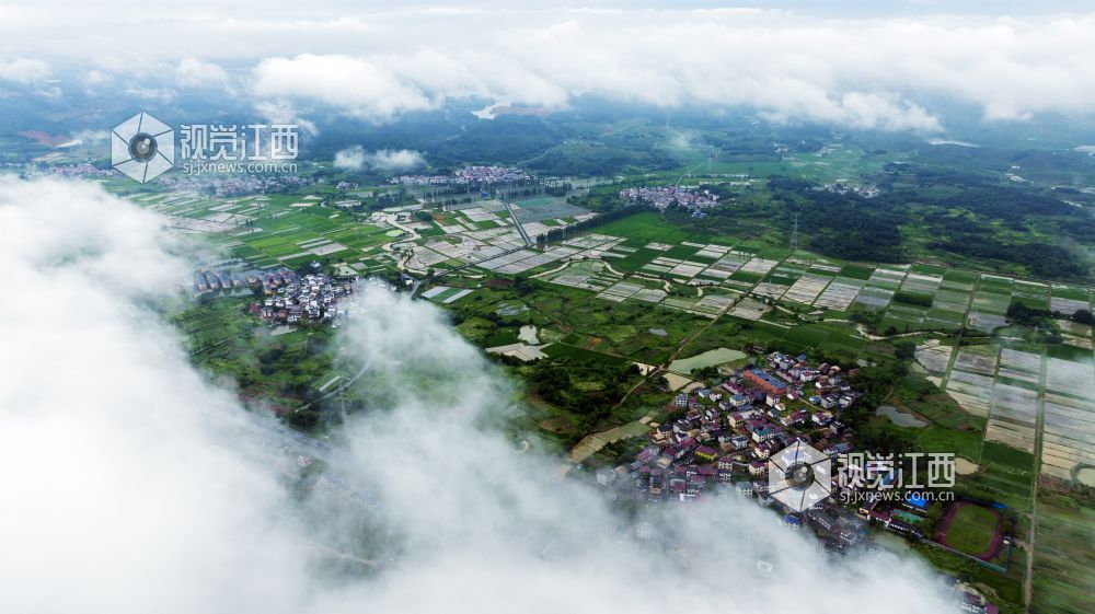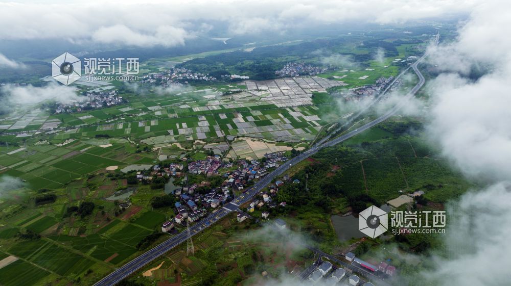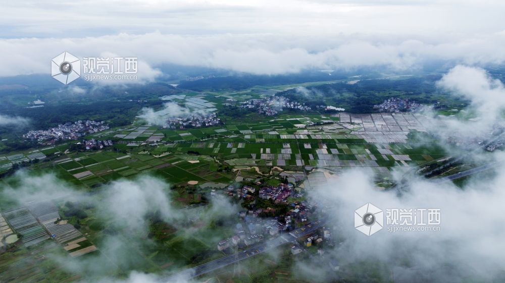6月14日,航拍江西新余渝水区下村镇、人和乡广袤田园雨后云雾缭绕,耕田、村落、山脉、公路若隐若现,夏日乡村风景美如画。
