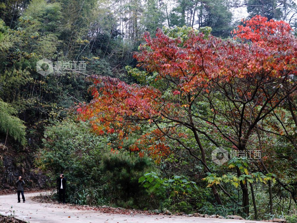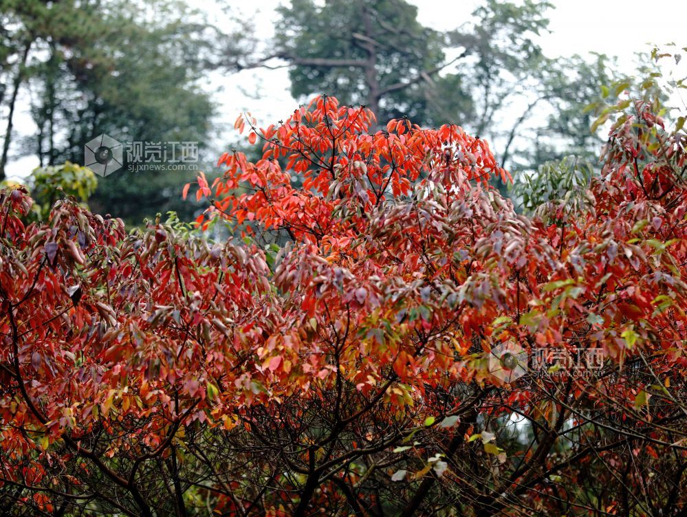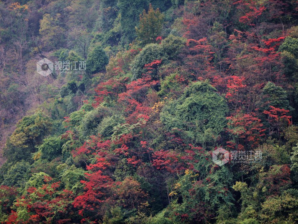 2024年11月24日,初冬时节,在江西省分宜县大岗山,枫树、乌桕、香樟、水杉等树木遍布山野,色彩斑斓,互相映衬,美不胜收。将大岗山装扮一新,宛如一幅彩色画卷。