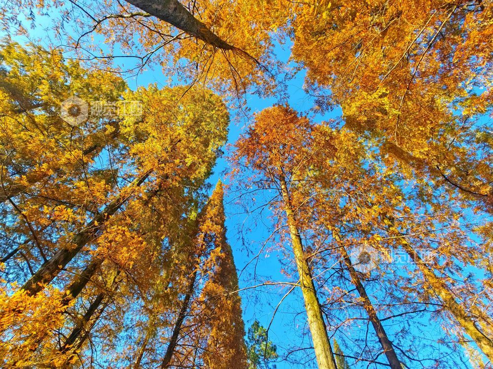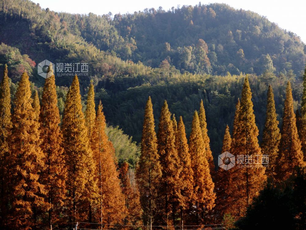 2024年11月27日,位于江西省分宜县大岗山境内的大砻下生态林场,水杉林成排列植、冲天矗立,色彩斑斓,成为初冬时节一道亮丽的风景线。
