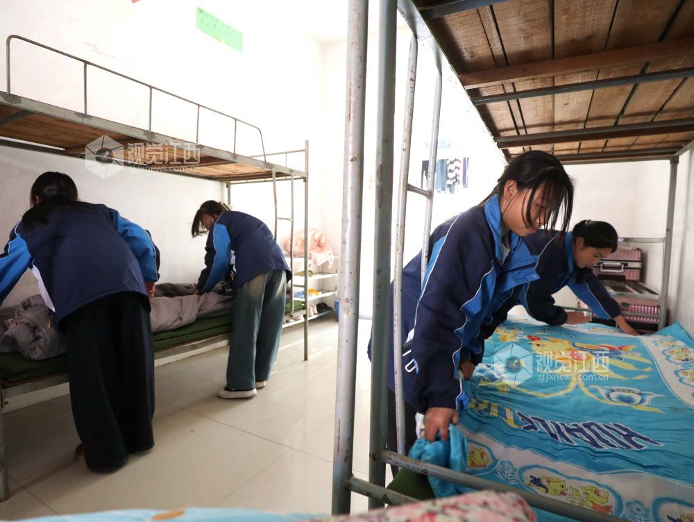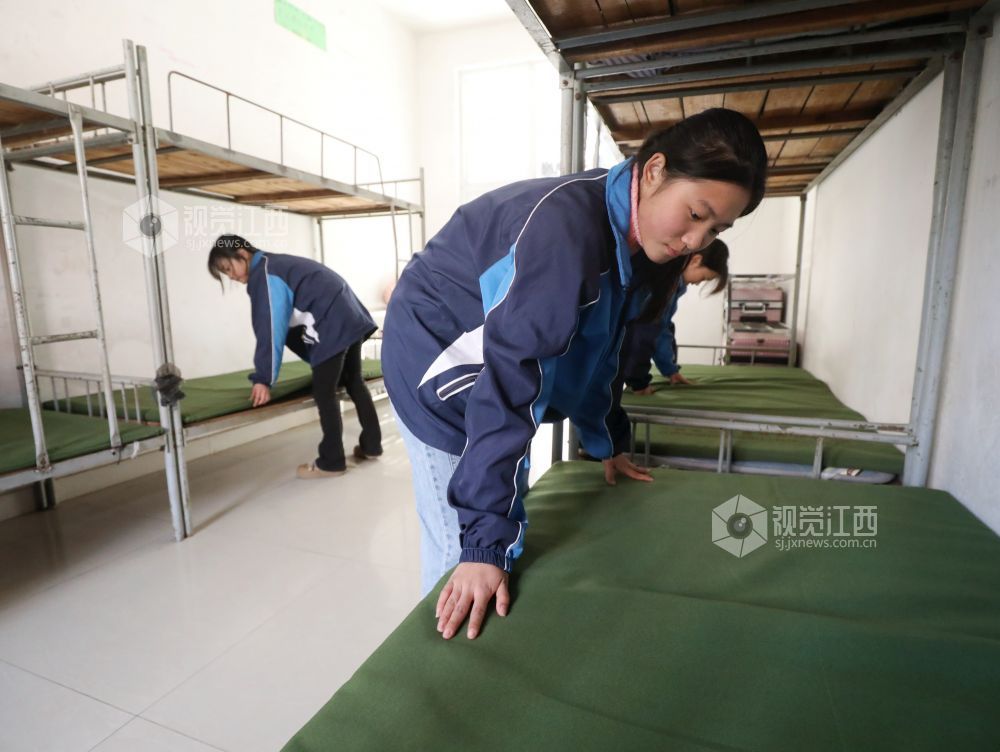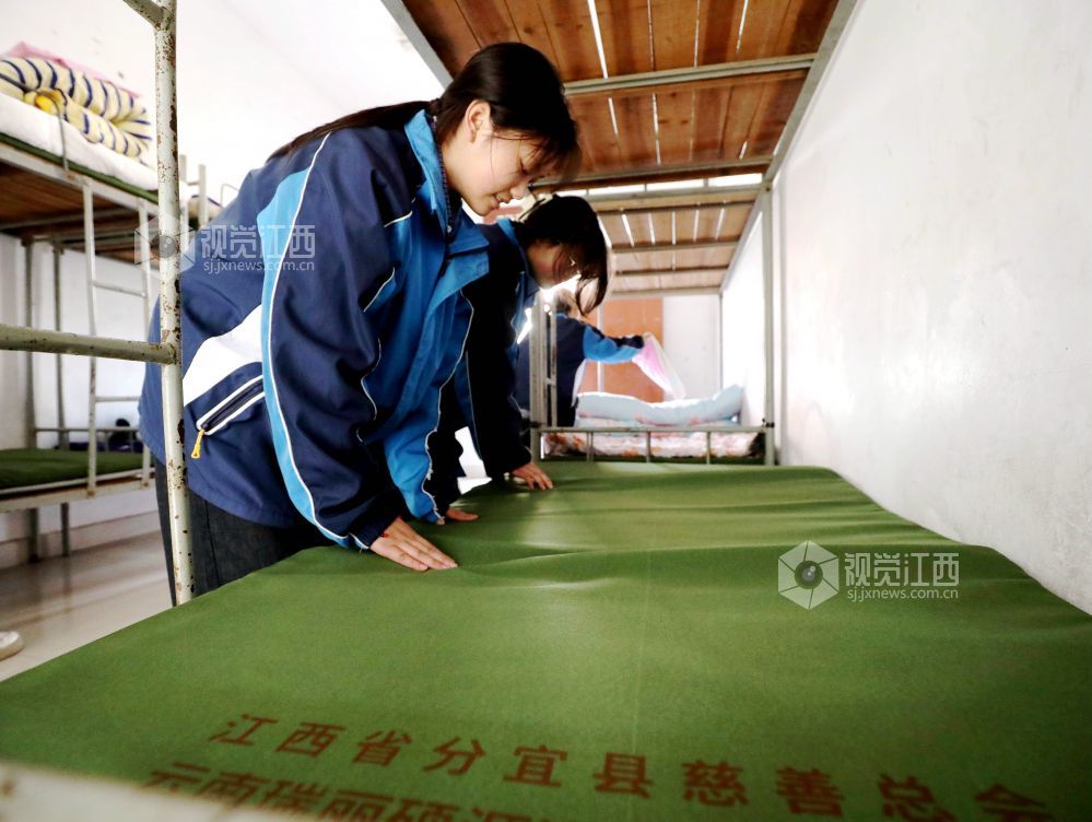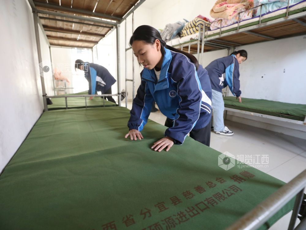 2025年1月3日,江西省分宜县第六中学住宿学生正在寝室铺放爱心床垫。寒冬来临,分宜县慈善总会携手云南瑞丽硕源进出口有限公司走进分宜县第六中学开展“暖冬行动”爱心床垫捐赠活动,为该校捐赠1400床爱心床垫。