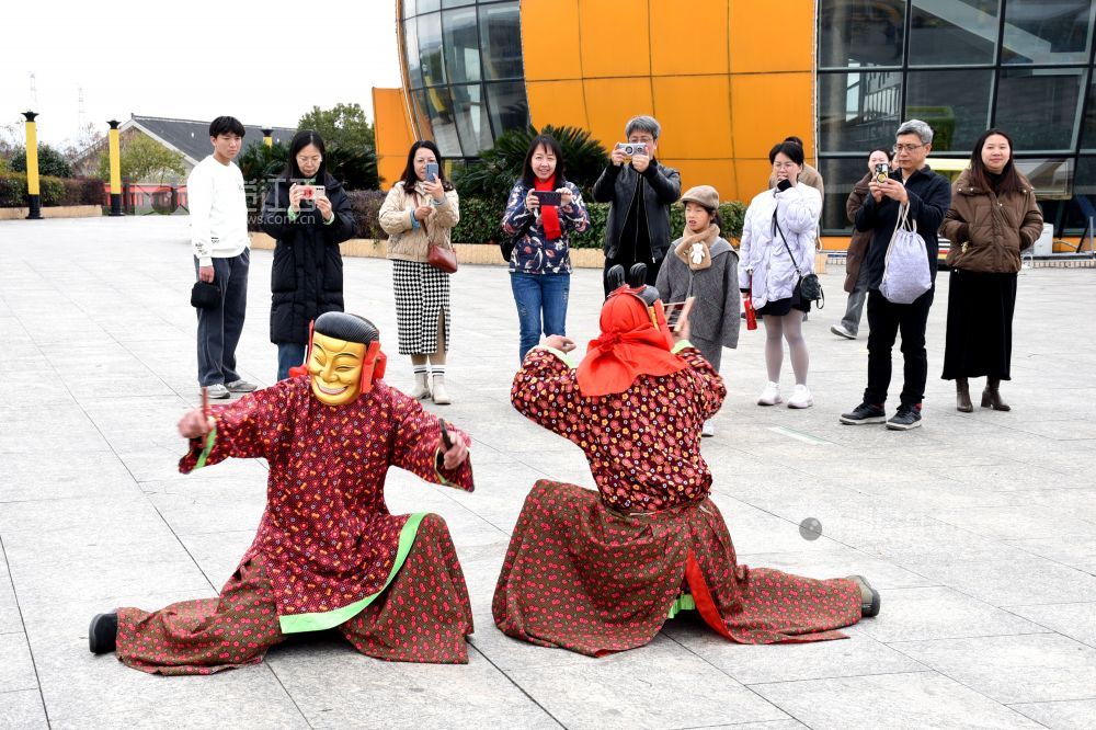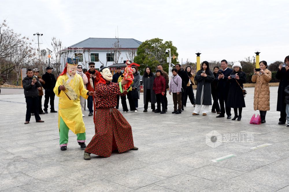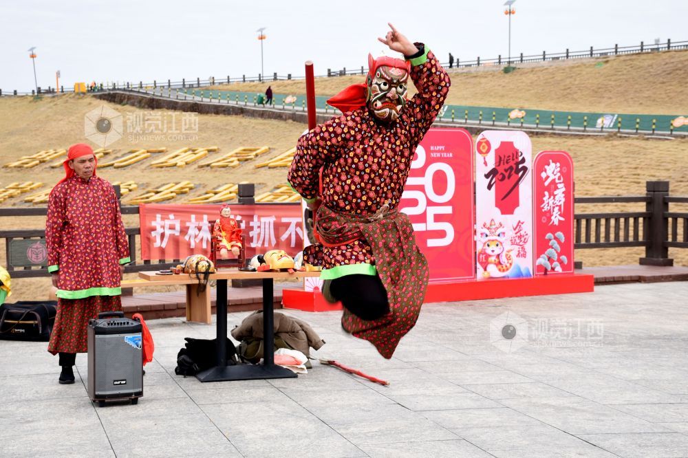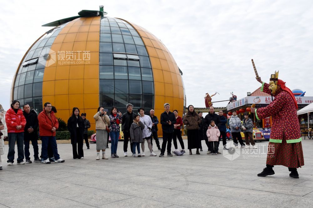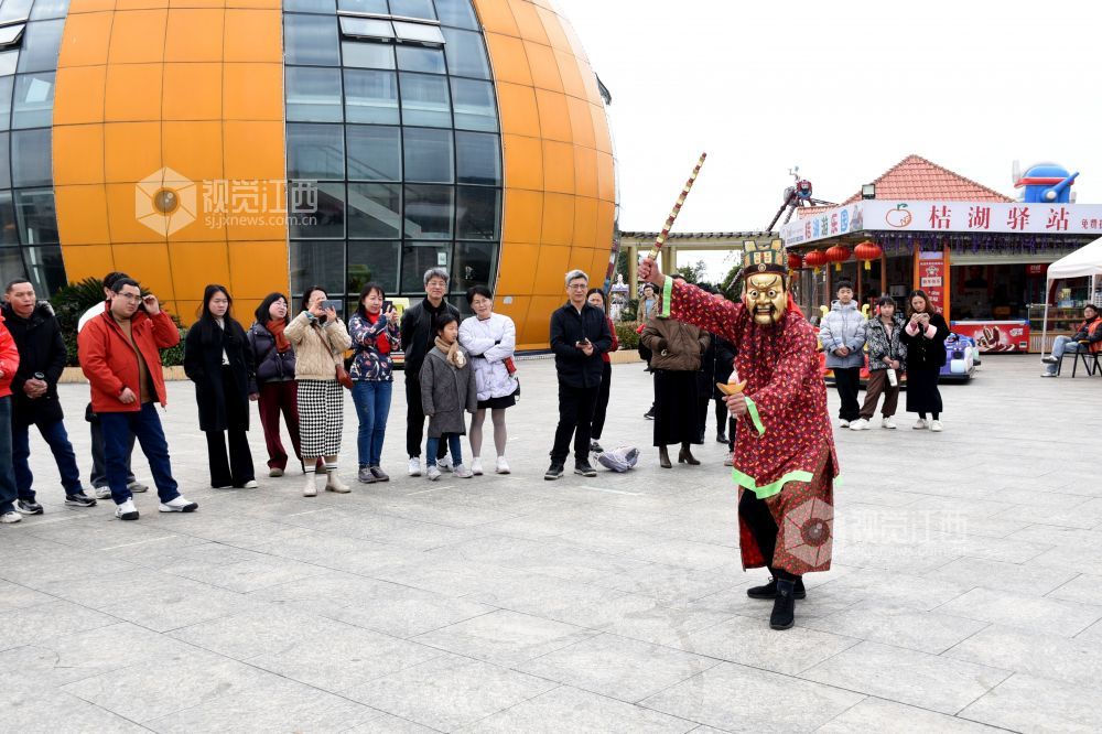 2025年1月30日,在江西省抚州市南丰县蜜桔湖景区橘子餐厅广场,琴城镇水北村和合傩班的傩师们在跳傩,为前来景区旅游的游客们祈福,游客还拿着傩面具拍照留念。