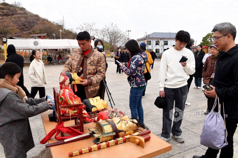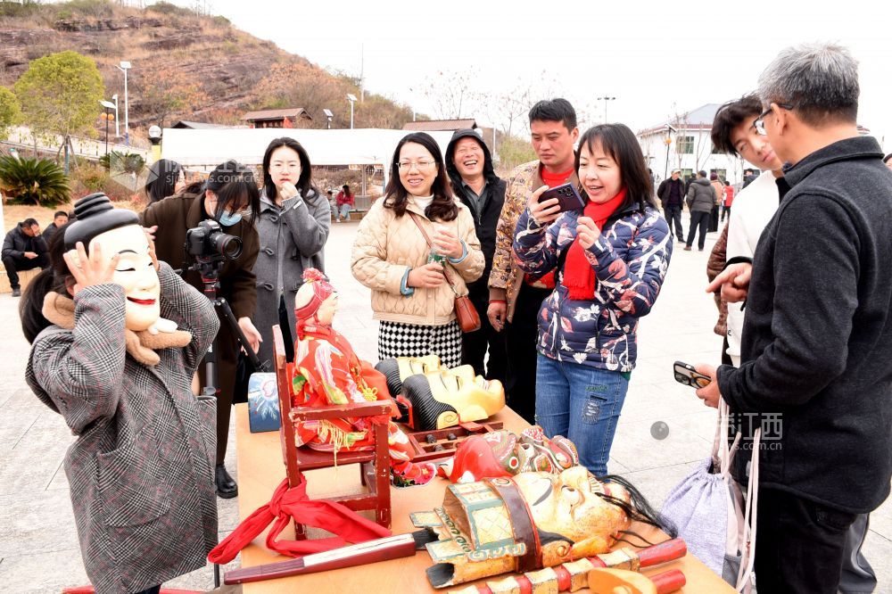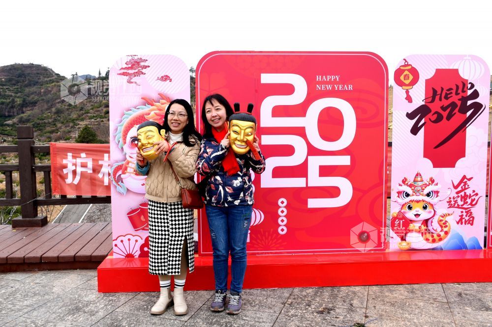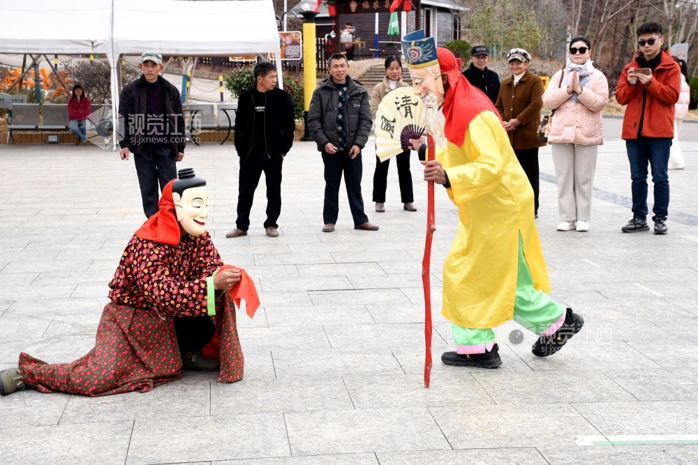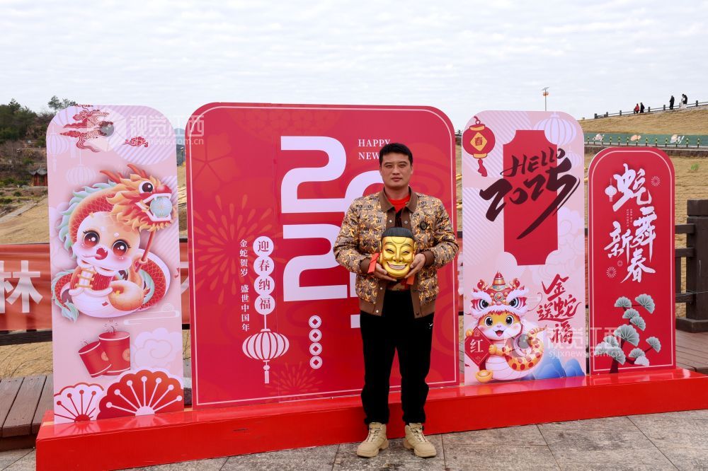 2025年1月30日,在江西省抚州市南丰县蜜桔湖景区橘子餐厅广场,琴城镇水北村和合傩班的傩师们在跳傩,为前来景区旅游的游客们祈福,游客还拿着傩面具拍照留念。
