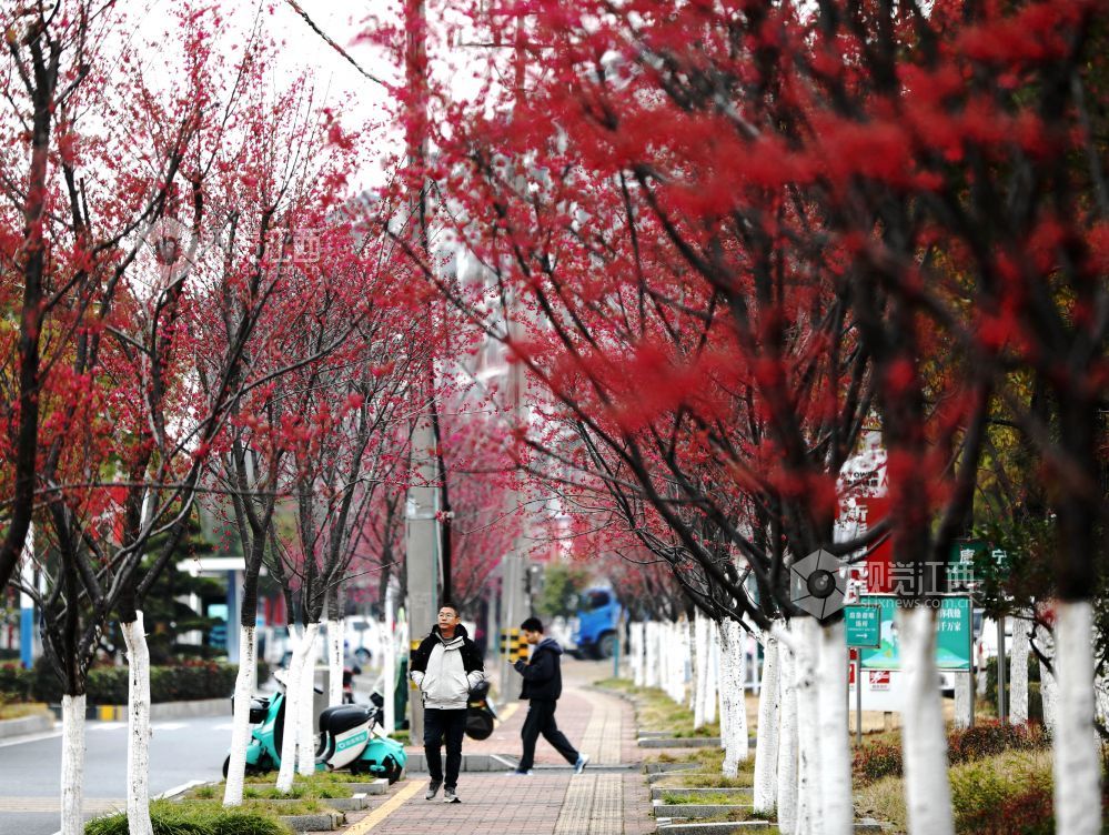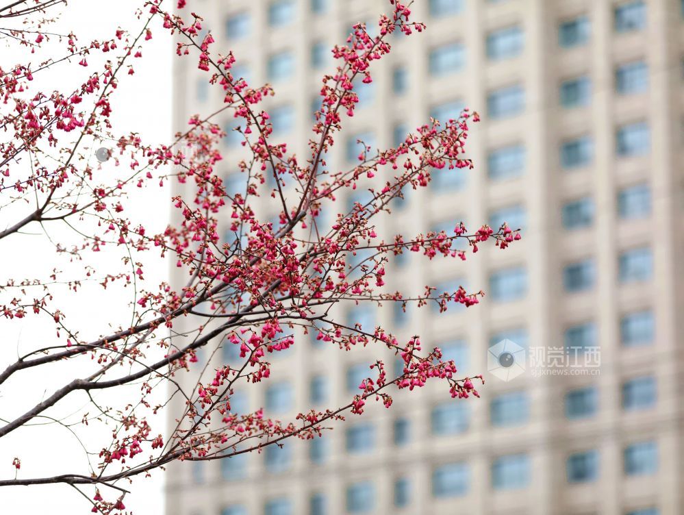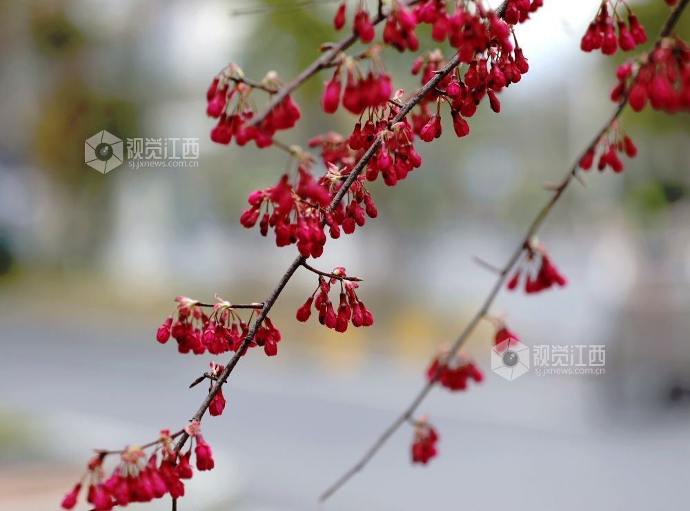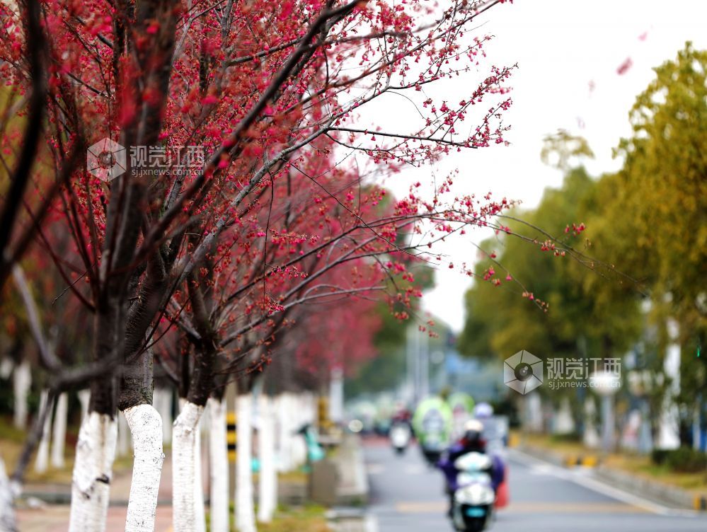 2025年2月18日,江西省分宜县开物大道两旁的钟花樱美丽绽放,春天的气息扑面而来,将县城装扮得多姿多彩。
