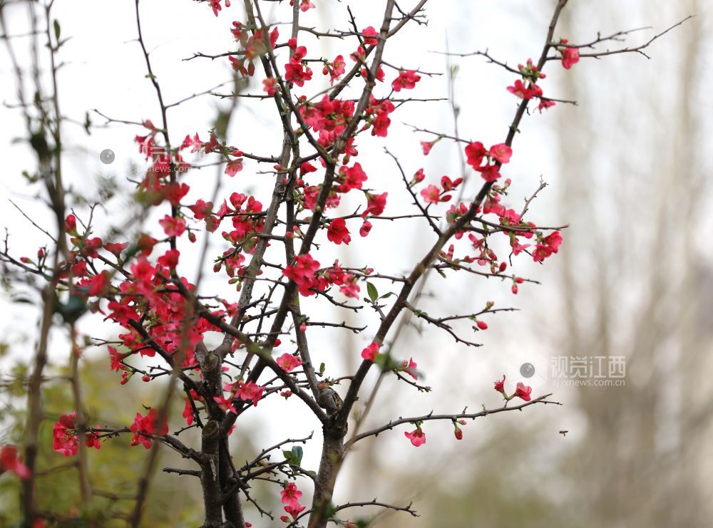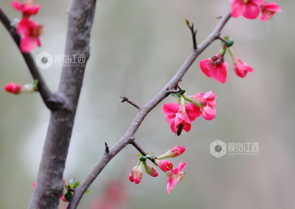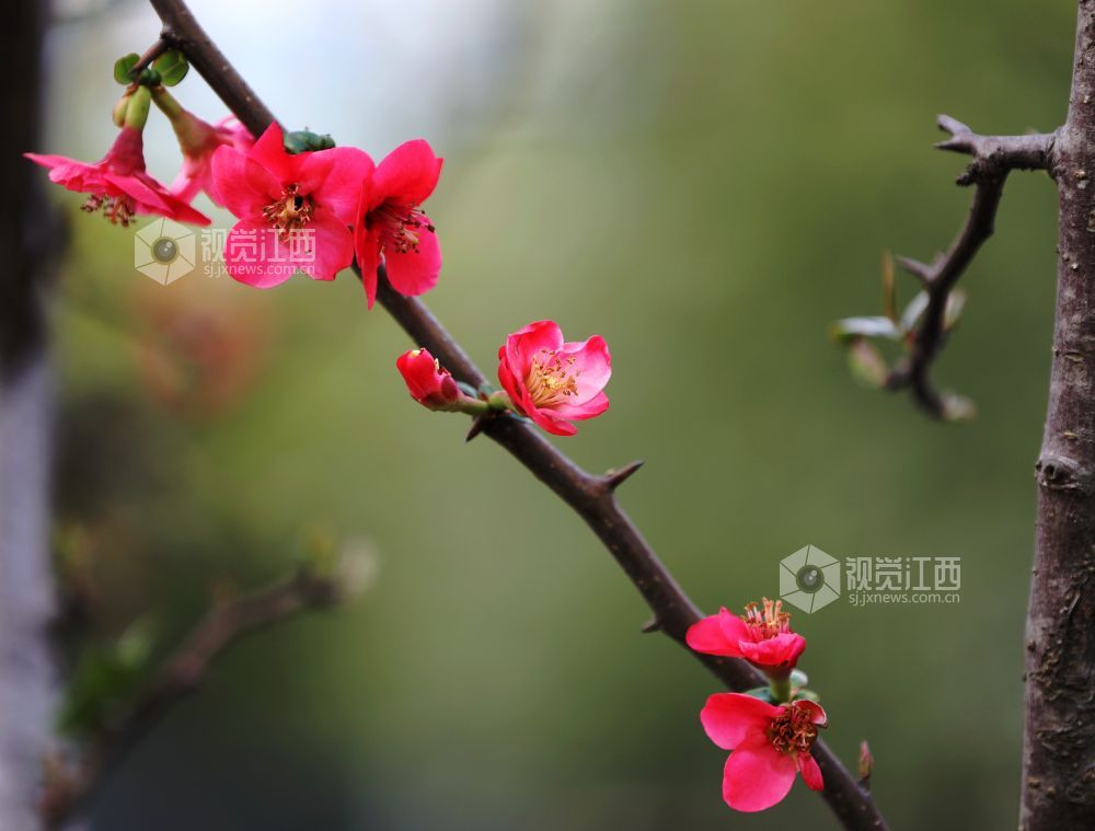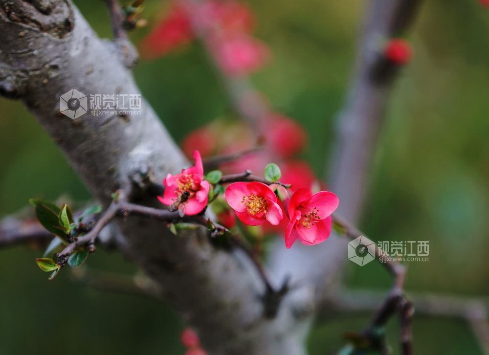 朵朵奇葩贴梗红,新妆锦绮映凌空。2025年3月1日,江西省分宜县钤山湖水生态湿地公园数十株贴梗海棠迎春绽放,红色的花朵傲立枝头,鲜润丰腴,绚烂耀目。连日来,随着气温回升,湿地公园的贴梗海棠陆续绽放,花姿优雅。火红的花瓣,簇拥着淡黄的花蕊,在春日暖阳的照耀下,热情洋溢、分外夺目,勤劳的蜜蜂在花间嬉戏、采蜜,勾勒出一幅美丽的早春图景。据了解,贴梗海棠是蔷薇科植物,因为花朵大多紧紧地贴在枝干上,因此叫作“贴梗海棠”。